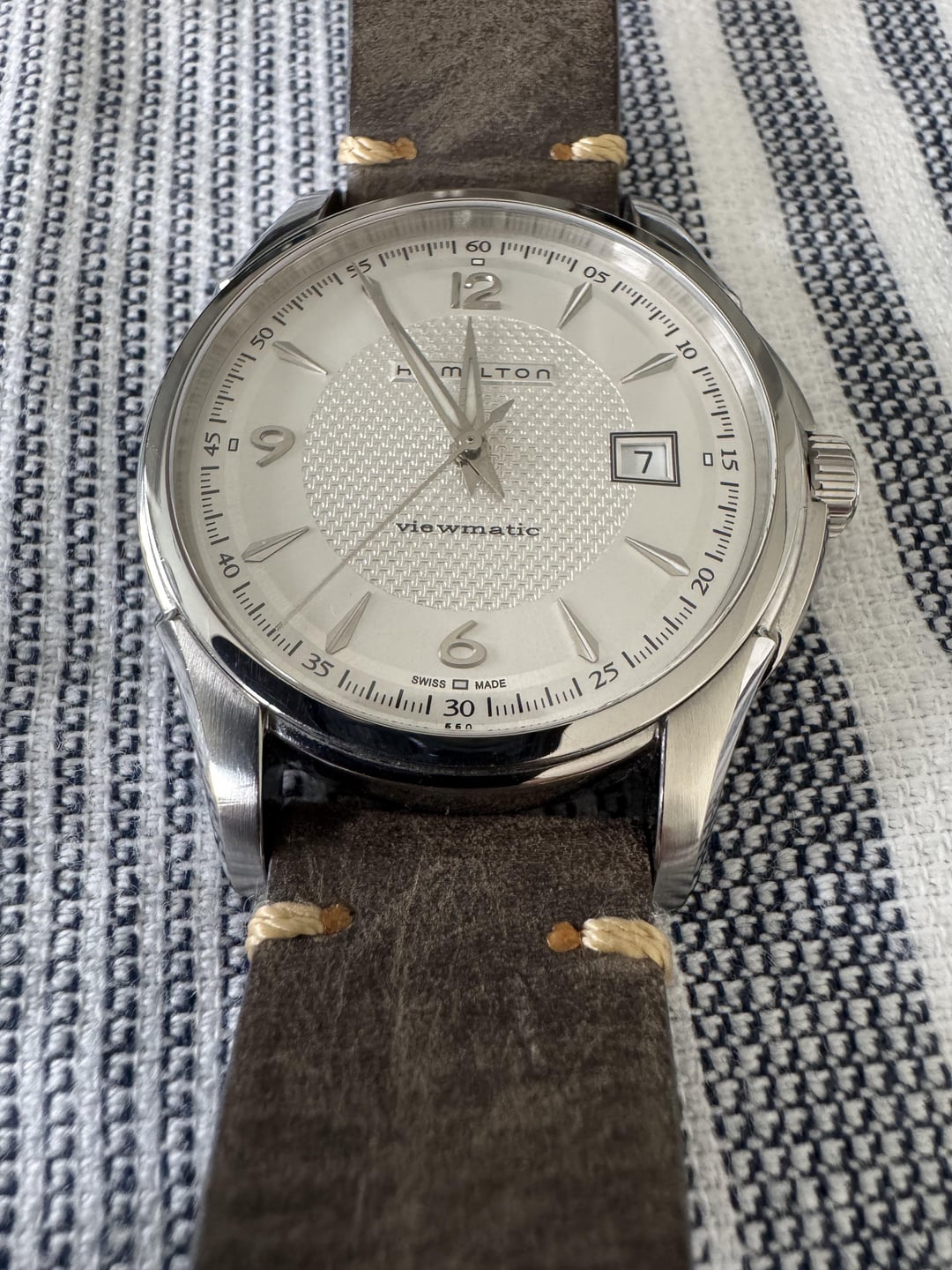 Hi All, I have a very cool and versatile Hamilton Viewmatic. - $299 w/ free shipping to CONUS - Watch only with used leather band - Runs great, no issues observed - Excellent condition, no significant or obvious blemishes - 80 hour power reserve - 40mm case - 10.8mm thick - 20mm lug width - Ref# H32515555 Video of this watch: https://youtube.com/shorts/oWpF2GGYKI4?si=JMSVCz5wZWC6SzLY Additional info as needed: https://www.hamiltonwatch.com/en-us/h32515555-jazzmaster-day-date-auto.html