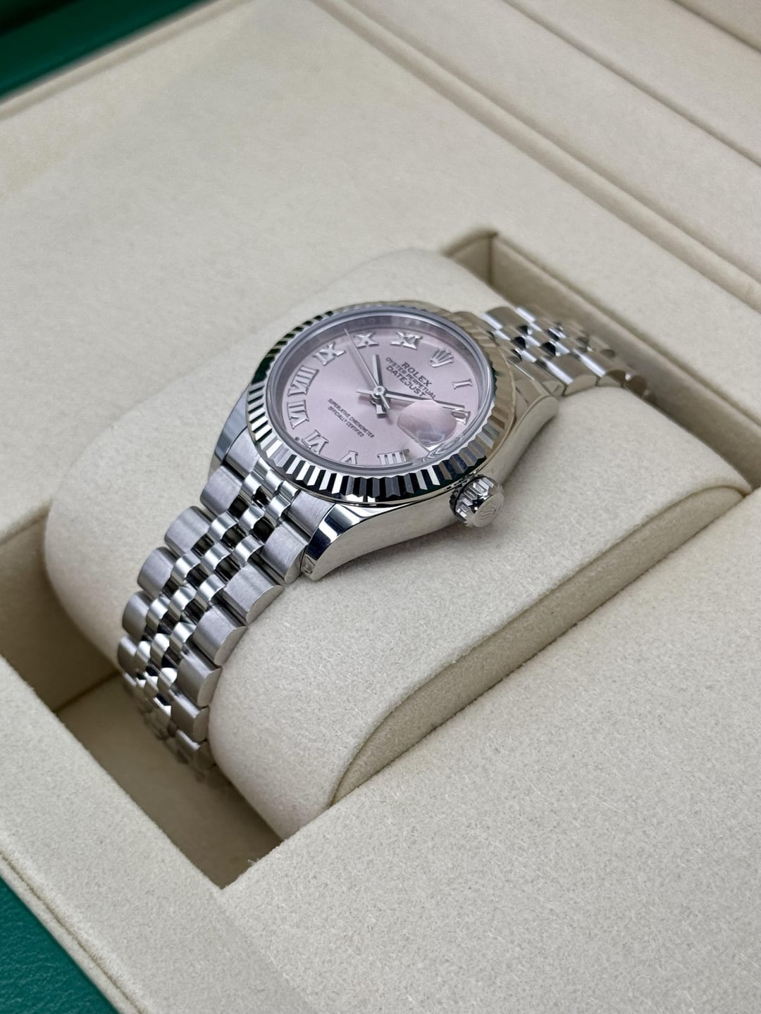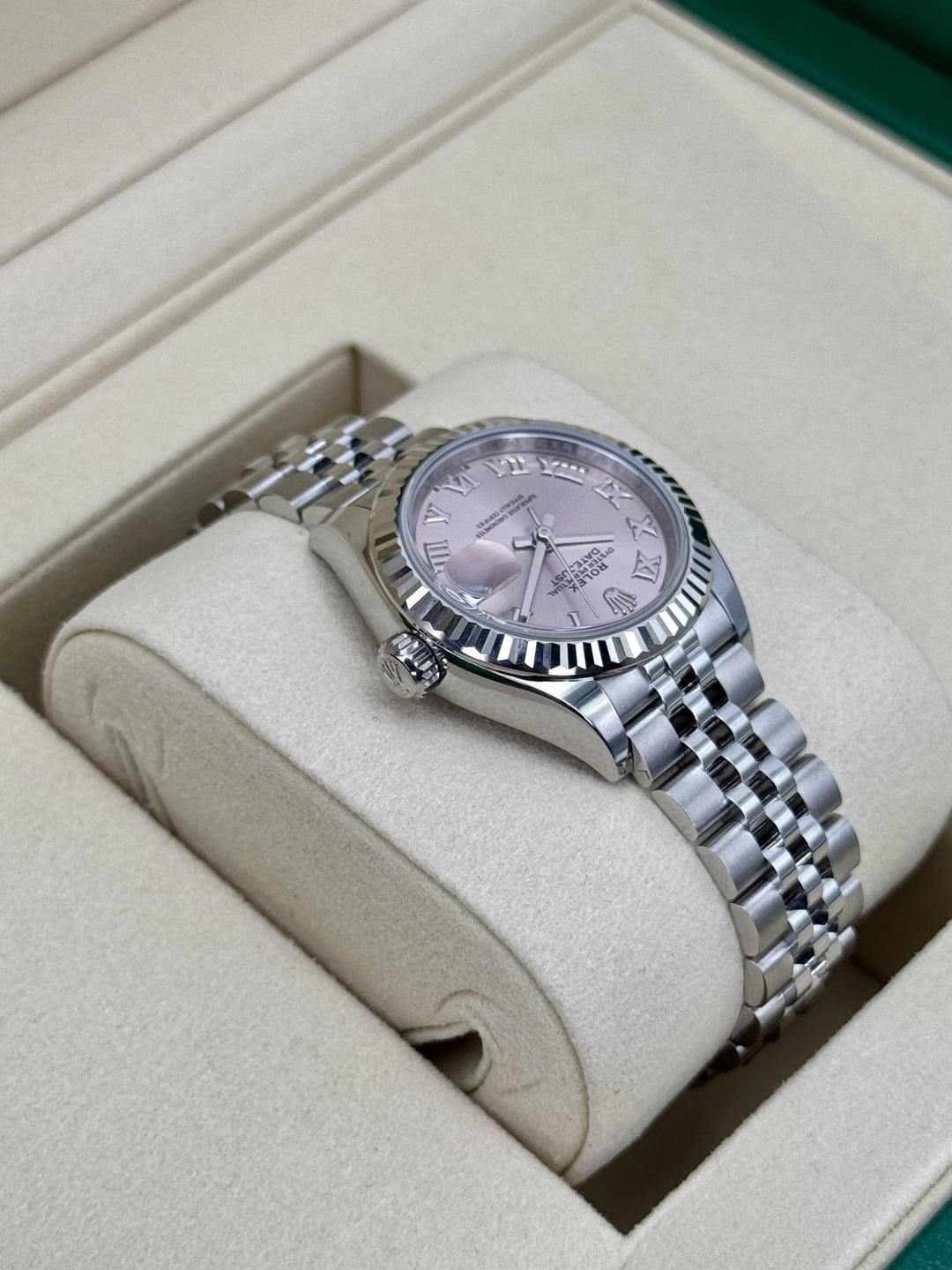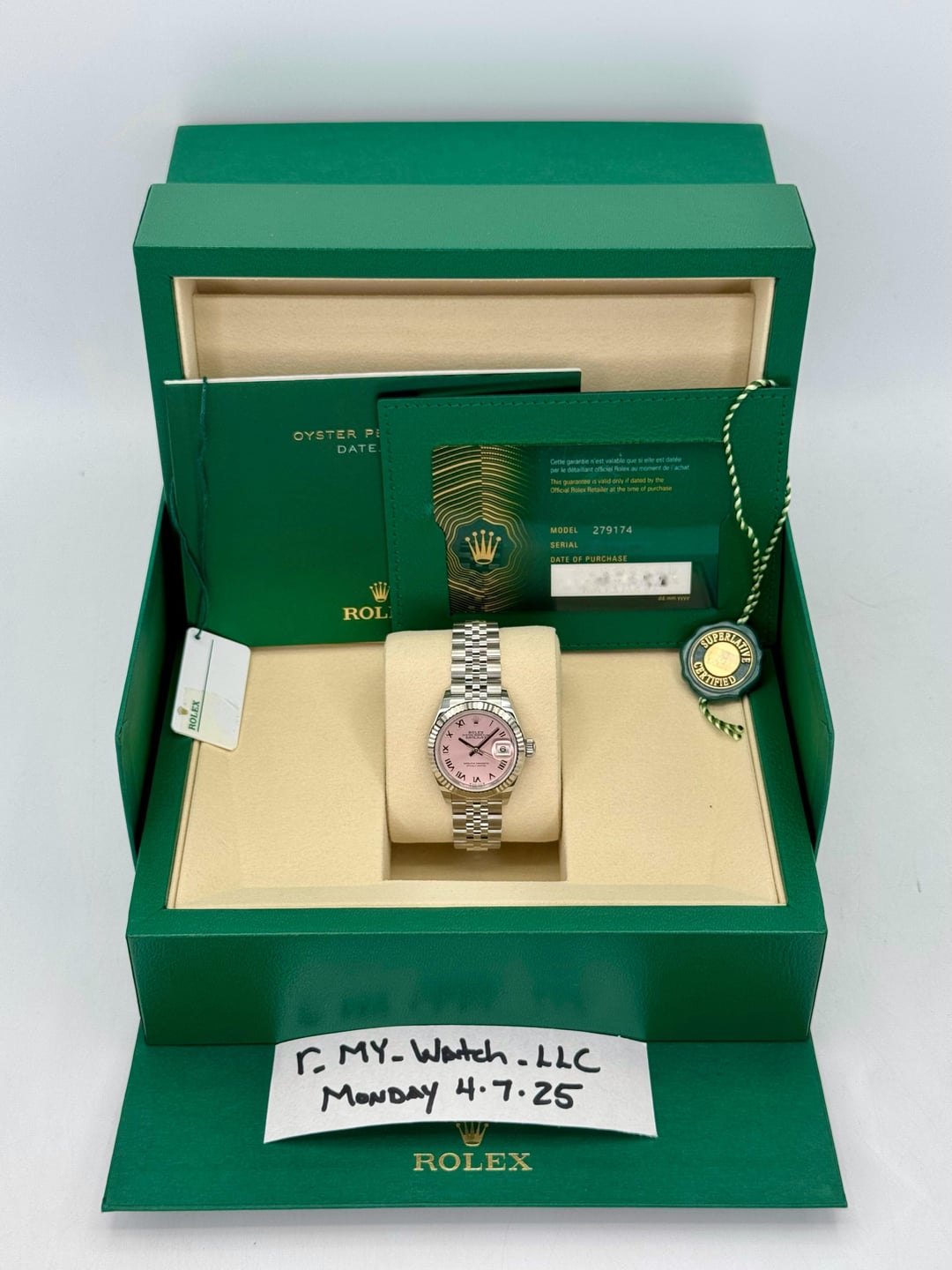 🔵NEW 2025 Rolex Lady Datejust 28mm 279174 Oystersteel 18kt Fluted Bezel Jubilee Bracelet Pink Dial 🔵TRADE or SELL us your luxury watch, all brands considered. Message me details. **Includes the following:** ✔️BRAND NEW 2025 UPDATED ROLEX BOX (DOUBLE BOXED) ✔️Box and Papers - Yes ✔️Warranty card dated 2025 ✔️5 year manufacturer warranty ✔️Manual and Warranty booklets ✔️Green and White Hang Tags included ✔️Material: Stainless Steel ✔️Size: 6.5inch wrist (Full Links) ✔️Watch is BRAND NEW/UNWORN ✔️Trades welcome ✔️Appraisal included Business Name: **My Watch LLC** LOCATION: Oak Park, Michigan ✔️[MyWatchLLC.com](http://mywatchllc.com) for current inventory ✔️Google Business Listing [https://g.co/kgs/Cmd6FPW](https://g.co/kgs/Cmd6FPW) ✔️Business Hours M-F 9-6 ✔️Facetime/Video chat/calls welcome to view the watch interested. ✔️Contact: 248-422-0909 via text or call for quickest response. 🟢TERMS: Visit [MyWatchLLC.Com](http://mywatchllc.com) for payments accepted 🟢REFERENCES/REVIEWS: We are well reviewed on all platforms from google, trust pilot, rolexforums, additionally we have 300+ reference in multiple FaceBook watch groups, reference checks welcome. 🟢SHIPPING: If you are not local, we offer Fully Insured FedEx overnight shipping in the USA for a fee. International shipping available.