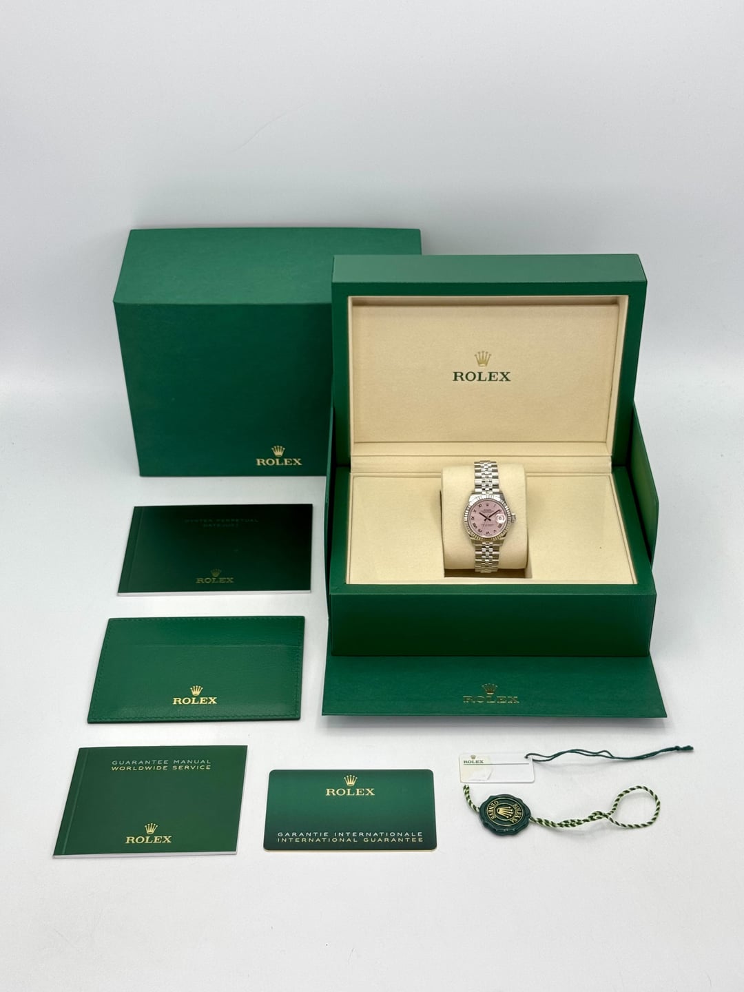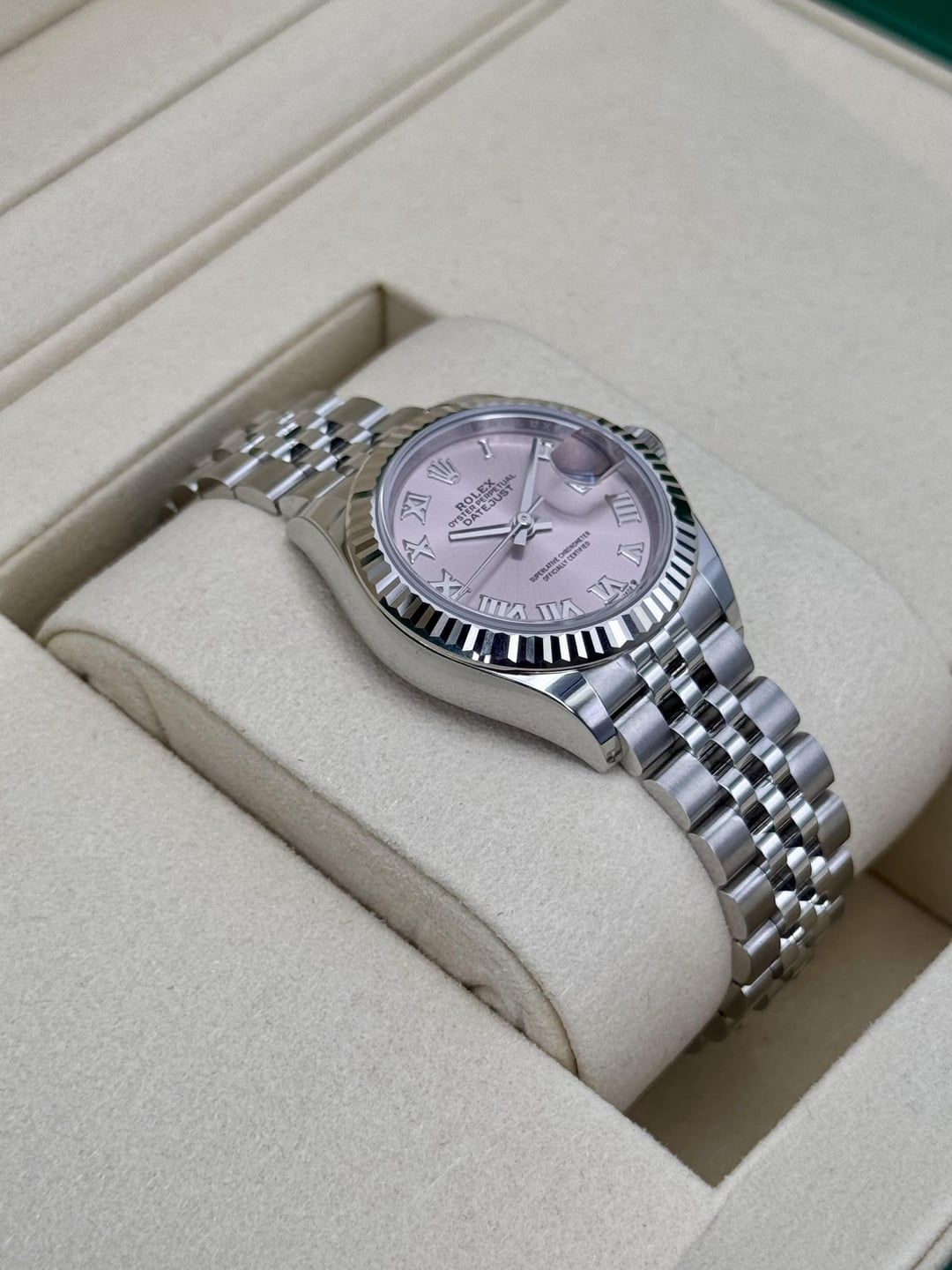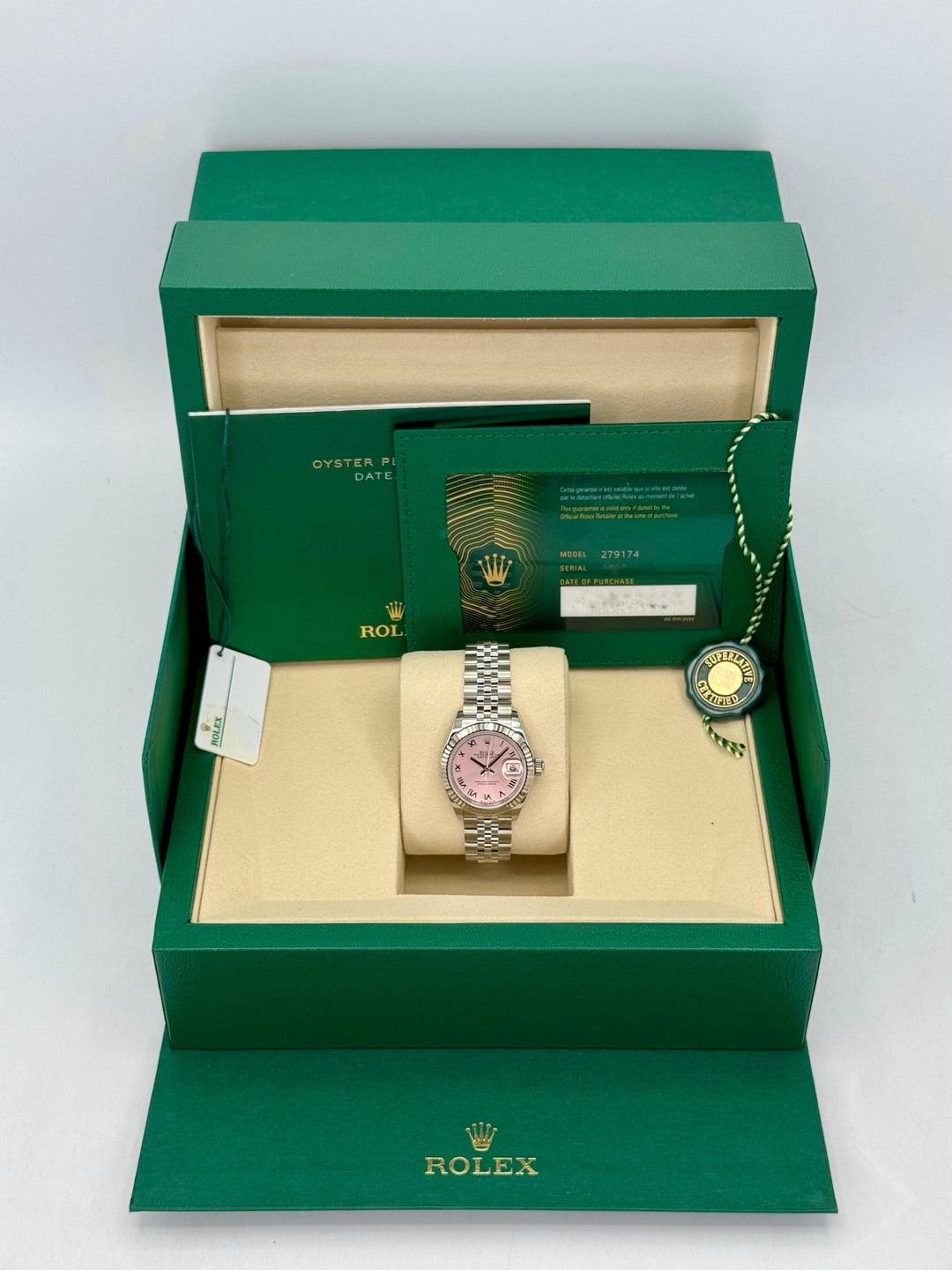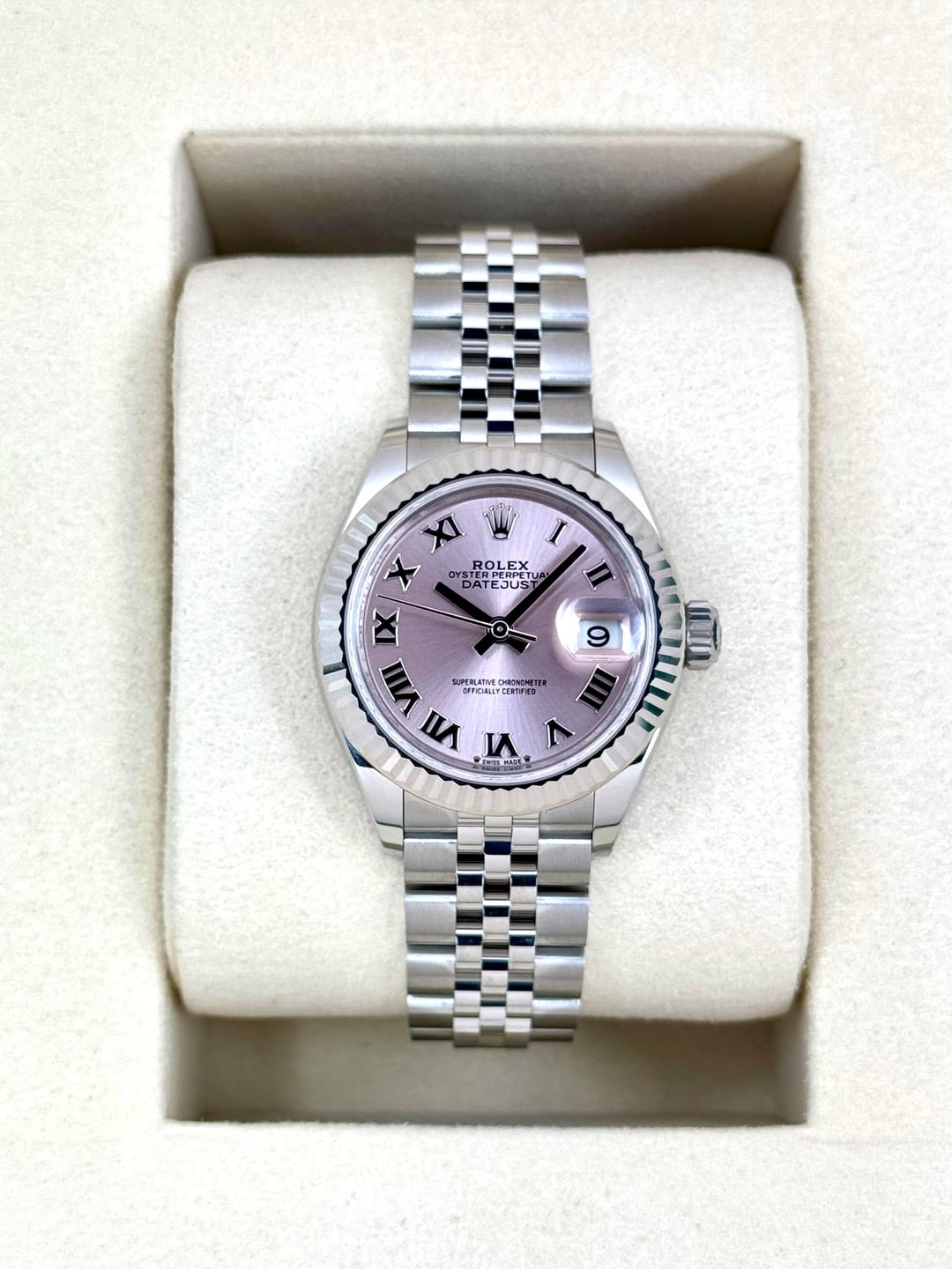 🔵NEW 2025 Rolex Lady Datejust 28mm 279174 Oystersteel 18kt Fluted Bezel Jubilee Bracelet Pink Dial 🔵TRADE or SELL us your luxury watch, all brands considered. Message me details. **Includes the following:** ✔️BRAND NEW 2025 UPDATED ROLEX BOX (DOUBLE BOXED) ✔️Box and Papers - Yes ✔️Warranty card dated 2025 ✔️5 year manufacturer warranty ✔️Manual and Warranty booklets ✔️Green and White Hang Tags included ✔️Material: Stainless Steel ✔️Size: 6.5inch wrist (Full Links) ✔️Watch is BRAND NEW/UNWORN ✔️Trades welcome ✔️Appraisal included Business Name: **My Watch LLC** LOCATION: Oak Park, Michigan ✔️[MyWatchLLC.com](http://mywatchllc.com) for current inventory ✔️Google Business Listing [https://g.co/kgs/Cmd6FPW](https://g.co/kgs/Cmd6FPW) ✔️Business Hours M-F 9-6 ✔️Facetime/Video chat/calls welcome to view the watch interested. ✔️Contact: 248-422-0909 via text or call for quickest response. 🟢TERMS: Visit [MyWatchLLC.Com](http://mywatchllc.com) for payments accepted 🟢REFERENCES/REVIEWS: We are well reviewed on all platforms from google, trust pilot, rolexforums, additionally we have 300+ reference in multiple FaceBook watch groups, reference checks welcome. 🟢SHIPPING: If you are not local, we offer Fully Insured FedEx overnight shipping in the USA for a fee. International shipping available.