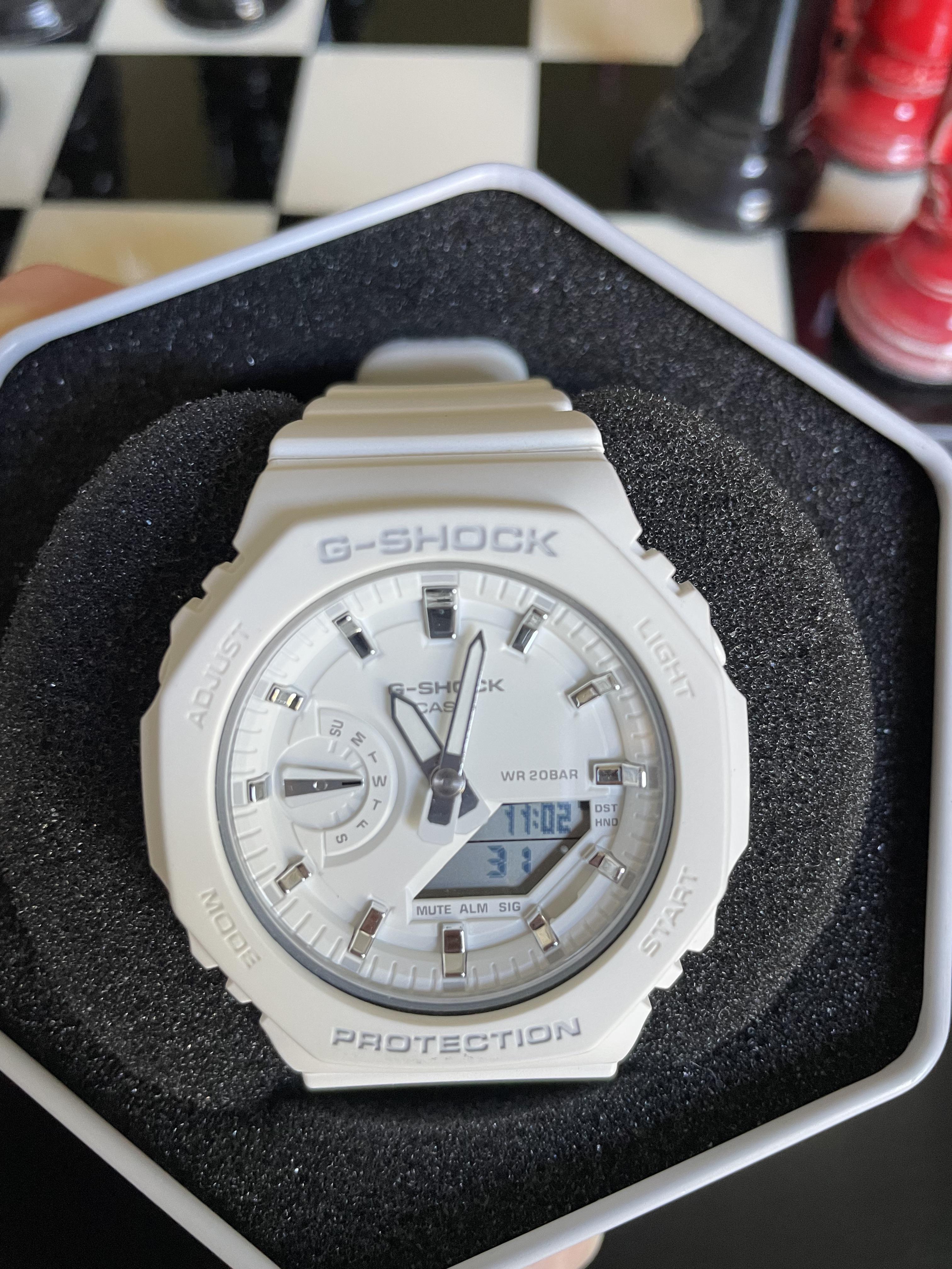 For sale, CasiOak GMAS2100-7A, white mini. This is the smaller one, and in my opinion it wears better. Especially in white, which normally looks larger. The watch comes with boxes, hang tag, booklets, everything you see. Asking $70, including shipping in CONUS. Payment- Zelle, Venmo, PayPal G&S plus fee. Please check out my feedback on Reddit and WUS. Thanks very much for looking. Please feel free to contact me at [email protected] Pictures https://imgur.com/a/3Iygq1E Timestamp https://imgur.com/a/P4Enc1n