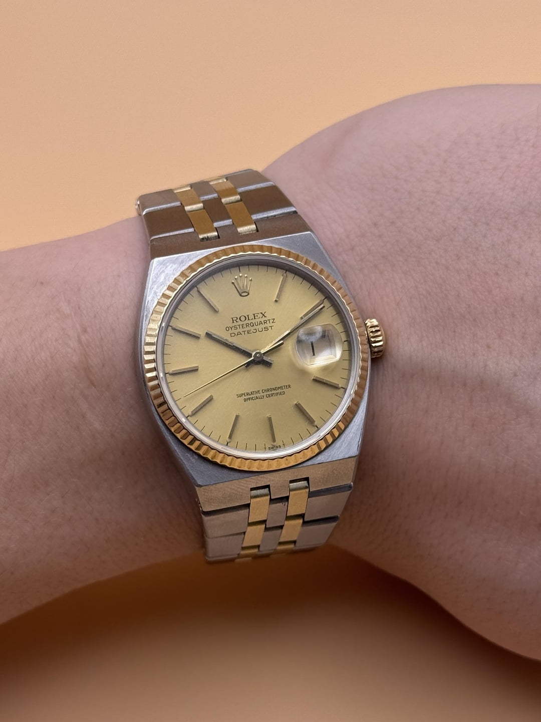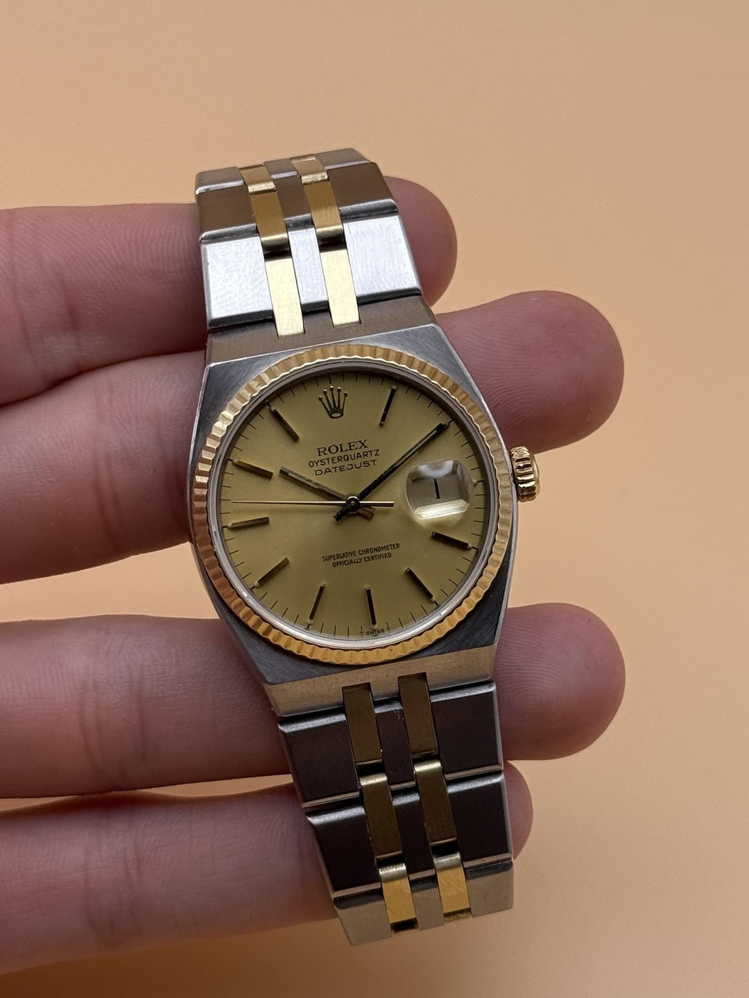 Stunning gem up for grabs—champagne OysterQuartz with wear consistent with its age. The clasp has a small ding, and one link is slightly tighter than the rest. Comes as watch only. Ref: **17013** Price: **$4,100** Dimensions: 36mm Serial: 6.3M (1979-80) Shipping: CONUS only, unless label is provided. Location: US, Iowa Please inspect the photos in their entirety, as they show the accurate and true condition of the piece. Purchase with confidence registered business with the state of IA. Plenty of references locally and from most watch groups happy to run a reference check anywhere! **Find us on I-G: QCTIMEPIECES** TS: [https://imgur.com/a/holFMJj](https://imgur.com/a/holFMJj)