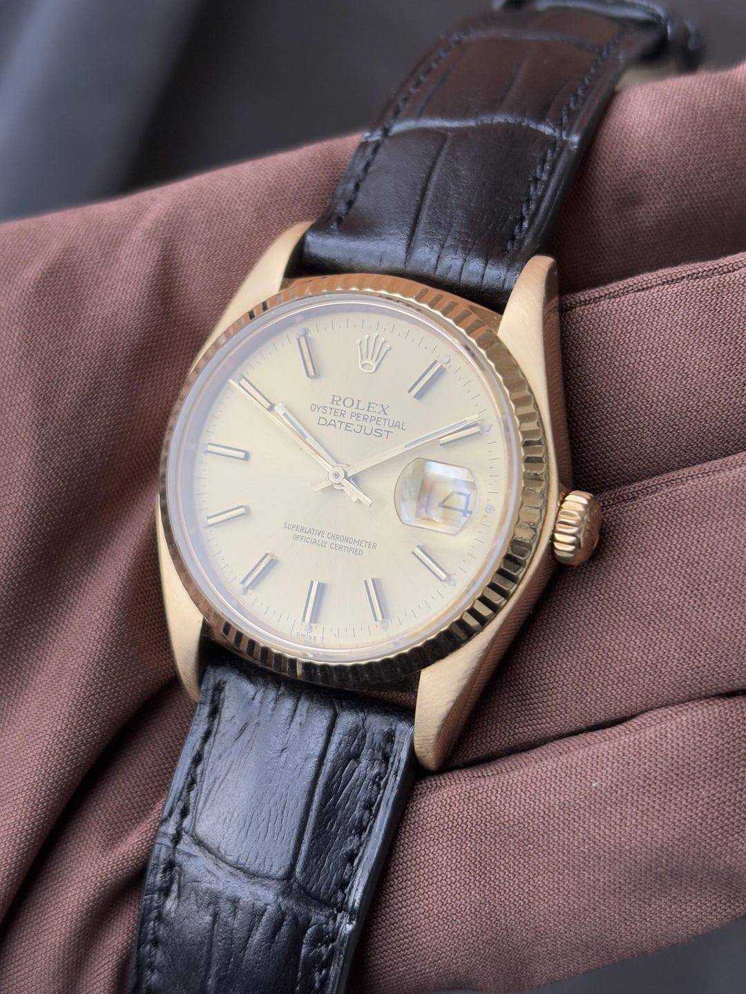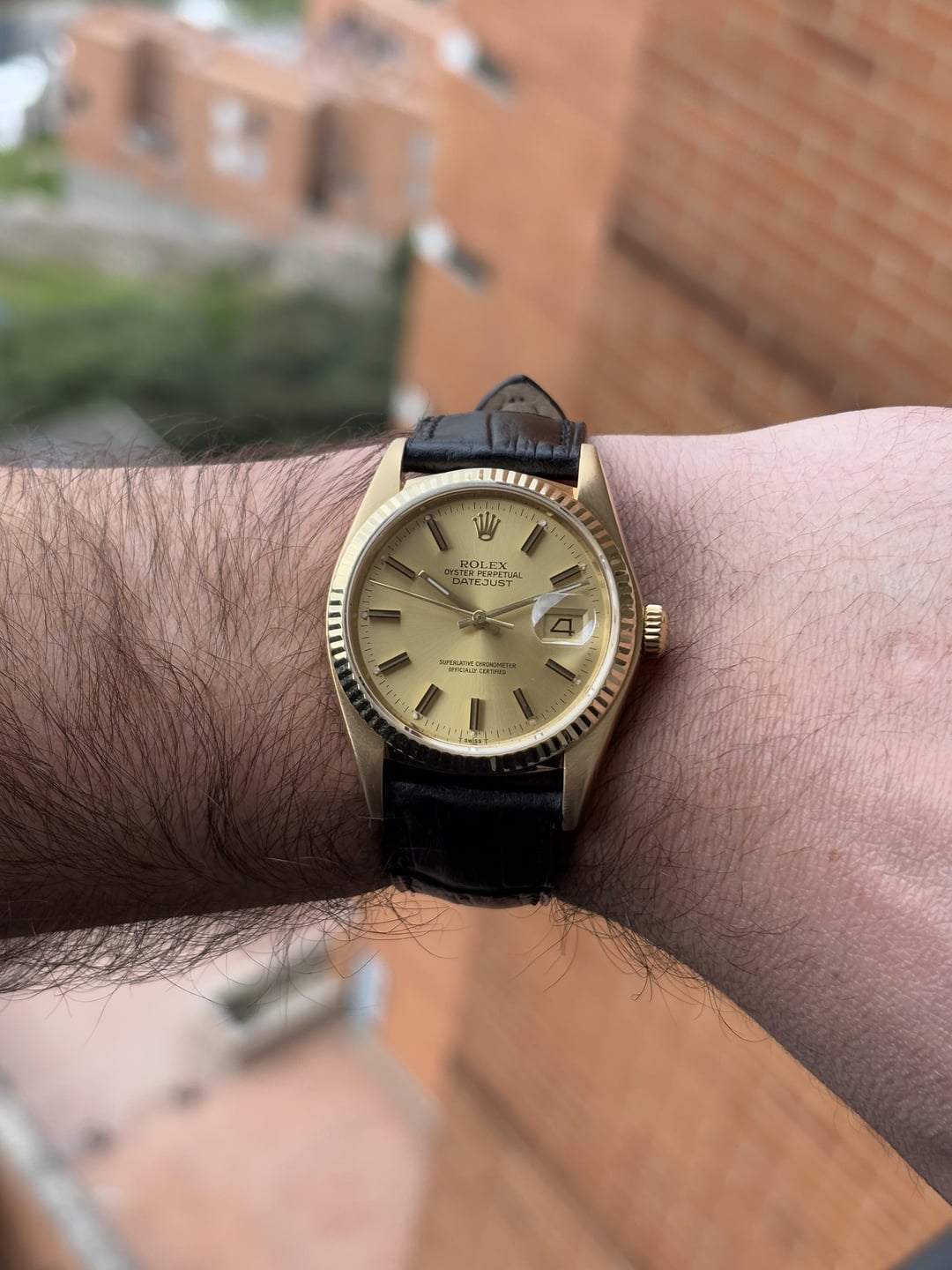 Hello everyone! For sale this Spectacular Rolex Datejust💎‼ Ref. 16018, good working condition, from 1980, 18k gold, 36mm, AM leather strap, OEM gold plated buckle, new crystal, comes as watch only. Price is $7,900‼- Worldwide shipping included through DHL Express, customs are covered by you (Watches shipped to the USA do NOT need to pay import customs, those are covered by me), will ship from Latin America 24hrs after the deposit, takes 3 business days to arrive. Will accept Wire (ACH) or Crypto currency. Follow me on IG: [https://instagram.com/timecollectorcol?igshid=YmMyMTA2M2Y=](https://instagram.com/timecollectorcol?igshid=YmMyMTA2M2Y=) IG: TimeCollectorCol Shoot me a PM if you're interested!