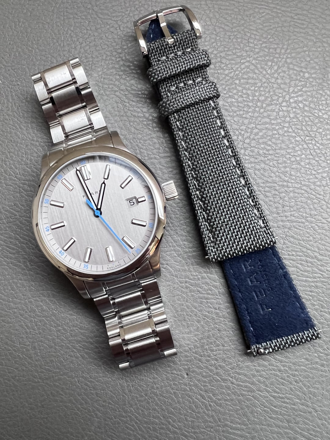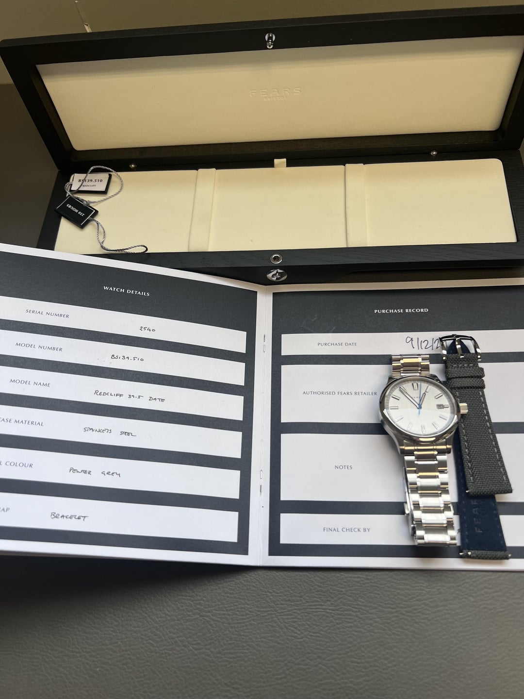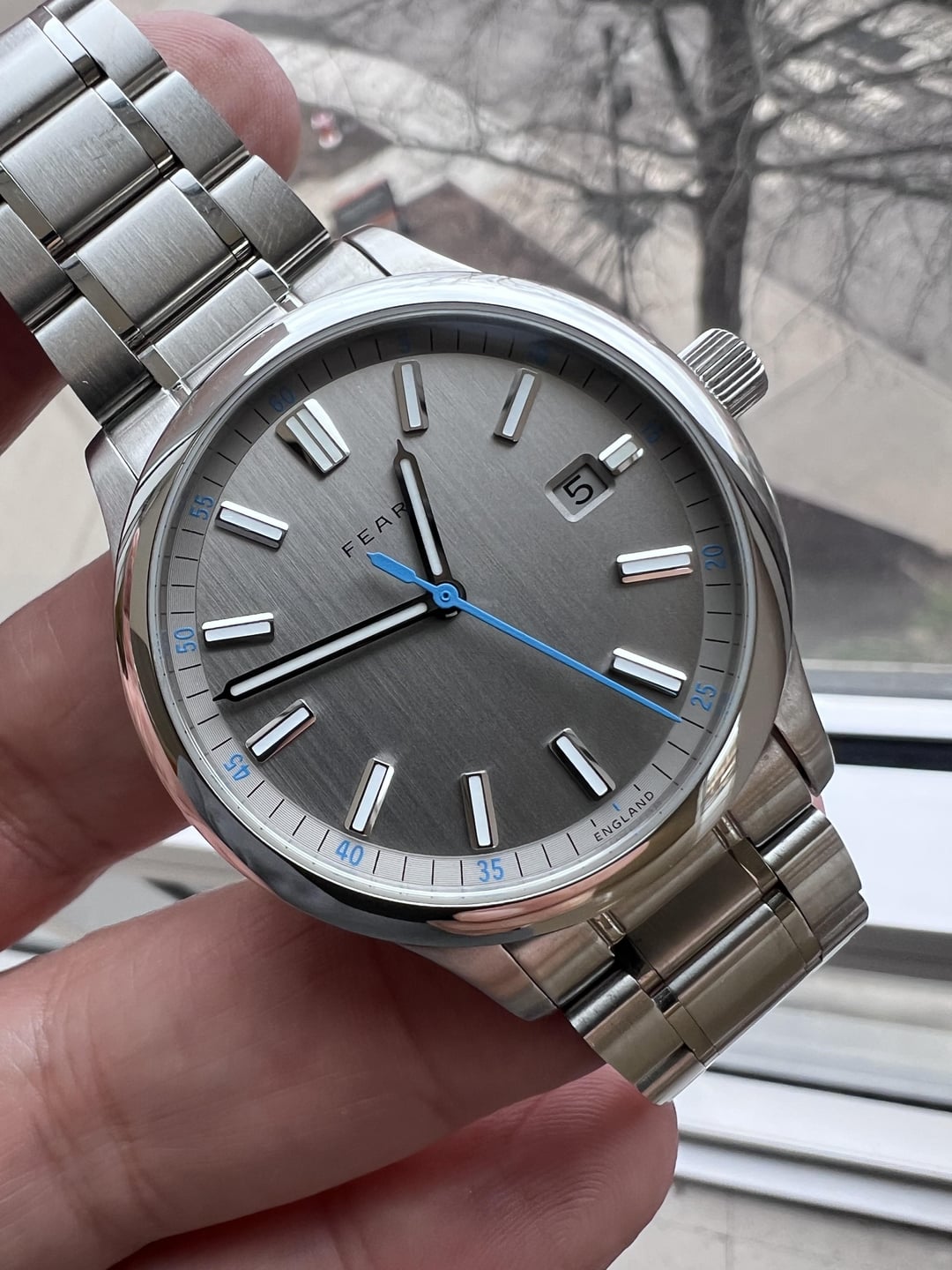 Hey Watchexchange! Up for grabs is my Fears Redcliff Date with the pewter gray dial. Rooted in over 175 years of craftsmanship, Fears was recently relaunched and has mastered the art of subtle sophistication, and this Redcliff is no exception. This dial a true chameleon, shifting from a warm charcoal to a soft, muted silver depending on the light—an exquisite choice for those who admire nuance in dial design. The crisp minute markers combined with applied indices, create an elegant yet highly legible layout, punctuated by the finely framed date window at 3 o’clock. The aquamarine seconds hand really pops too. The movement is a top-grade La Joux-Perret G100 automatic winding, quick-set date finished with Côtes de Genève, Rhodium plating and blued screws. It winds buttery smooth. **Condition:** Overall excellent condition. There are some hairlines on the bezel and some light scratches on the bracelet and clasp. The strap appears unworn. **Scope of delivery:** Full set with hangtags, strap, paperwork, cleaning cloth, and late 2024 card. **Specs:** Case size: 39.5mm Lug-to-lug: 47mm Case thickness: 10mm Water resistance: 150m **Price:** $2500 shipped to your local FedEx Office hold location. **Methods of payment:** Zelle or bank wire **Trades:** Not at this time. **References:** Hundreds of successful transactions in watch trading. See my eBay account under the same name. Many references in Facebook groups, watch forums, and on WUS. **Timestamp:** https://imgur.com/a/yXEieKk **Photo album:** https://imgur.com/a/K51v2Iv