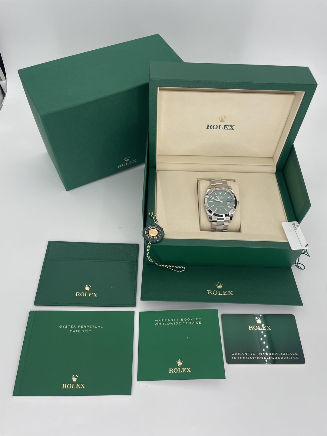 \[WTS\] **2025 Rolex Datejust 41mm Stainless Steel Mint Green 126300 BOXES/PAPERS!** **Location**: U.S.A. / South Carolina **Condition**: This beautiful timepiece is brand new and comes complete with the outer white sleeve, outer green box, inner green wave box, instruction manuals, both hangtags, all links and the warrant card (dated in April 2025). The watch is in brand new condition and was not sized at the time of purchase. Everything Is functioning as it should. The crystal is clean with no nicks or scratches. Do not miss your chance to own this classic timepiece. Serial numbers and names are blurred in photos only for privacy reasons. We are happy to answer all questions about the watch. Just reach out to us via messages. **Price: $10,500** **Payment Method: Bank Wire Transfer** **Shipping:** I ship fully insured Fedex overnight after clearing of the wire transfer. International buyers please reach out and we can discuss options. **Details** Reference Number: 126300-0019 * • Bezel: Fixed Smooth Stainless Steel * • Band: Stainless Steel foldover clasp * • Case: Stainless Steel * • Case Diameter: 41mm * • Movement: Automatic * • Crystal: Sapphire * • Dial Color: Mint Green * • Functions: Hours, Minutes, Seconds, Date * • Water Resistance: 100 Meters * • Power Reserve: 70 Hours * • Year: 2025 Pictures:[https://imgur.com/a/s1SudDN](https://imgur.com/a/s1SudDN) Timestamp: [https://imgur.com/a/eqdVGVf](https://imgur.com/a/eqdVGVf)