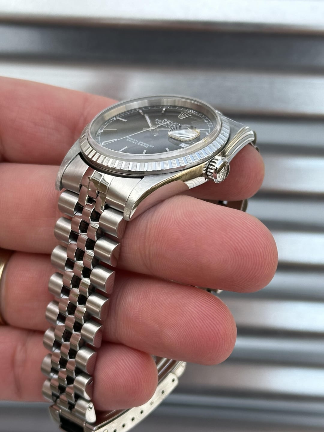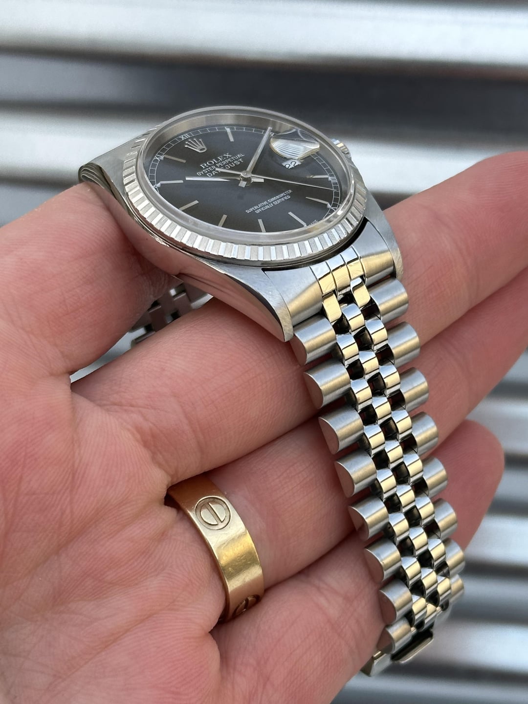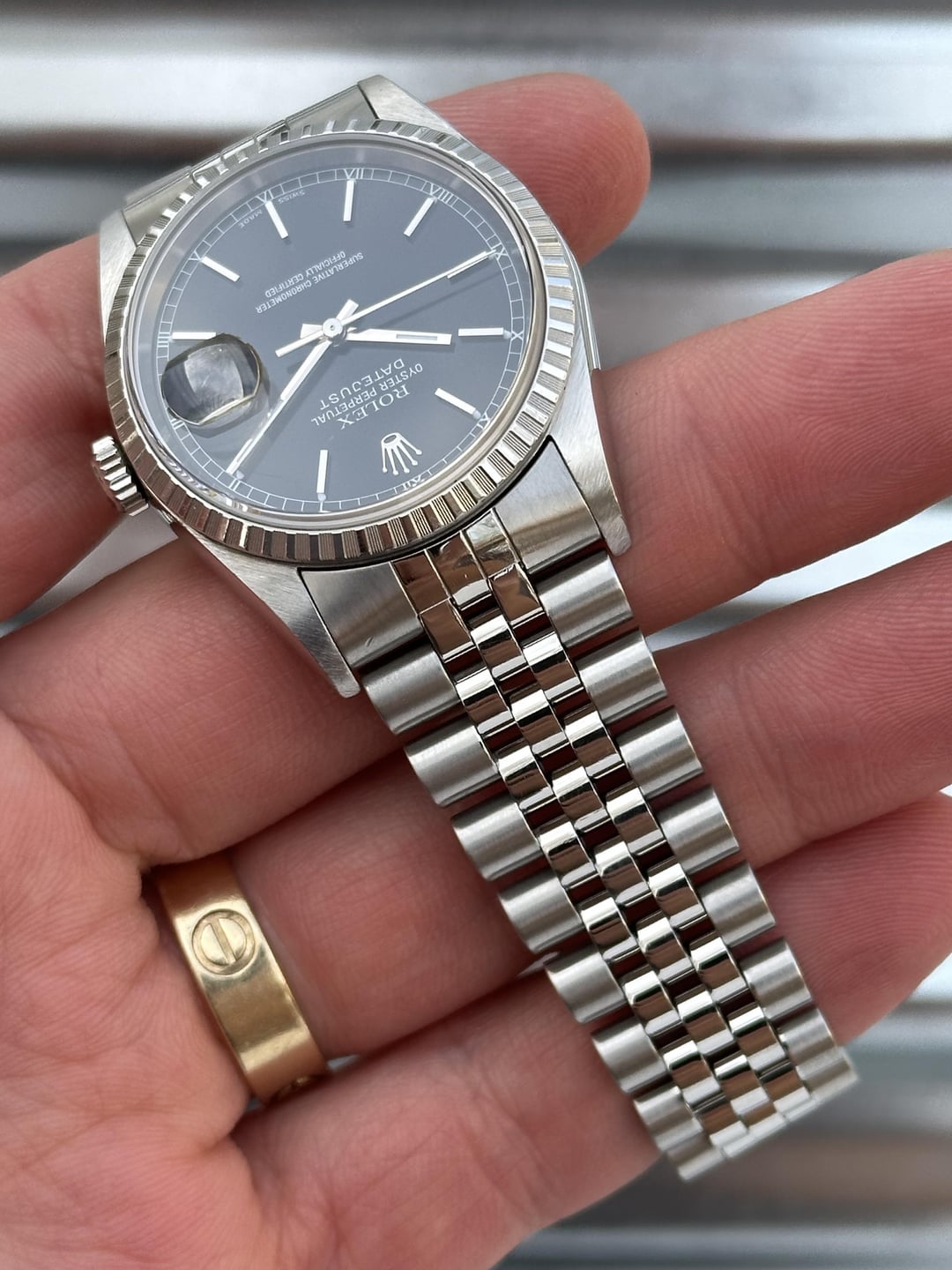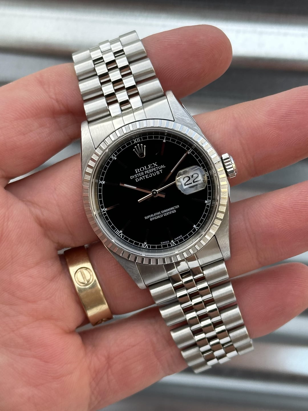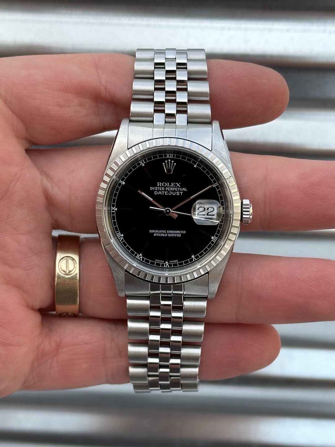 Here’s a 36mm Rolex Datejust Reference 16220 with a black dial (roman numeral track) and an engine turned steel bezel in very good condition. Reference number: 16220 Serial number:  A940*** serial which dates this watch to 1999 COMES WITH BOX & PAPERS (please see second photo for everything that’s included) 💰5️⃣5️⃣0️⃣0️⃣+✈️ The watch is in overall very good pre-owned condition - see pics for details. Sharp case, thick lugs, clean dial and hands. Crystal is free of chips or scratches.The engine turned steel bezel is in great shape. Clean finish on the bracelet as shown in the pictures.Thick coronet. Minor stretch on bracelet  with plenty of life left. If you’re in the market for a clean black dial stainless steel DJ then this would make a great choice! 20 links on bracelet Fits about 7.25 inch wrist 💰5️⃣5️⃣0️⃣0️⃣+✈️ We accept Zelle/Wire as payment. Overnight fully insured shipping.  I have plenty of references across different platforms so buy with confidence. Follow our IG @215Watches for daily deals. Thank you for your time [photo album](https://imgur.com/a/UzNxEA3) [time stamp](https://imgur.com/a/VKLbNPh)