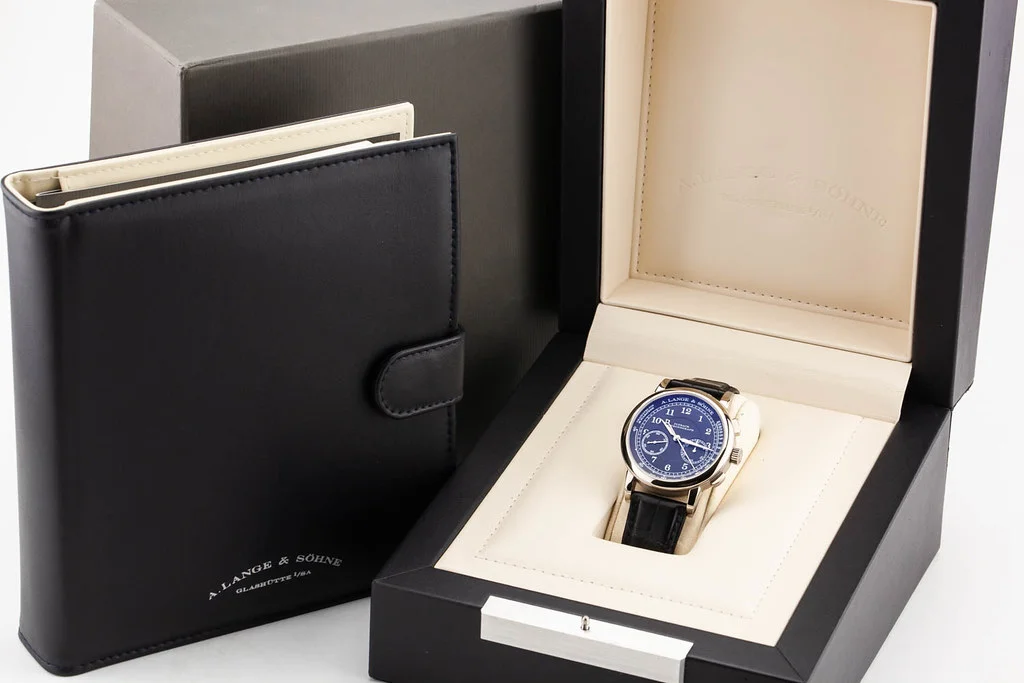 Up for sale is a near-mint condition A. Lange & Söhne 1815 Flyback Chronograph 38.5mm White Gold Black Dial on Alligator Strap, reference # 414.028 / LSLS4143AG. It comes complete with all boxes, papers, booklets, and Lange Guarantee Seal dated December 2020.