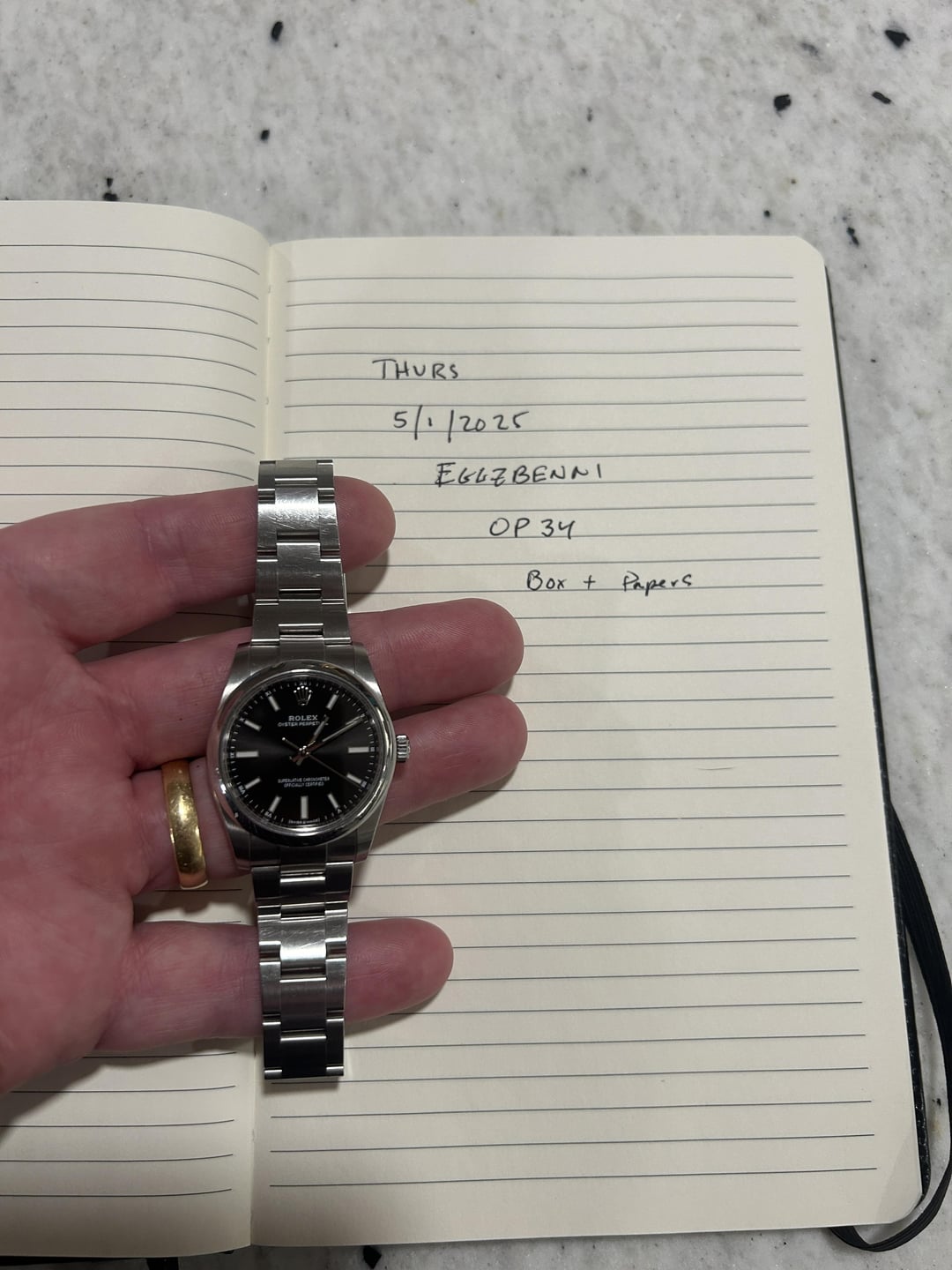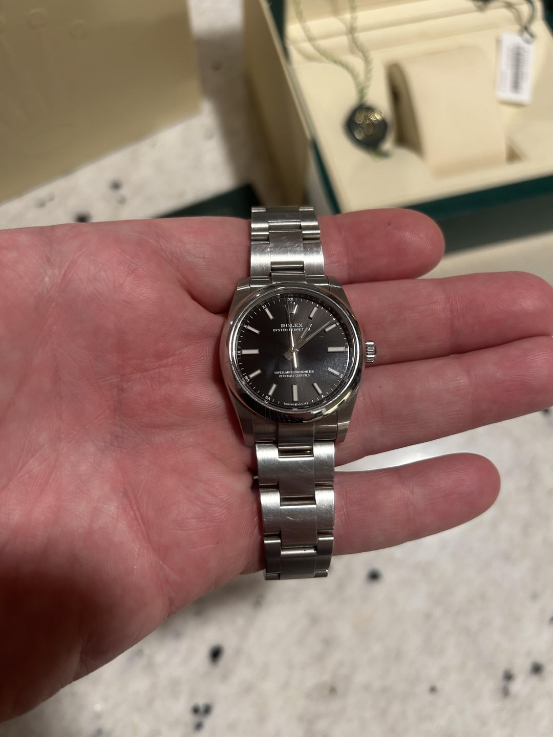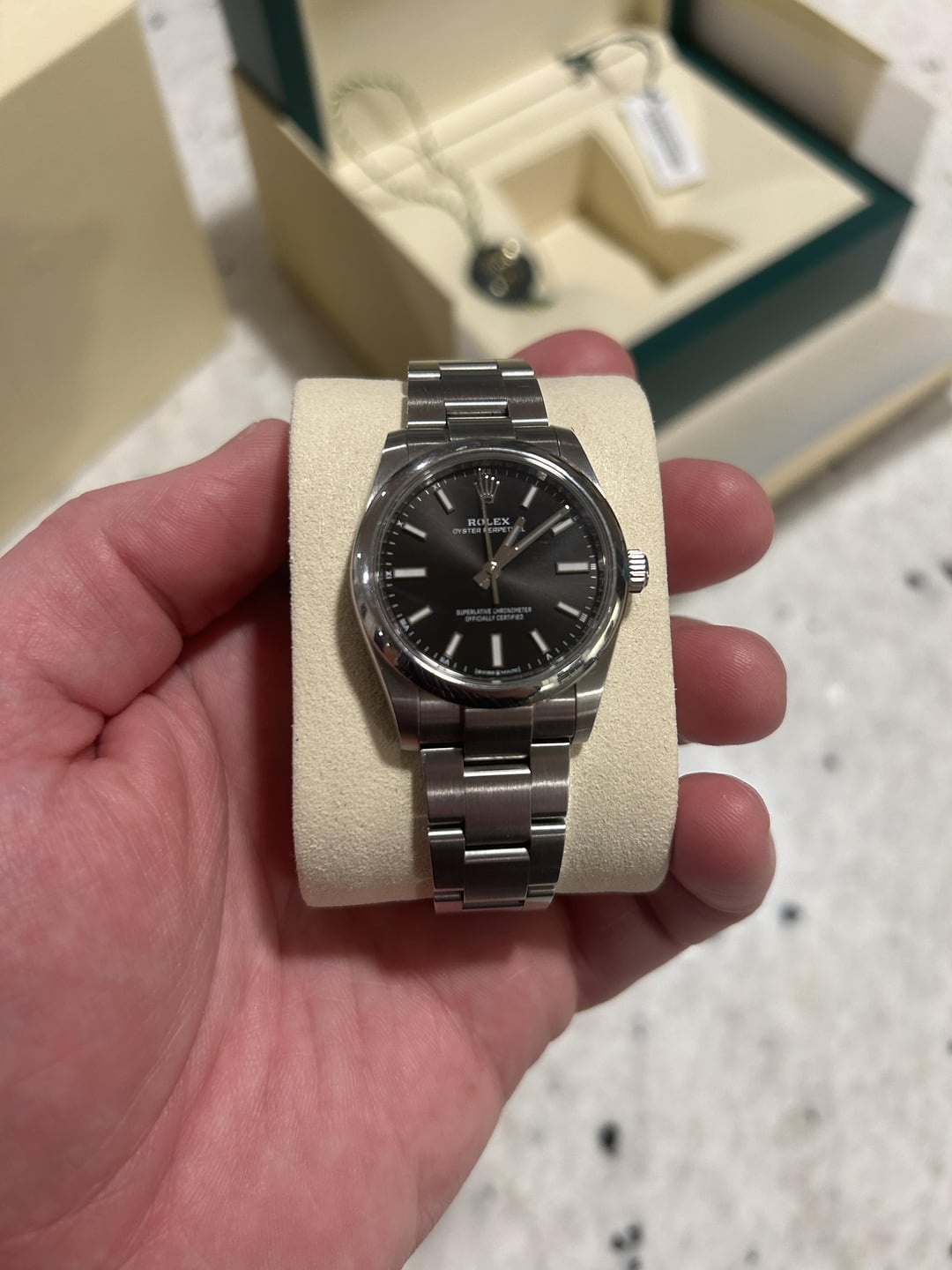 Type: Rolex Oyster Perpetual Reference 124200 with Box and Papers Dial: Black luminous stick markers Hands: Luminous stick hands Metal: Stainless steel Case Width: 34mm Watch Movement: Automatic caliber 2232 Band: Rolex Oyster Bracelet Circa: 2022 Condition: Overall good condition, scratches and wear throughout the case and bracelet. Movement runs and sets as it should. Service is recommended for daily use and timekeeping accuracy. $6,900 • price includes insured 2 day shipping CONUS Prefer wire on my first sale through watchexchange • can accept PayPal and Zelle from reputable buyers Happy to show watch over Facetime. Let me know of any questions!
