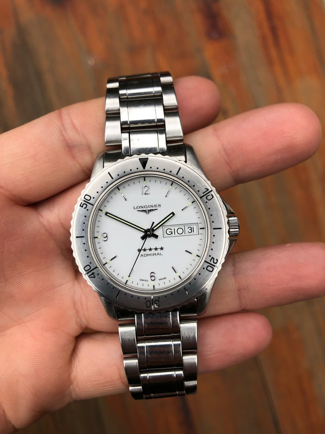 Presenting a Longines 5 Star Admiral that perfectly combines heritage with functionality. Its crisp white dial features understated Arabic numerals at 6, 9, and 12, plus a handy date and weekday function. Despite a few marks from its journey, this 7/10 rated watch is still a head-turner and runs as accurately as ever, reflecting Longines’ timeless craftsmanship. For anyone seeking a piece with both elegance and character, this Admiral is ready to make its next voyage! DM me with any questions and I'll be more than happy to help. **Price reduction: 700 EUR O.B.O. + G&S. Shipping Included within EU.**