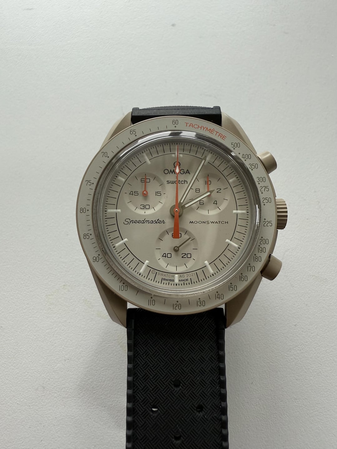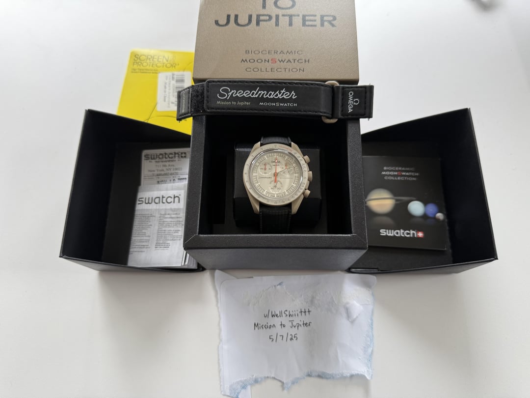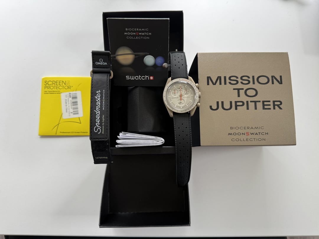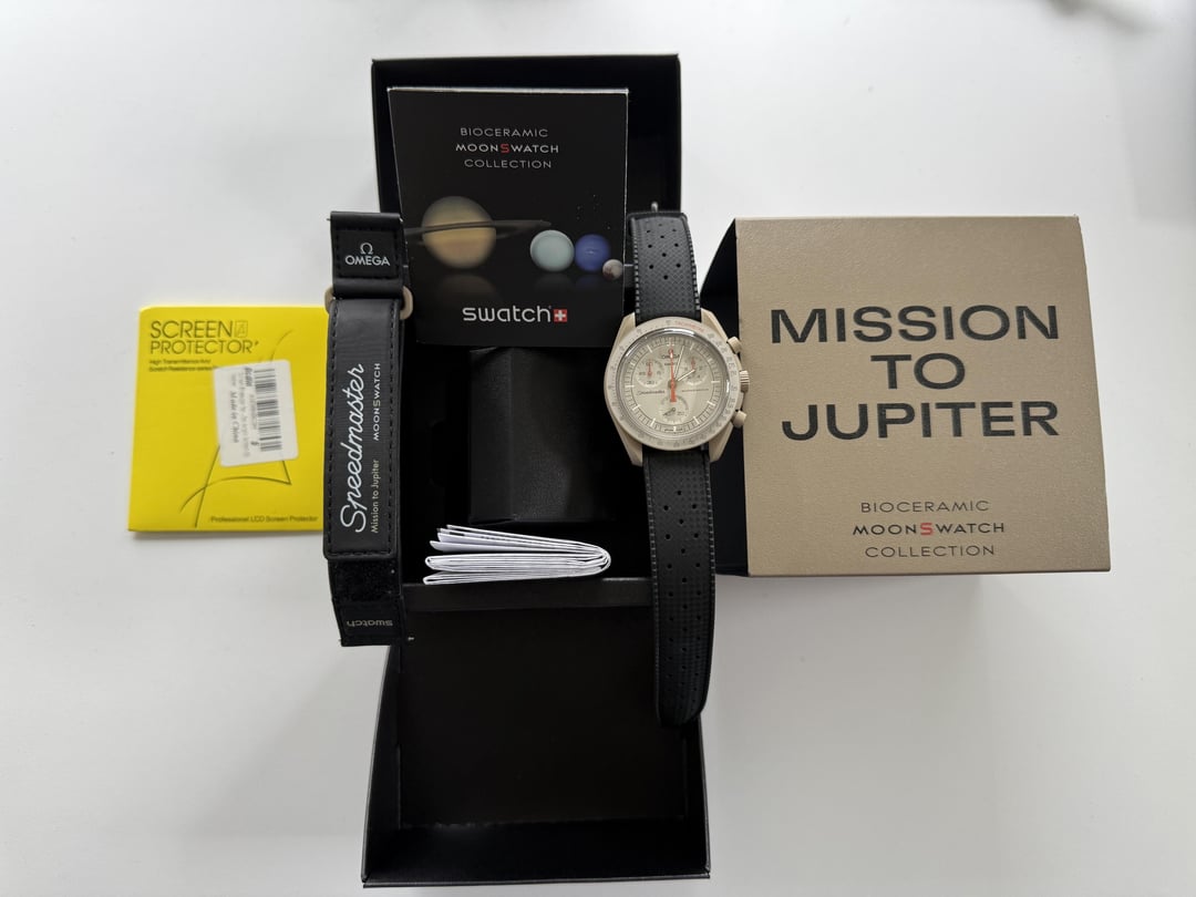 Hi there, I’m looking to sell my Mission to Jupiter Moonswatch, it is in excellent condition and very lightly used. It’s only ever been worn with a screen protector applied, so any marks you see in the photos aren’t on the face. Asking- $250 shipped (plus G&S fees) CONUS only Willing to accept PayPal or PayPal G&S (if G&S I would strongly prefer a buyer with transaction in this sub). No transactions here, but I do have a pending sale in fragranceswap if you’d like to wait for the feedback from that transaction to post (item should arrive to buyer tomorrow, 5/8). Including both the OEM strap, a rubber strap from Amazon, as well as an extra screen protector. Also I have full box and papers as seen in the pics (covered the serial number on the warranty- not sure if it’s advised to have it show in pics).