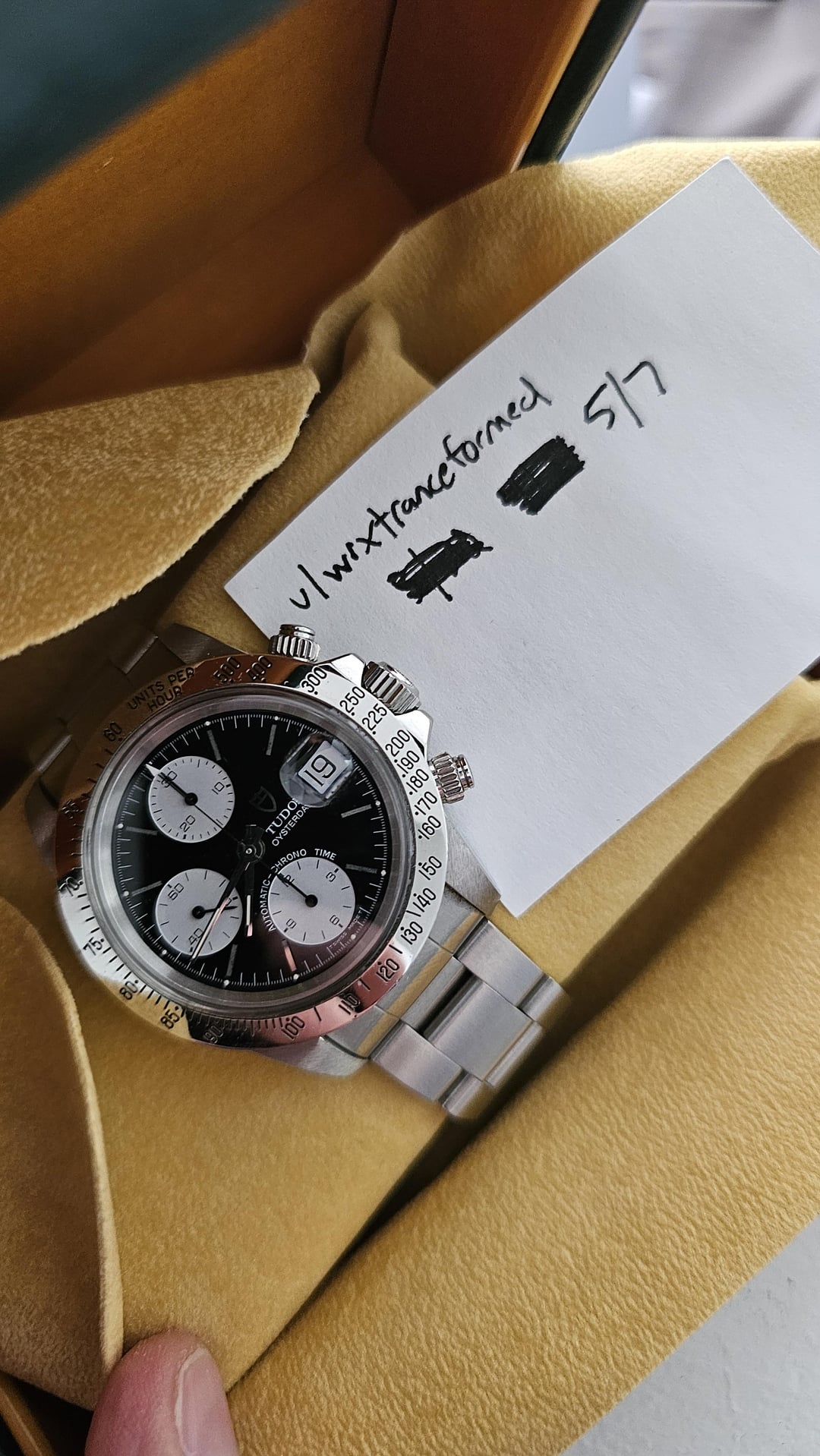 Hi folks! For sale is a minty example of one of the best neo-vintage Big Blocks, the Tudor 79180 Reverse Panda from 1992. Powered by the venerable Valjoux 7750, this watch has a perfect case size at 40mm x 47.8mm x 14.5mm with 20mm lugs. This watch is equipped on a Tudor 78360 bracelet with 589 end links and R9 clasp code. Condition wise I would put this at a “very good” vintage condition. The case maintains its crisp lines and factory brushed / polished finishes. There are small handful of minor hairlines and very light microdings in the case and steel bezel but as you can see in the pictures it is in incredible condition. There are only a few very faint marks in the acrylic crystal that are visible under certain lighting angles and could likely be polywatched out by the next owner. The dial is flawless and the tritium lume is just starting to develop a warm patina. The bracelet is in great shape with only lights signs on desk diving on a few of the links and the clasp. Service history is unknown, however the movement functions and pushers operate properly and crisply and I clocked it at -3 sec/day on my timegrapher app with just a partial wind. The bracelet can fit up to roughly a 7.5” wrist. Note for vintage watches: I do my best to describe any watch I sell to the best of my ability, but old watches are like old cars – they can be temperamental, need service at any time, and are generally not as reliable or as precise as a modern watch. It should be assumed that unless I know the service history the watch will likely need a service if you plan to wear it frequently. Even post-service (depending on the watchmaker), vintage watches can still be less reliable than modern watches. I take great lengths to safely package the watches that I ship but vintage watches have been known to be more prone to having damage during shipping due to vibrations, screws backing out, etc. Please understand this before buying a vintage watch online in general! The sale will come as watch only, with the watch and a generic wood box. Timestamp for Reddit: [https://preview.redd.it/wts-tudor-79180-reverse-panda-big-block-1992-v0-nkbgksnk8fze1.jpg?width=1080&crop=smart&auto=webp&s=80aaab8e52cf7f14b2a4a96640382976b4395b30](https://preview.redd.it/wts-tudor-79180-reverse-panda-big-block-1992-v0-nkbgksnk8fze1.jpg?width=1080&crop=smart&auto=webp&s=80aaab8e52cf7f14b2a4a96640382976b4395b30) I am asking $5,399 net to me including fully insured shipping in the US. Not interested in trades at this time, trade offers will be ignored. Please message me with any questions or interest and thanks for looking!