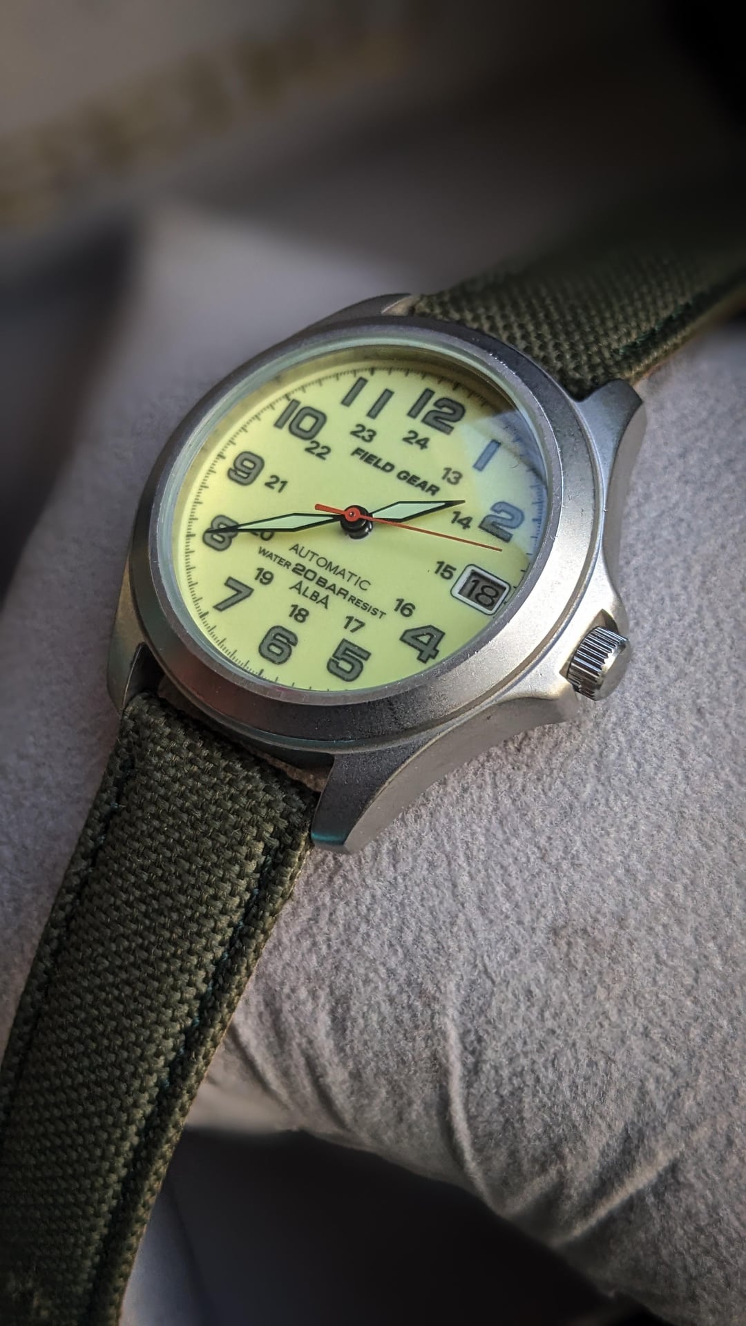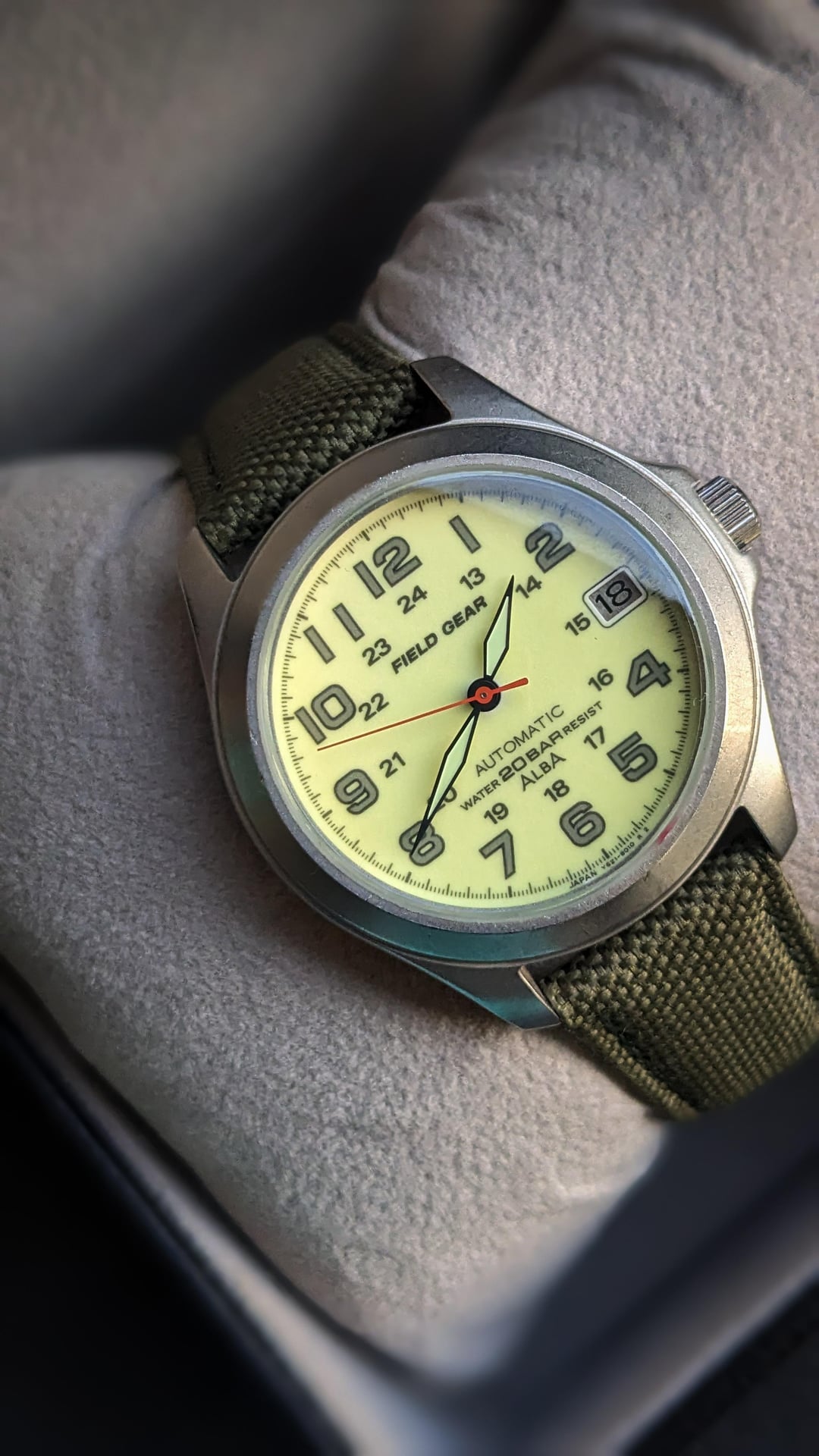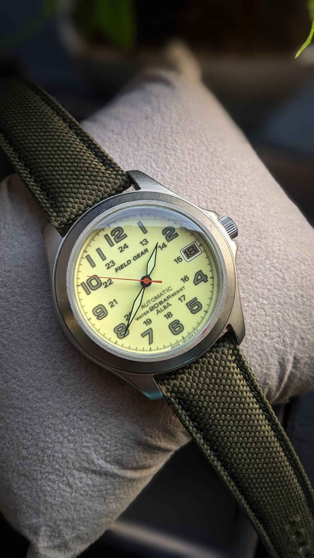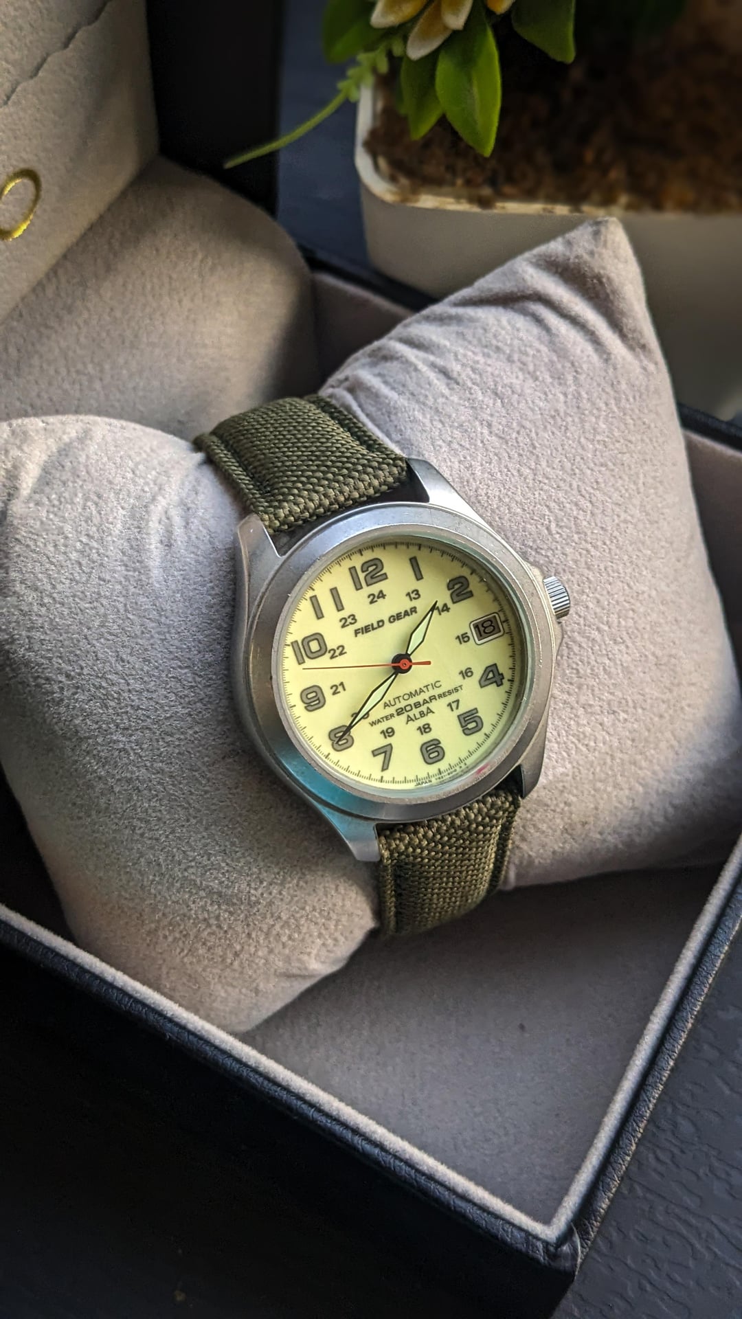 Hello Watchfam, Selling a Seiko Alba Fieldgear Y621-0010, Seiko Corp. It was produced in Japan in 1994. It is an automatic watch belonging to the Alba series of Seiko, known for its solid and durable watches. The watch has a stainless steel case, a fully luminous dial with luminous hands and Arabic numeral markers, and an aftermarket field type strap matching with the vibe. Seiko Alba Fieldgear Y621-0010 is a thoroughbred Japanese automatic watch, simple but very solid and durable, perfect for daily use. You will definitely feel the feeling of solidity when you hold this product in your hands. The dial of the product is completely phosphorescent and provides excellent reading at night. Case Diameter: 37.5mm x 42.5 approx Dial Color: Luminous Lug Width: 18mm Functions: Date, Central second Condition: Very good, little or no signs Price: 320$ Timestamp: https://imgur.com/a/OKShX0S