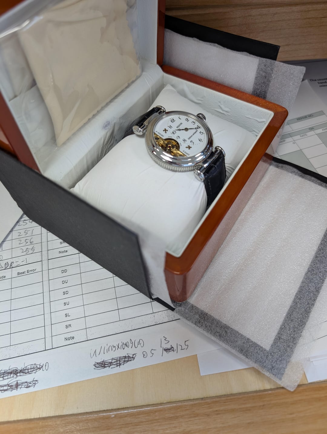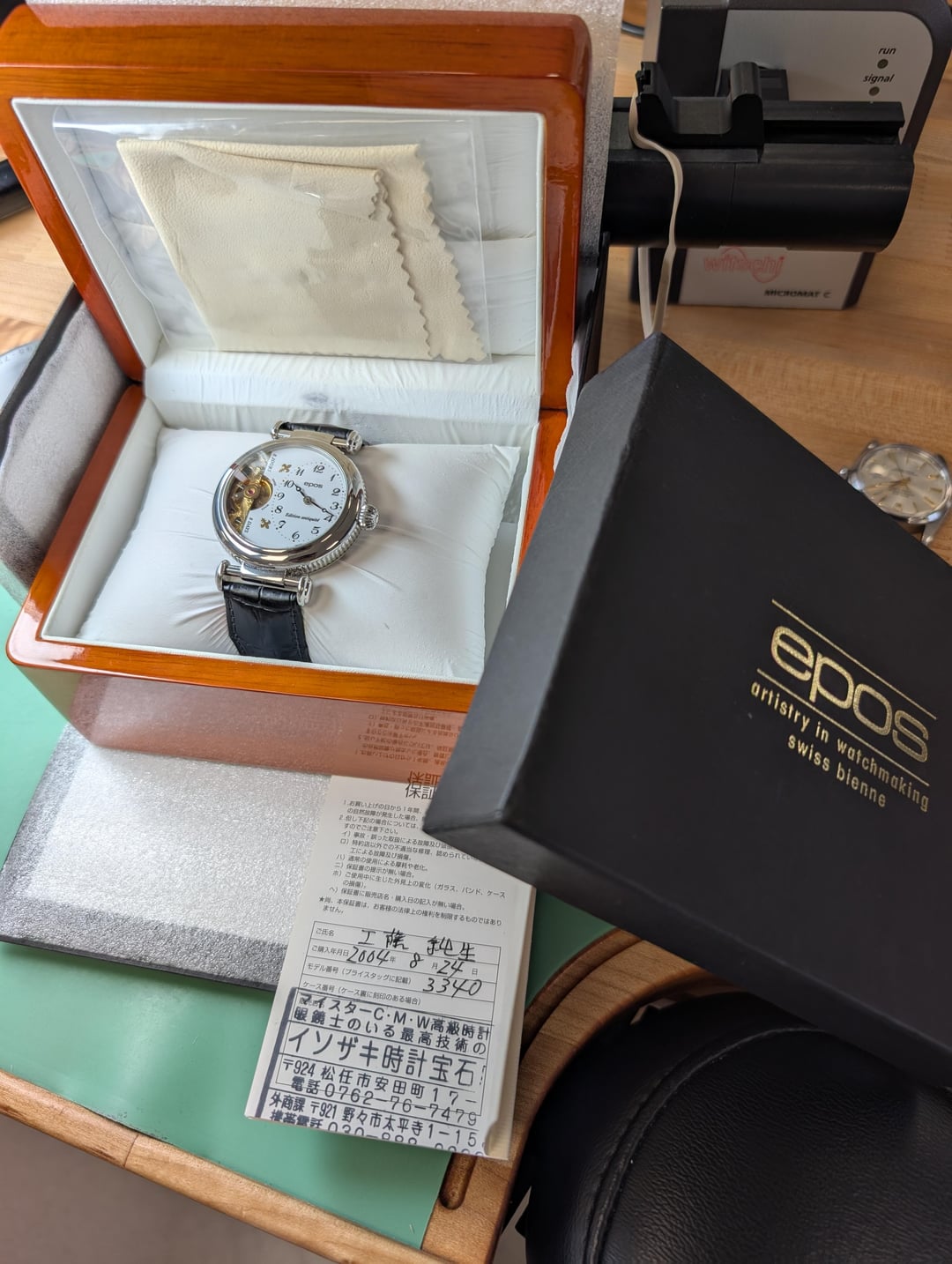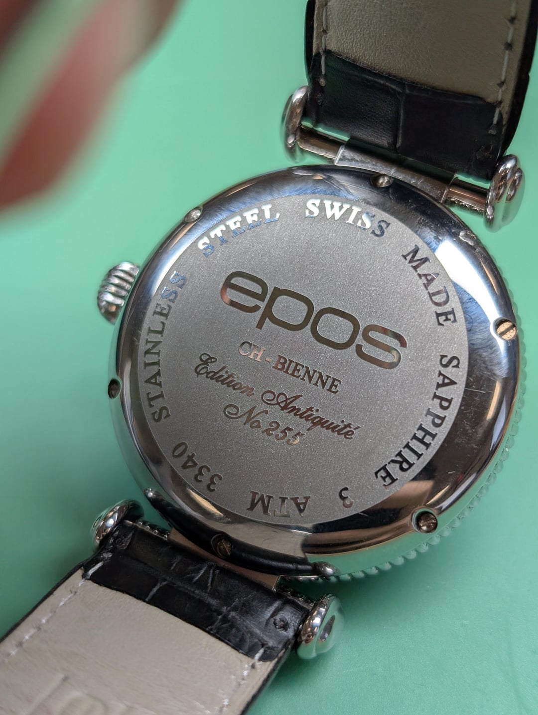 For sale today is my Epos Hebdomas 8 day. This is one of the cheapest 8 day wristwatches available on the market, and features a very unique movement designed in the early 1920s and manufactured in the early 2000s. To allow the massive 8 day power reserve, the mainspring barrel takes up almost the entire diameter of the movement and is mounted on top of the main plate on the movement side. With the mainspring barrel taking up most of the real estate, the escapement and balance was moved onto the dial side creating a very unique architecture and an early example of an open balance movement. [More details of the movement can be found here.](https://grail-watch.com/2020/11/29/hebdomas-the-true-story-of-the-8-day-pocket-watch/) Despite having what's technically a pocket watch movement, the case size remains reasonable at 41mm with short swivel lugs making the watch wear smaller on the wrist. Cosmetically the watch is in excellent condition with only light swirls throughout. Mechanically the watch runs well at full wind and keeps decent time. Service history unknown. The watch comes with its original wooden presentation box, cleaning cloth, and warranty card. The warranty card is dated 2004/08/25 I'm asking $1200 for this piece. International shipping at buyer's expense. PayPal G&S available at my destination. Thanks for reading!