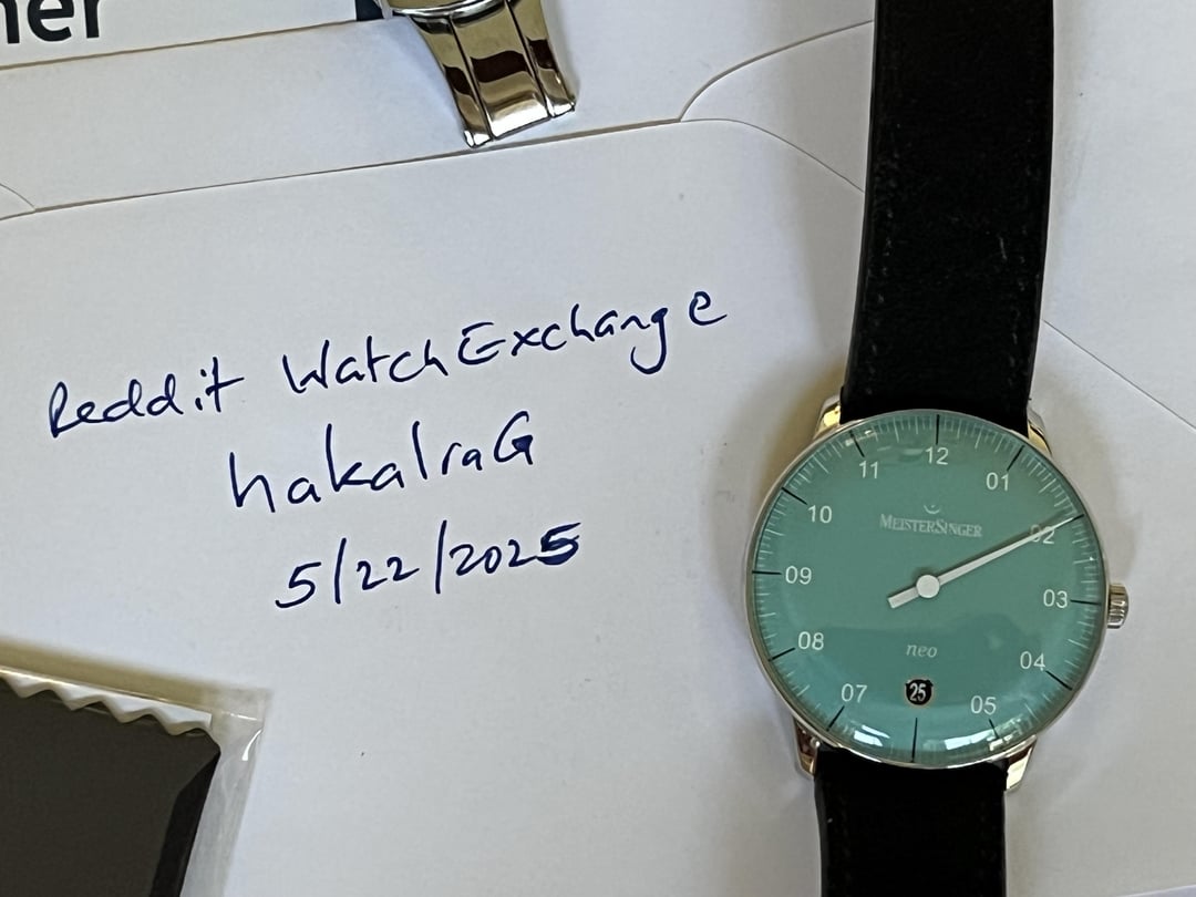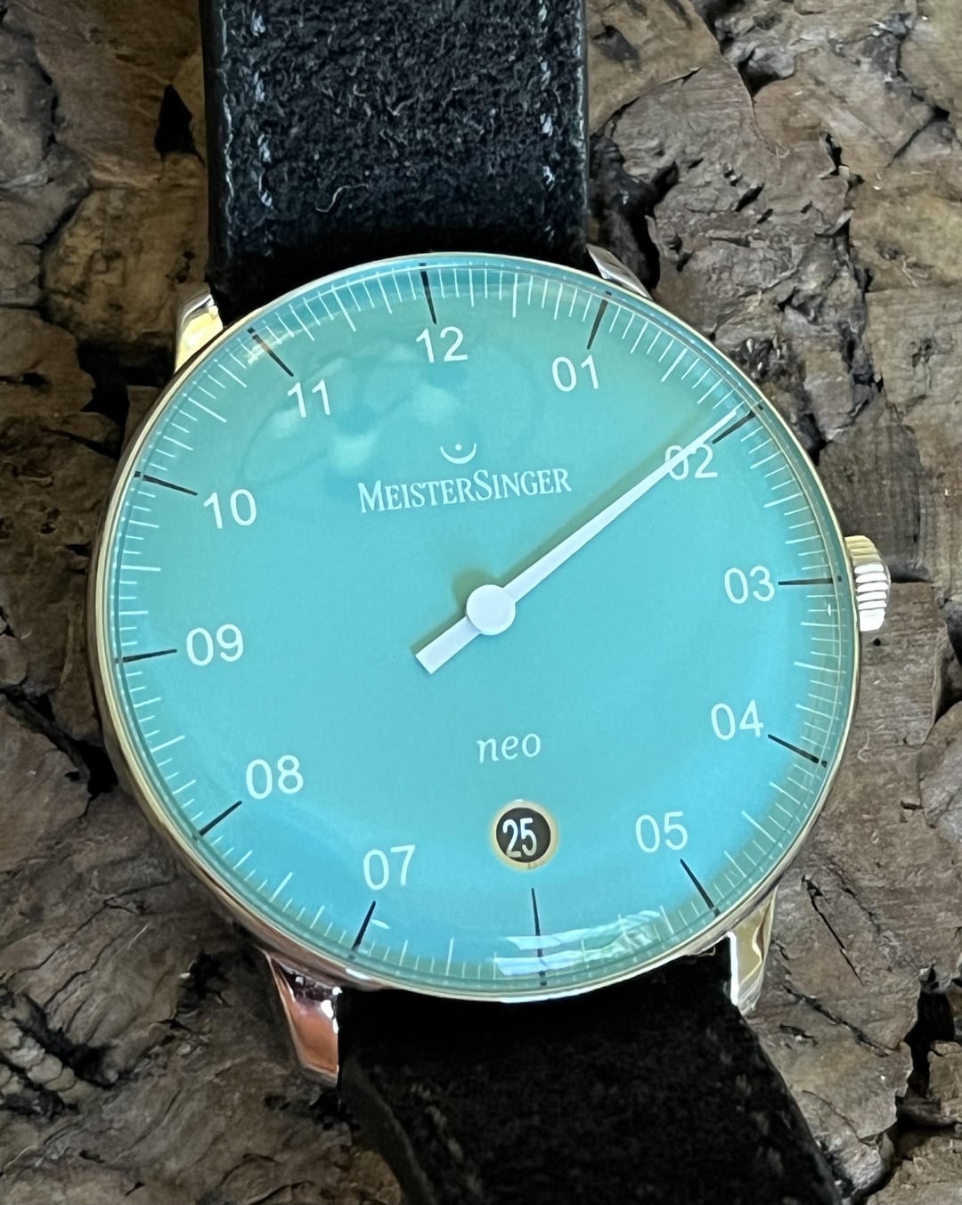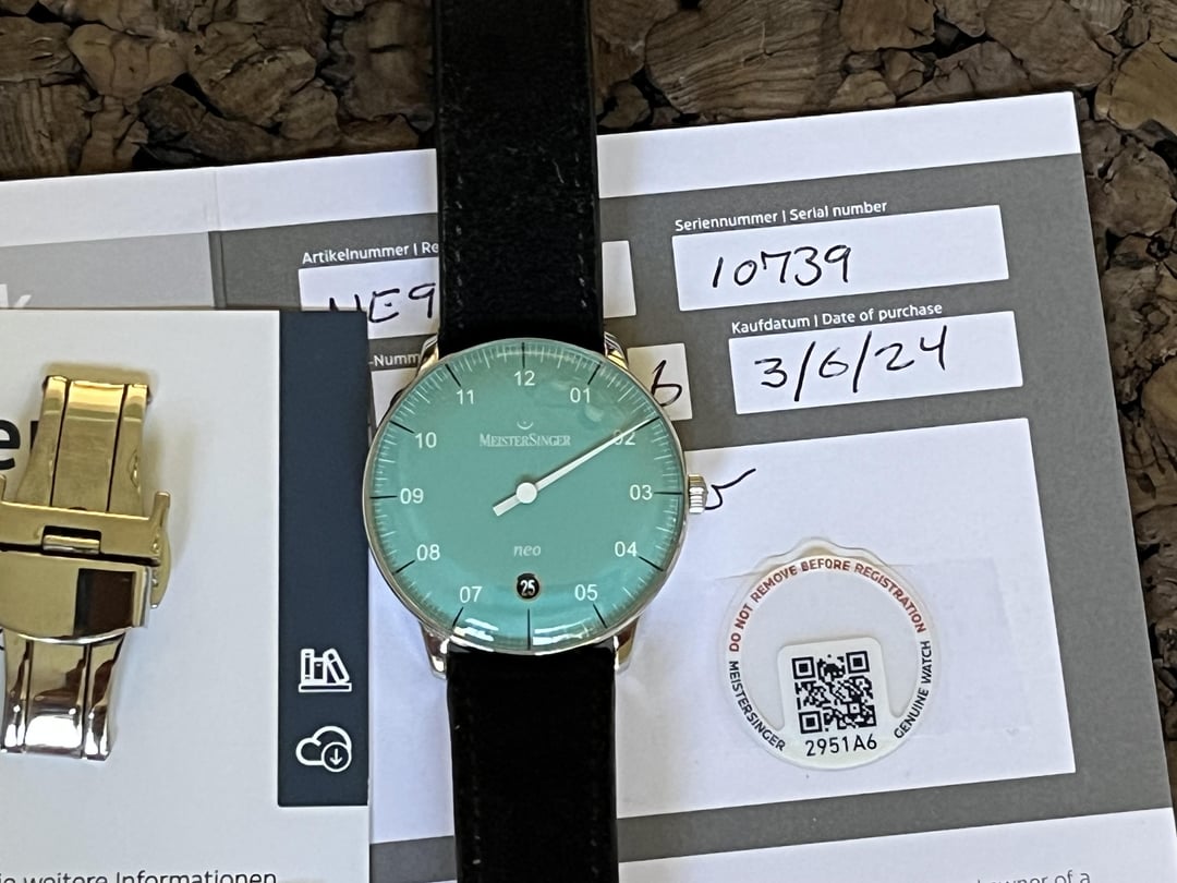 * Asking $499 oro * Watch is in mint condition with under warranty until March 2026 * * Case: 36mm Diameter x 40mm lug to lug x 9.7mm thin x 18mm lug width * Movement: Sellita SW200, modified for Meistersinger single-hand * Crystal: Hardened Acrylic * Water resistance: 3 bar * Other: Dial color is lighter than shown if looking on a mobile device. Escapement magazine pictures show it more accurately. I’d say this is a slight bit more saturated than the well-known Tiffany blue * Reviews: * Escapement Magazine: [https://escapementmagazine.com/articles/meistersinger-neo/](https://escapementmagazine.com/articles/meistersinger-neo/) * Meistersinger web site: [https://meistersinger.us/en/product/This isneo-azure-blue/](https://meistersinger.us/en/product/neo-azure-blue/) * Please note the web site says this version is sold out and has a list price of $1449 to $1489 * * Includes: * \--- Watch on almost new Meistersinger suede strap with OEM buckle * \--- generic (but nice) dual fold deployant if you prefer that to a buckle * \--- full boxes and papers