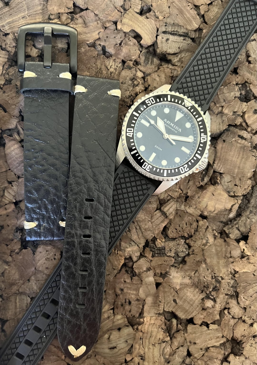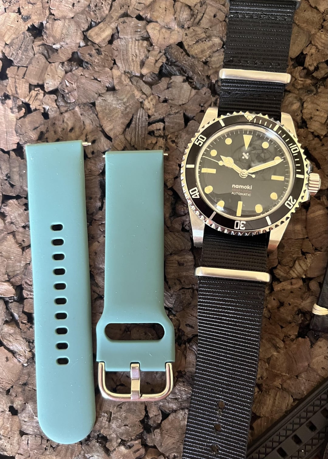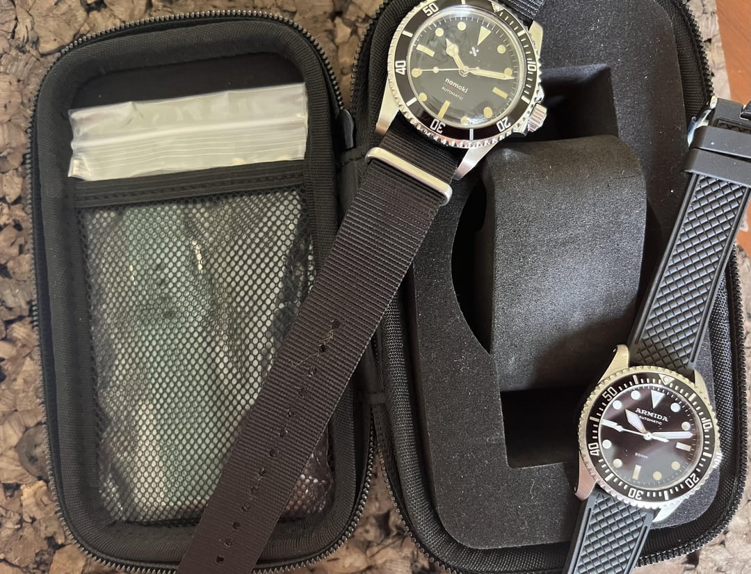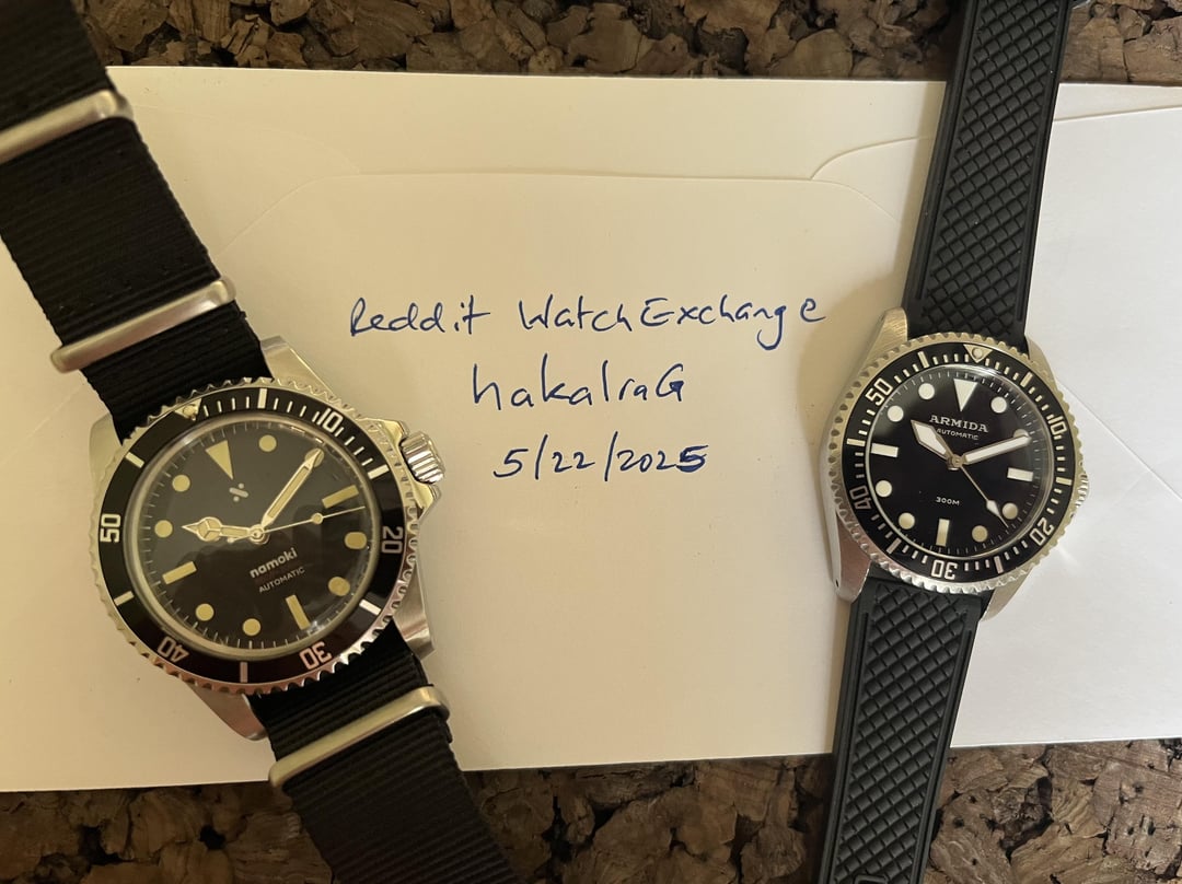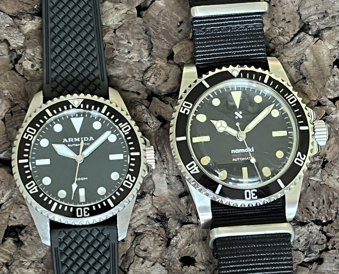 * Asking $295 oro * Both watches are in used good condition, and running well and keeping great time – selling together for one great price * * Armida * Case: 36mm Diameter x 18mm lug width x 44 mm lug to lug x 12mm thick * Water resistance: 300m * Movement: Seiko NH38 (no date version) * Crystal: Sapphire crystal * Rotating Bezel: Unidirectional with 120 clicks (a bit hard to turn for me, but ymmv) * Other: Watch is sold out at Armida ([https://www.armidawatches.com/collection.php#!/Armida-A11-black-dial-no-date/p/324372265](https://www.armidawatches.com/collection.php#!/Armida-A11-black-dial-no-date/p/324372265)), no bracelet, keeps excellent time for me (About +5s per day face up on my desk) * * Namoki * Case: 39.5mm Diameter x 20mm lug width * Water resistance: None verified, but has a screw down crown * Movement: Seiko NH38 (no date version) * Crystal: Thick and highly domed acrylic * Rotating Bezel: Friction fit (does not “click” but is nice and tight) * Other: This is a custom build from greatvaluebleach and has a beautifully matched Namoki dial and hands, with great lume. Keeps excellent time for me (About +3s per day face up on my desk). * * Includes: * \--- Armida A11 watch on rubber strap * \--- Unused leather 18mm strap * \--- Namoki dialed watch on NATO strap * \--- Unused rubber “tuck under” strap in pale green * \--- all in a zip up Kraken case