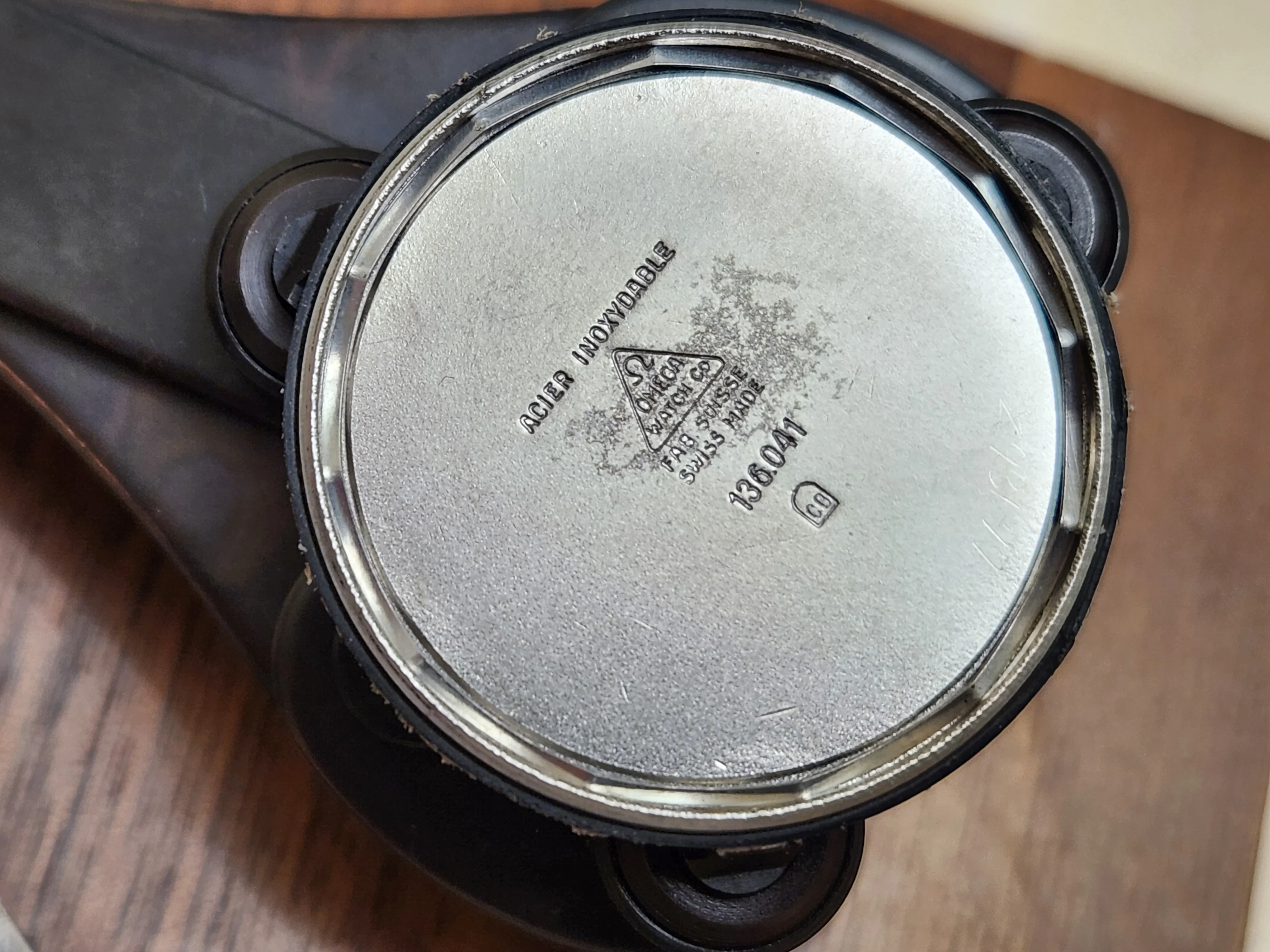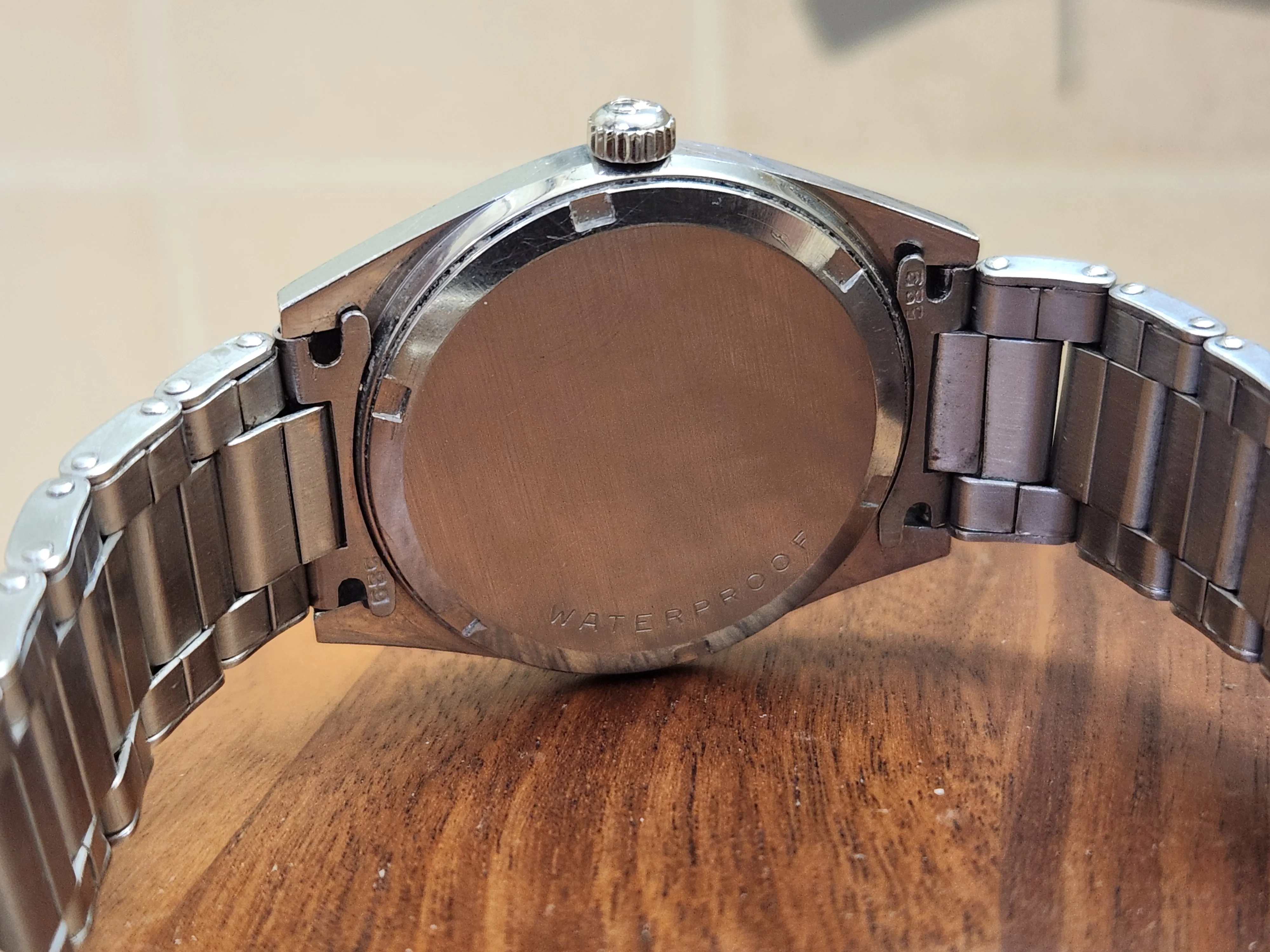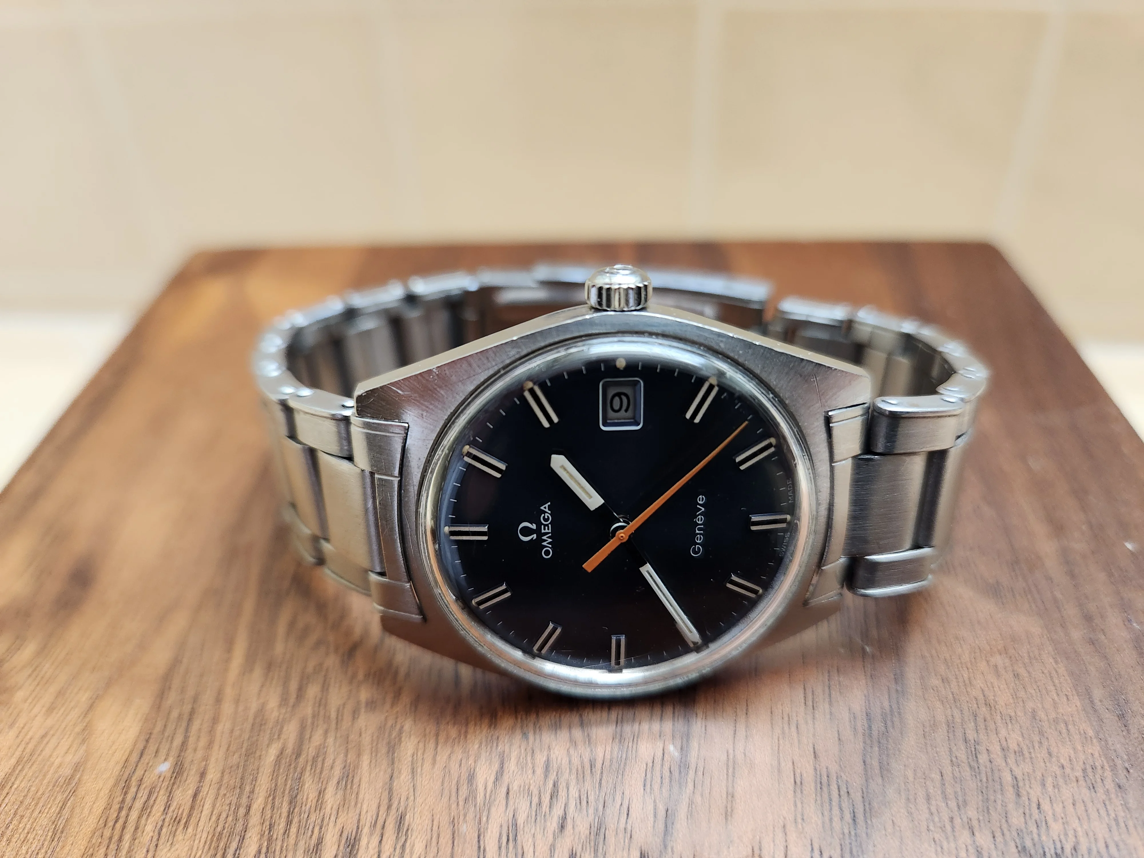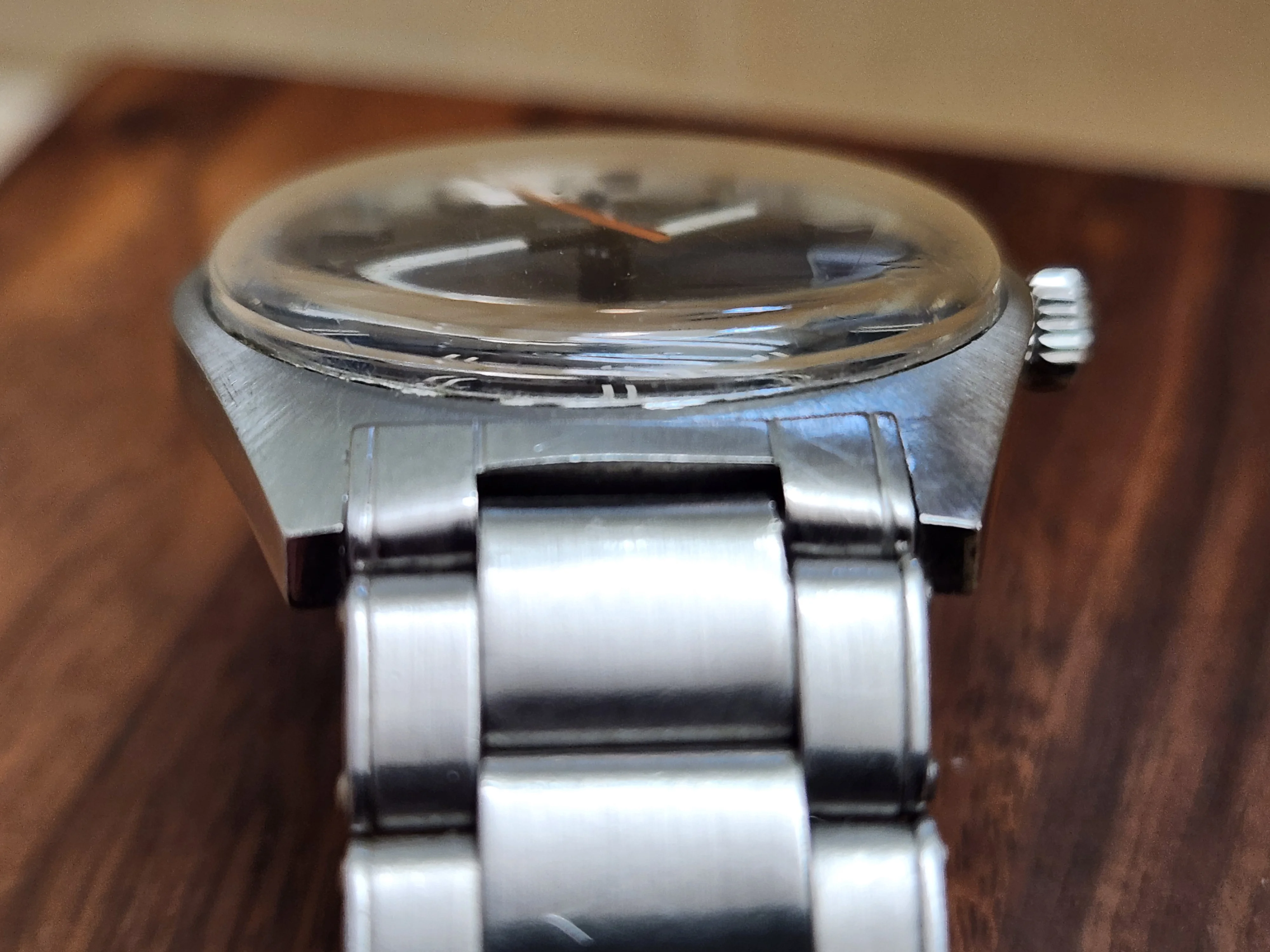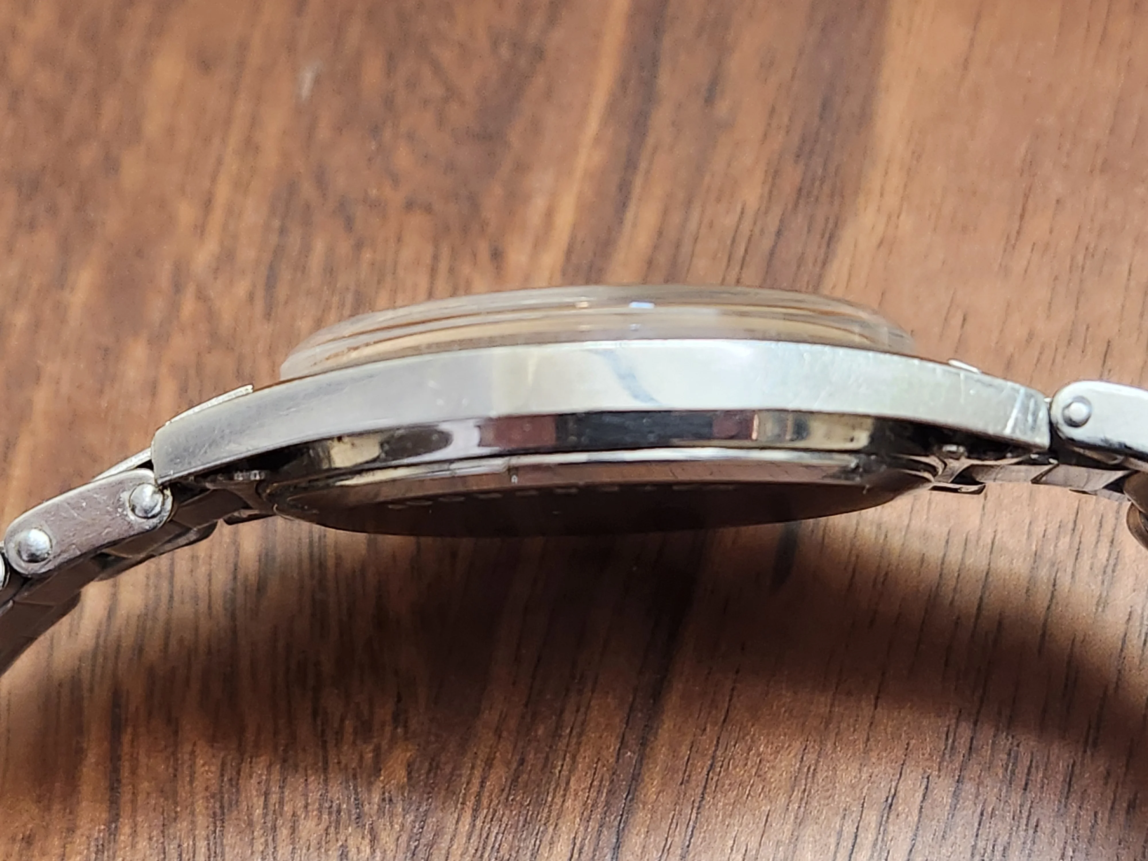 The sleek mid-century modern stainless steel case is sleek and combines a brushed top and polished sides. The corners of the watch case are razor sharp suggesting that it has little or no history of refinishing/repolishing.