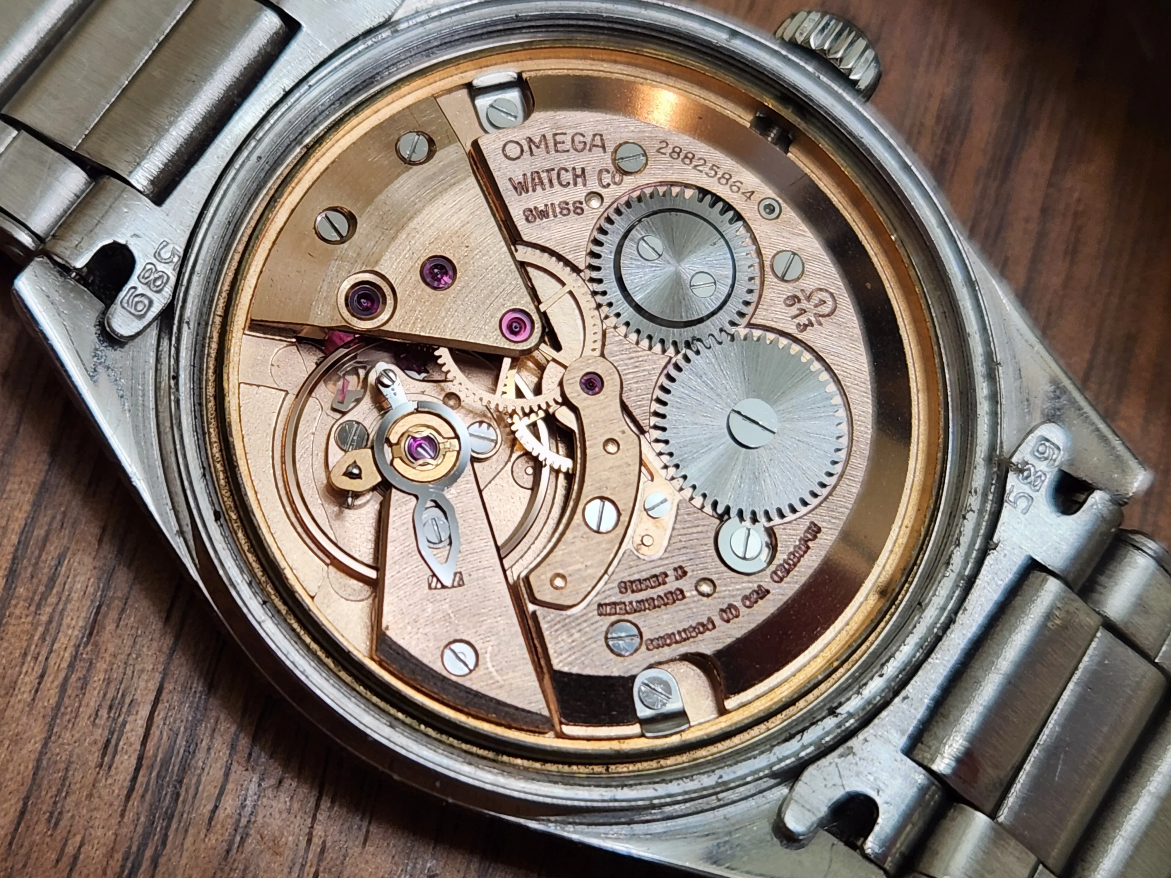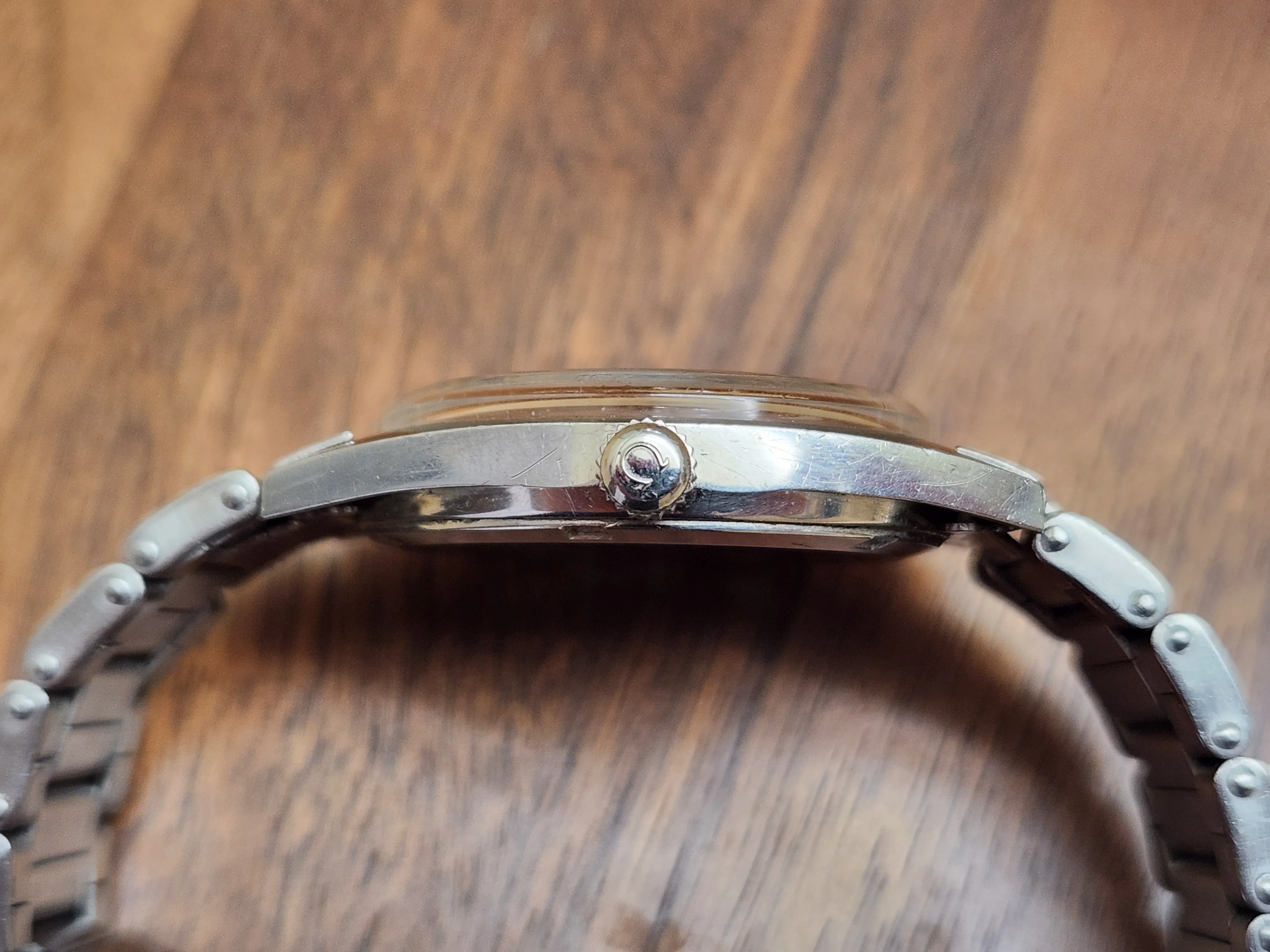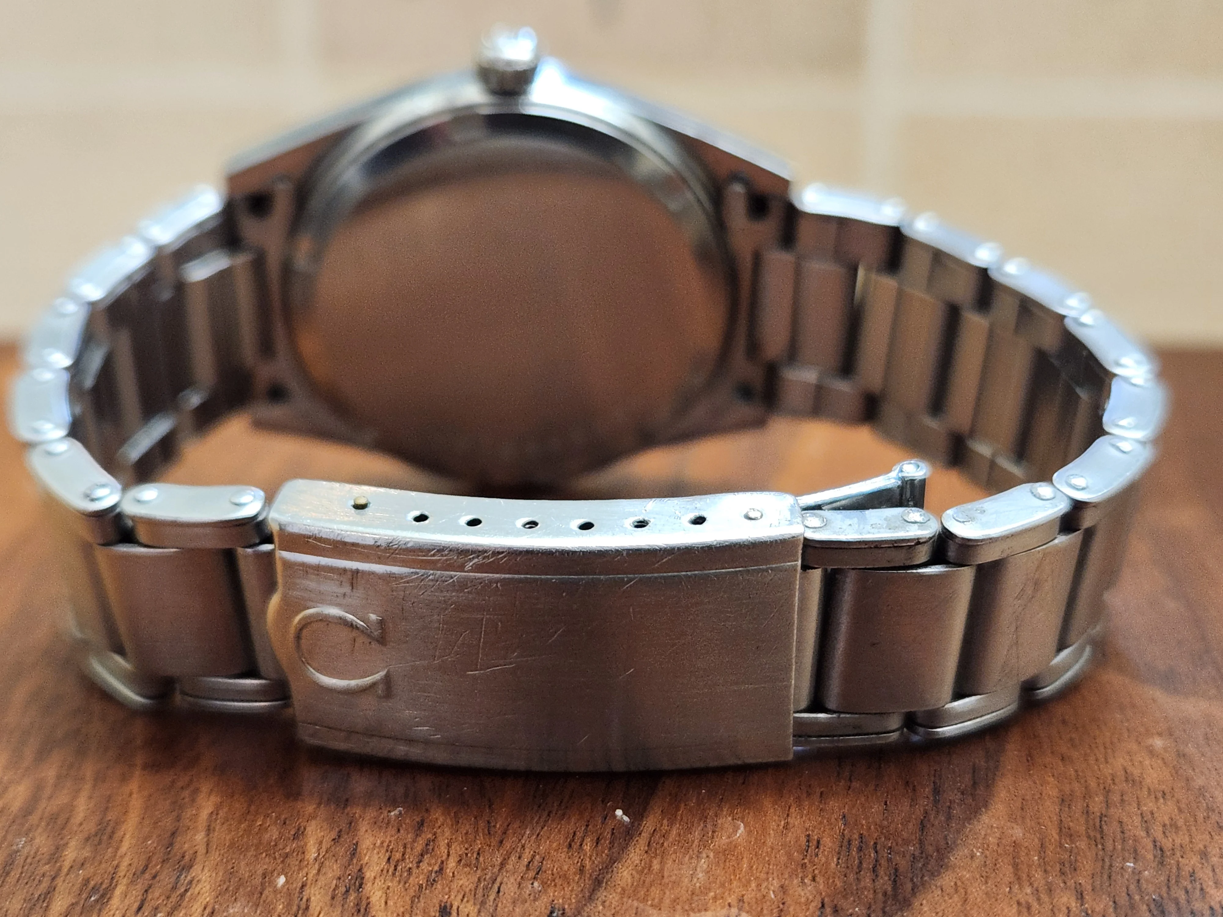 The quick-set date is operated by the signed push-pull crown and daily winding the crown is buttery smooth thanks to the recently serviced caliber 613 movement from Omega’s golden age of watch production. The original acrylic crystal has the Omega logo etched from the underside. The original Omega #11 bracelet has expanding rivet links and will fit wrists up to 6-3/4” in circumference and attach to the case with the correct 18mm 589 end links. Additional links can be added by use of screw pins and there is one removable link.