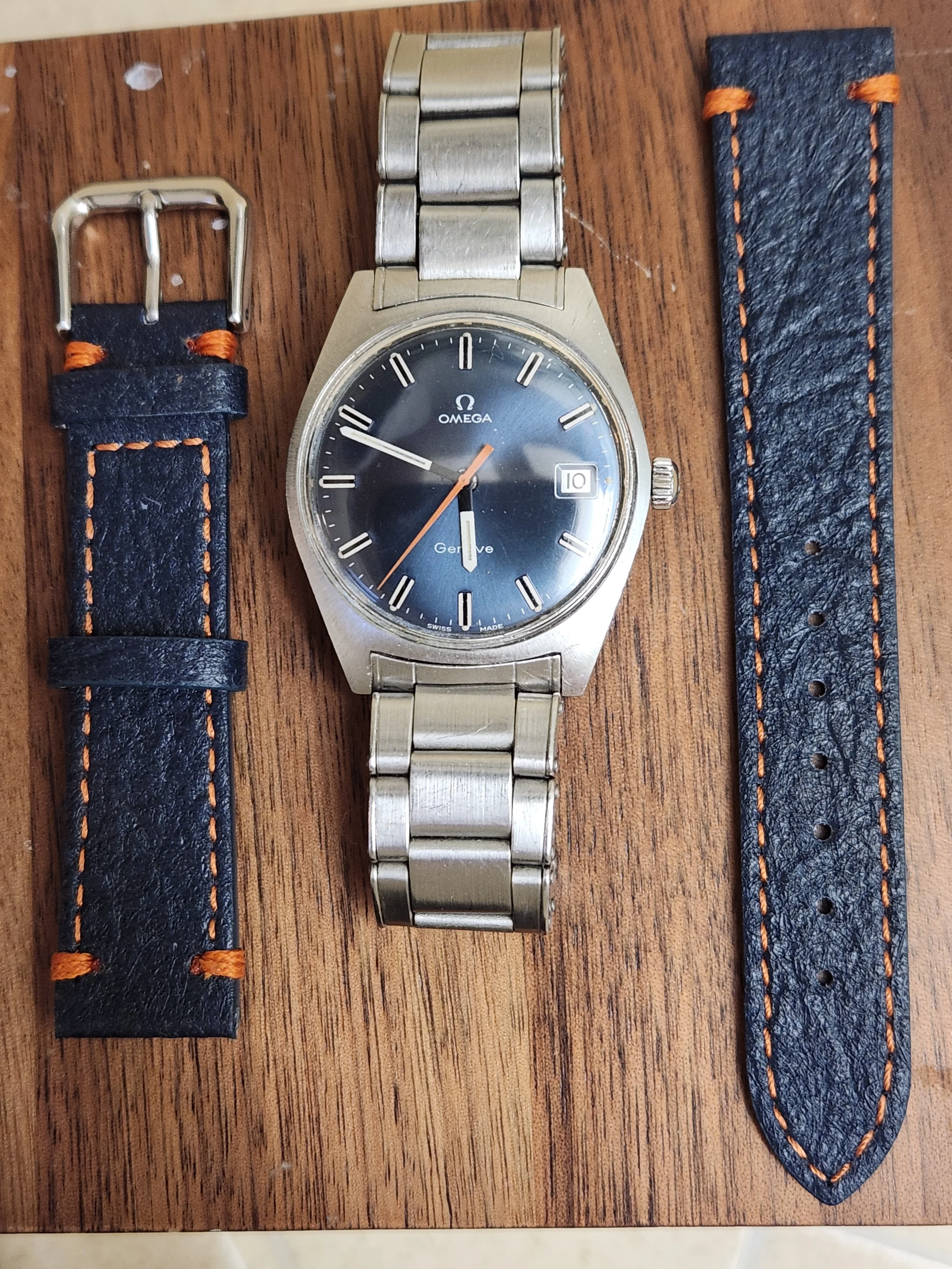 1969 authentic Omega Geneve (136.041) with blue dial and Admiralty-style ghost hands on an Omega original rivet oyster-style bracelet.Serviced in 2024 by a certain well-known Canadian watchmaker who specializes in vintage Omega, this manual wound 35mm mid-century modern gem is keeping very good time and is the perfect combination of a comfortable, legible yet stylish reliable timepiece from the golden age of Omega’s history.