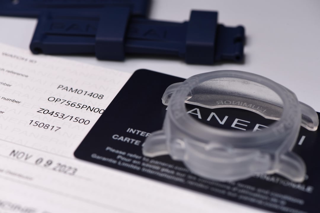**Panerai Luminor Quaranta Luna Rossa PAM01408 – Limited Edition #0453/1500** **Condition:** Mint. No visible wear. **Case Size:** 40mm DLC-coated stainless steel **Movement:** In-house Panerai P.900 automatic (3-day reserve) **Dial:** Blue textured sailcloth-inspired w/ red Luna Rossa accents **Water Resistance:** 100m **Lug Width:** 22mm **Warranty Card Dated:** Nov. 9, 2023 **Retail Price:** $9,300 **(Full Set):** * Inner & outer boxes * Warranty card from Panerai E-Boutique USA * Luna Rossa booklet * OEM navy blue rubber strap (unworn) * Mounted black/red rubber strap * Hang tag * Case protector * Matching serial/reference stickers * Original digital Panerai receipt **Asking:** $7,895 USD \- Includes FedEx 2-Day (Insured, Signature Required) \- International available at buyer’s expense Located in the U.S. — feel free to DM with any questions or offers. Thanks for looking!