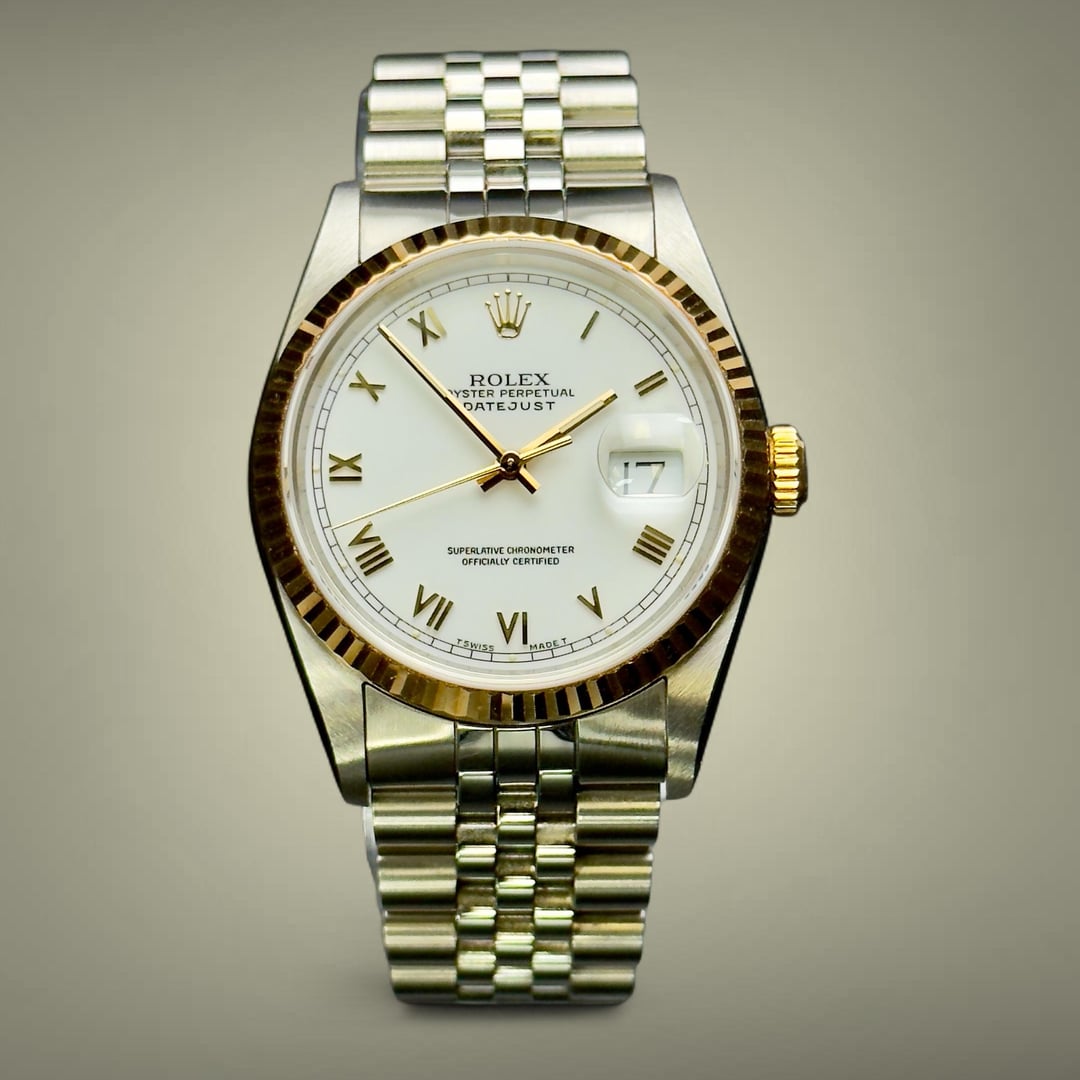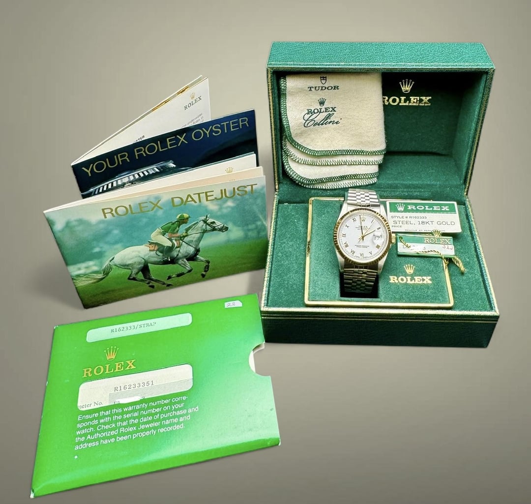 **Rolex Datejust 16233 (1989) – White Roman Dial | Bold Fluted Bezel | Full Set** This is a stunning example of the **Rolex Datejust ref. 16233**, dated to **1989**, featuring a crisp **white dial with Roman numeral indices** and the highly sought-after **bold fluted bezel** in 18k yellow gold. What makes this piece unique is its pairing with an **all-stainless steel Jubilee bracelet**, giving it a clean, sharp aesthetic that contrasts beautifully with the gold bezel. 🔹 **Unpolished case** – razor-sharp edges and thick lugs 🔹 **Barely worn** – exceptionally well-preserved for its age 🔹 **Original full set** – includes all factory paperwork and documents 🔹 **Automatic Caliber 3135** – robust and reliable movement 🔹 **36mm case** – perfect for vintage enthusiasts and everyday wearers alike This is not just a watch — it's a collector’s time capsule from the golden age of Rolex design. **PRICE:** $6,500 **CONDITION** The watch is in outstanding condition, showing almost no signs of wear on the case, crystal, or bezel and has never been polished. The original Jubilee bracelet is nice and tight and has barely been worn. It has only had a single owner and sat in a safe for most of it’s life. **INCLUDED** Watch on original Jubliee bracelet, original Rolex box, original purchase paperwork/warranty, booklets and polishing cloth. **GUARANTEE** 100% guaranteed authentic! You can buy with confidence! I am the owner of Luxury Watch Den and have done hundreds of transactions like this here and on other platforms. **SHIPPING** Ships Fedex overnight fully insured. Shipments are typically made within 24 business hours of payment. 📩 Available now at **Luxury Watch Den** – message us to secure this rare vintage find.