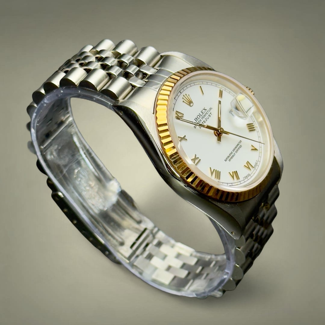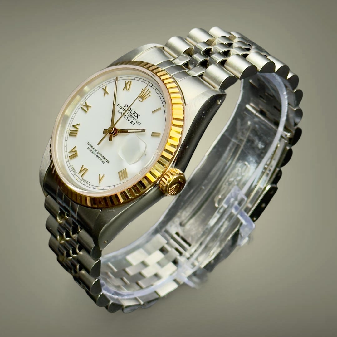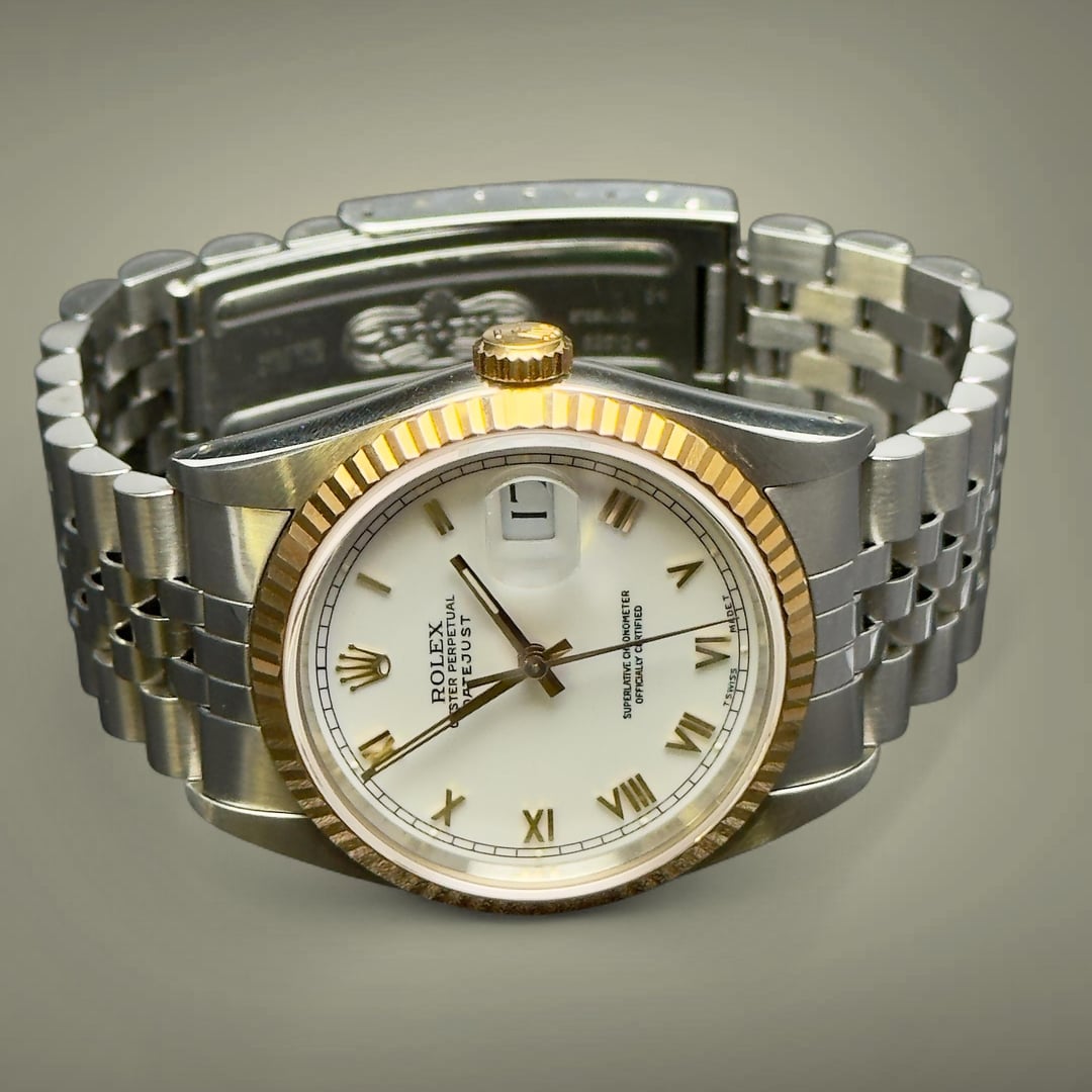 | ROLEX DATEJUST 16233 WATCH 18K GOLD/STEEL 36MM FLUTED BEZEL WHITE ROMAN DIAL brocspradlin (1140) |