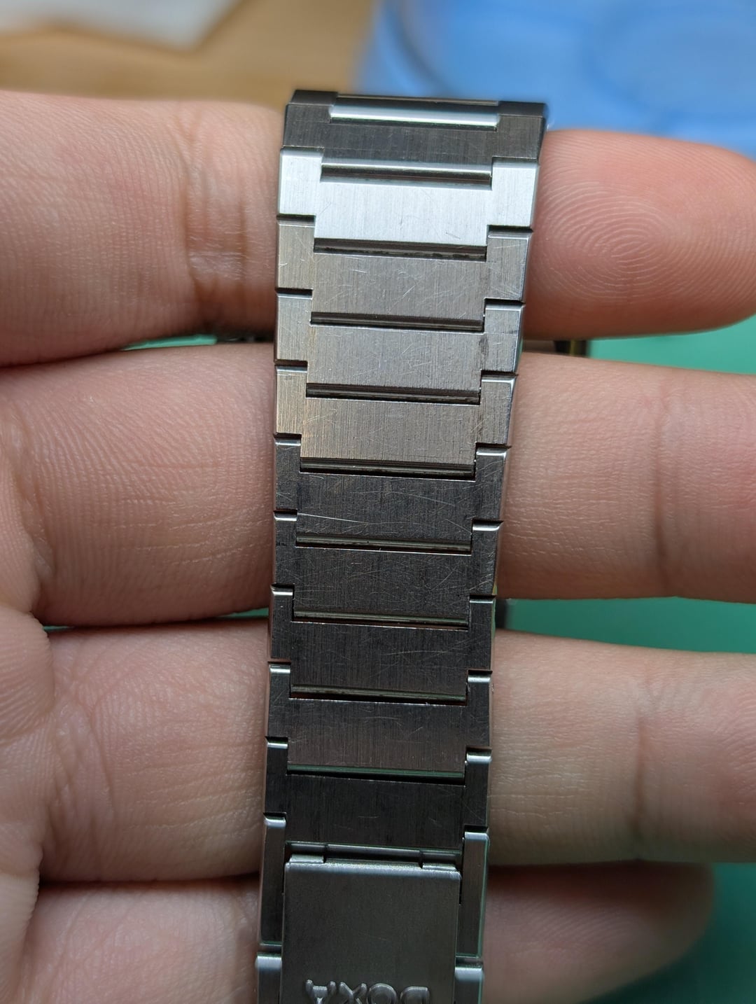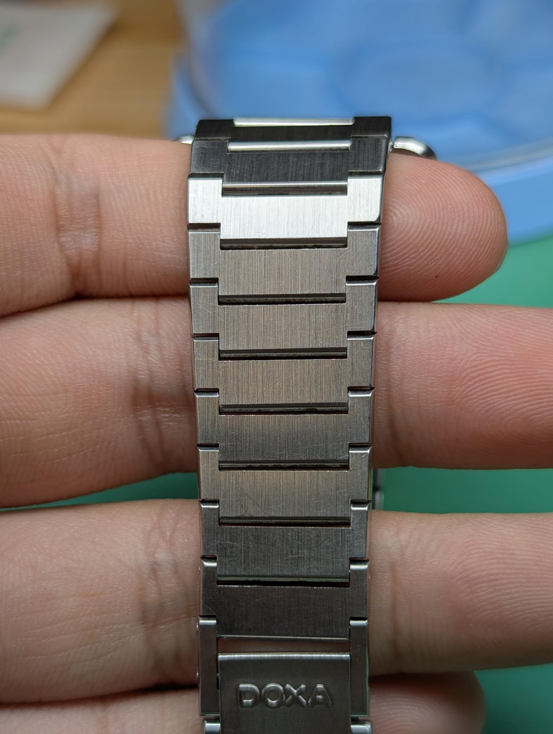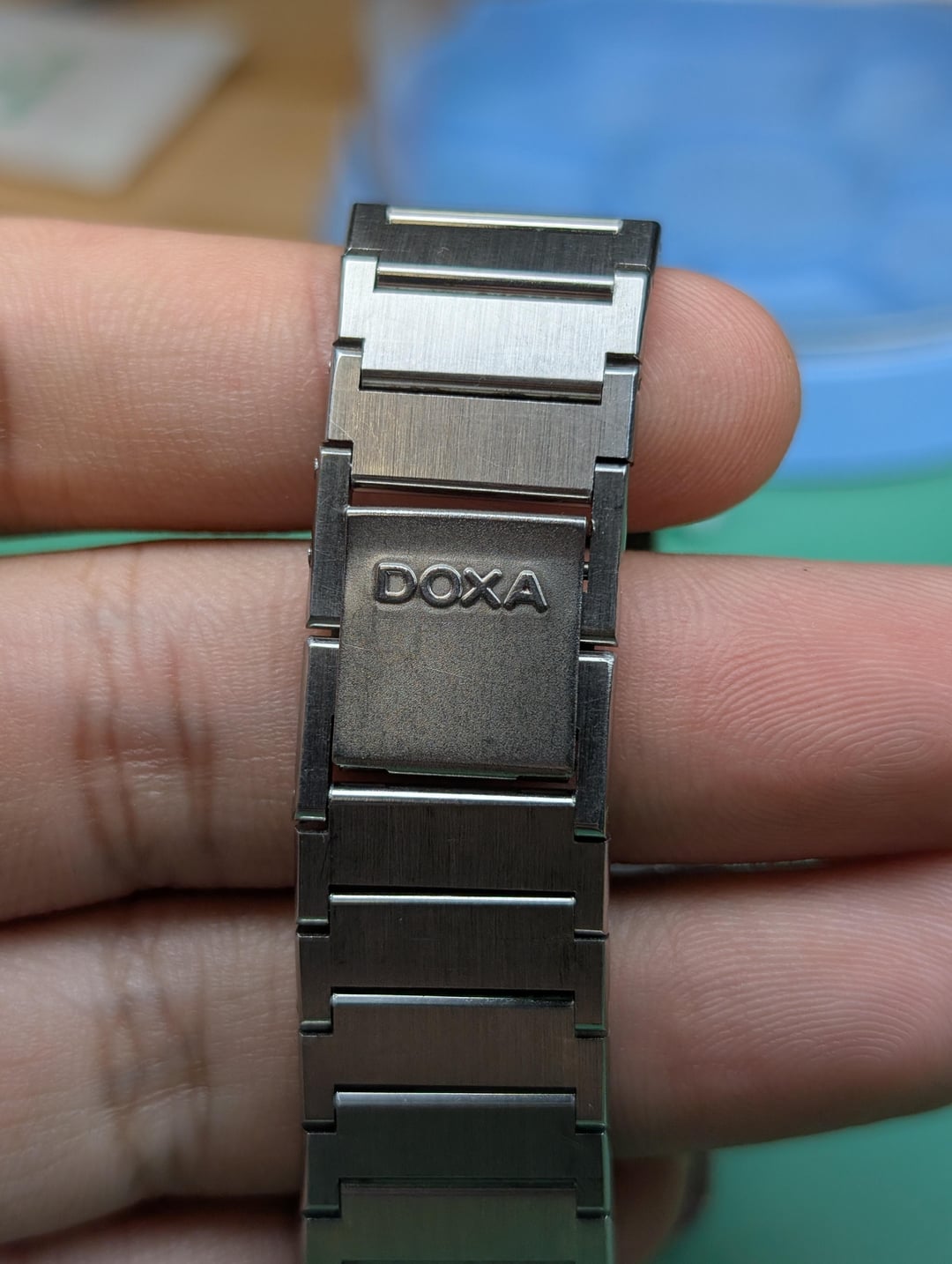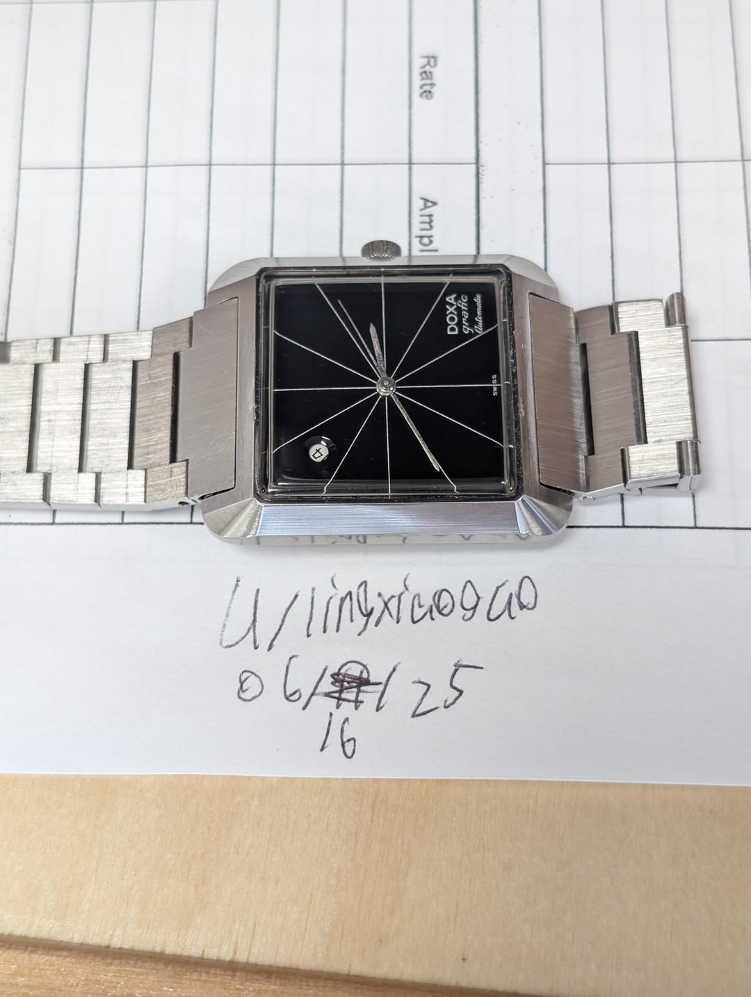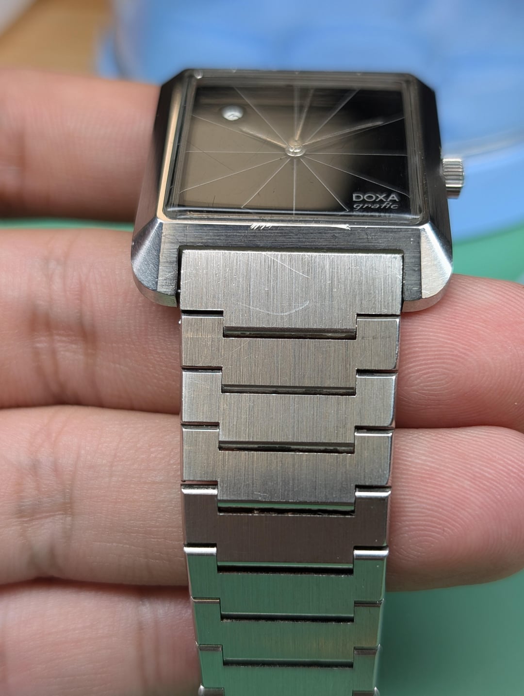 For sale today is my Doxa Grafic. Doxa is most known for their cushion case divers with decompression bezels, but they also made many interesting dress/everyday pieces like this one. These space age square dress watches were made by Doxa from the early 60s through the 70s. This one has a synchron signed crown and inner caseback which dates it to the early 70s. The highlight of this example is that the original matching flat link bracelet is included. This bracelet is extremely rare and of excellent quality for its time composed of entirely solid links. The fitting end links give the watch a very sleek look. Cosmetically the watch is in good condition for its age. Some scratches and dents throughout. The case geometry is excellent and it seems the watch was never polished. Mechanically the watch had just been serviced and is keeping good time with strong amplitude. I'm asking ~~$650~~ $499 shipped for this piece. International shipping at buyer's expense. PayPal G&S is available at my discretion. Thanks for reading!
