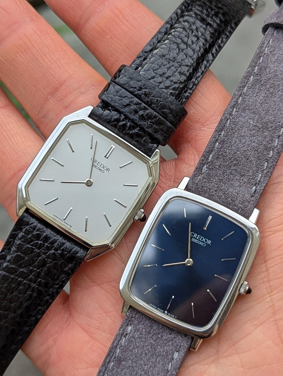 Hi folks, up for for sale or trade is a pair of JDM quartz Credors from the 1980s. Highly prefer to sell as a pair and the pricing reflects that, but open to discussing individual sale as well. Open to trades too! **White dial 6020-5080: watch only on original strap** 28.3mm across, 32.4mm lug to lug, 4.3mm thick, 18mm lug width **Blue dial 6020-5170: watch on an aftermarket strap, original strap, additional handmade croc strap, original outer and inner box** 27mm across, 37mm lug to lug, 4.8mm thick, 17mm lug width Album with video and timestamp: [https://imgur.com/a/o4wITzW](https://imgur.com/a/o4wITzW) Happy to show the watch on a video call. I live in the Nova / DC area, and can do face to face meet so you can handle the watch and I can save on some shipping :) Asking $600 through Venmo or Zelle. Thanks for taking a look!