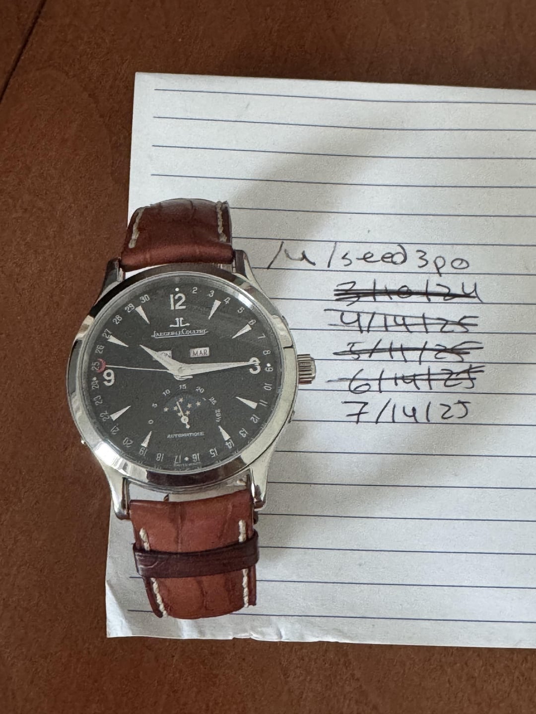 Specifications Brand: Jaeger-LeCoultre Model: Master Control Calendar Reference: 140.8.98.S Case Material: Stainless steel Diameter: 37 mm Lug Width: 19 mm Thickness: 10.3 mm Lug-to-Lug: 43.3 mm Dial: Black Lume: Super-LumiNova Crystal: Sapphire Movement: Automatic Caliber: JLC 891/448 Bracelet/Strap: JLC tan alligator strap with signed deployant buckle Full Kit (Box and Papers). Price $5500 Looking to trade up for a SeaQ