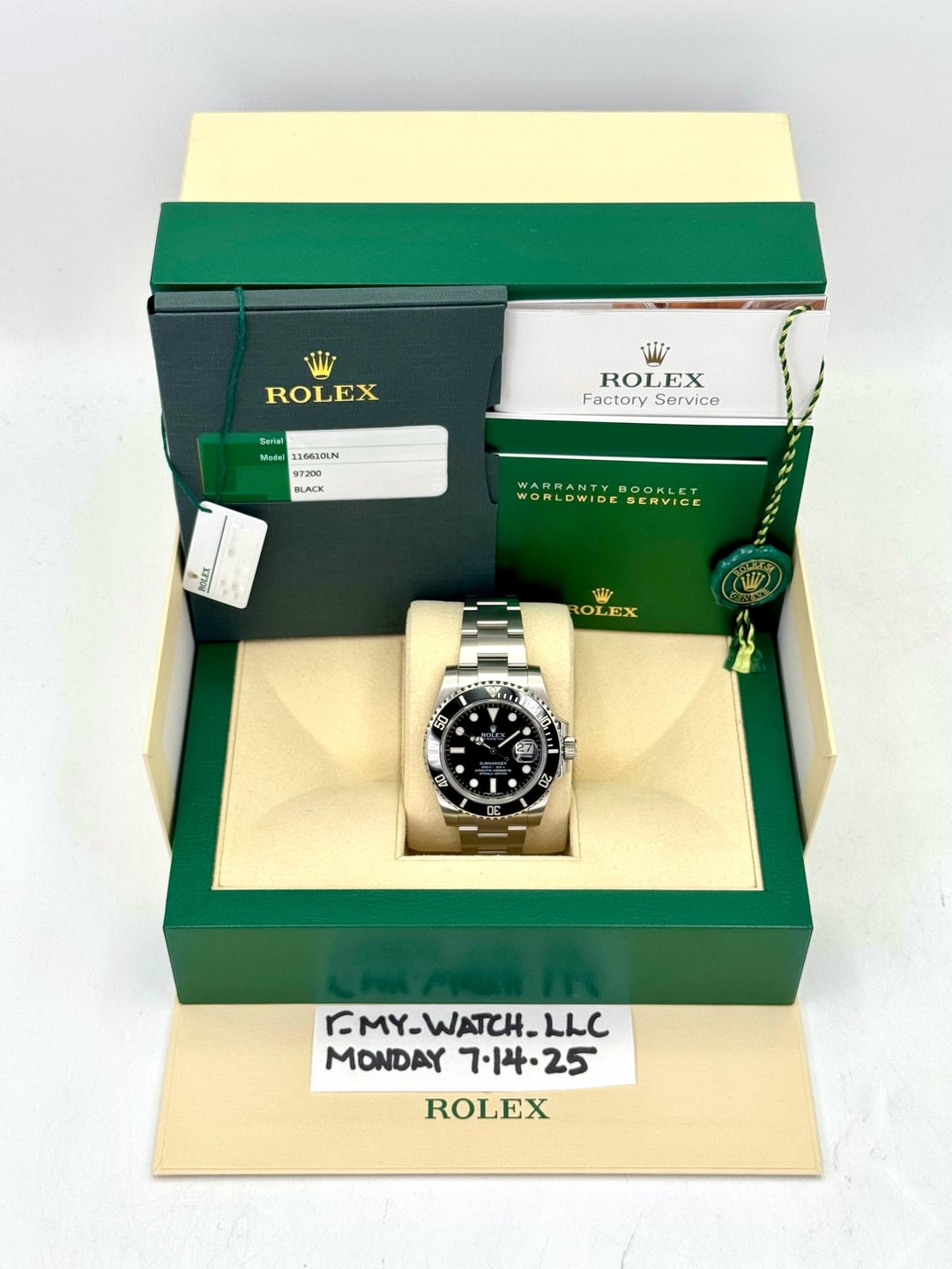 🔵2016 Submariner Date 40mm 116610LN Oystersteel Aka Stainless Steel with Black Dial, Oyster Bracelet **Includes the following:** **✔️Original Rolex Double boxed** **✔️Box and Papers - Yes** **✔️Warranty card dated 2016** **✔️Manual and Warranty Booklets** **✔️Green and White Hang Tags included** **✔️Size: 8.25inch wrist (Full Links)** **✔️Material: Stainless Steel** **✔️Watch is in excellent overall condition. Please see photos for details.** **✔️**[**Trades**](https://mywatchllc.com/pages/sell-rolex-watch) **welcome** **✔️Appraisal included** Business Name: **My Watch LLC** LOCATION: Oak Park, Michigan ✔️[MyWatchLLC.com](http://mywatchllc.com) for current inventory ✔️Google Business Listing [https://g.co/kgs/Cmd6FPW](https://g.co/kgs/Cmd6FPW) ✔️Business Hours M-F 9-6 ✔️Facetime/Video chat/calls welcome to view the watch interested. ✔️Contact: 248-422-0909 via text or call for quickest response. 🟢TERMS: Visit [MyWatchLLC.Com](http://mywatchllc.com) for payments accepted 🟢REFERENCES/REVIEWS: We are well reviewed on all platforms from google, trust pilot, rolexforums, additionally we have 300+ reference in multiple FaceBook watch groups, reference checks welcome. 🟢SHIPPING: If you are not local, we offer Fully Insured FedEx overnight shipping in the USA for a fee. International shipping available. [https://mywatchllc.com/products/2016-rolex-submariner-40mm-116610ln-stainless-steel-black-dial](https://mywatchllc.com/products/2016-rolex-submariner-40mm-116610ln-stainless-steel-black-dial)