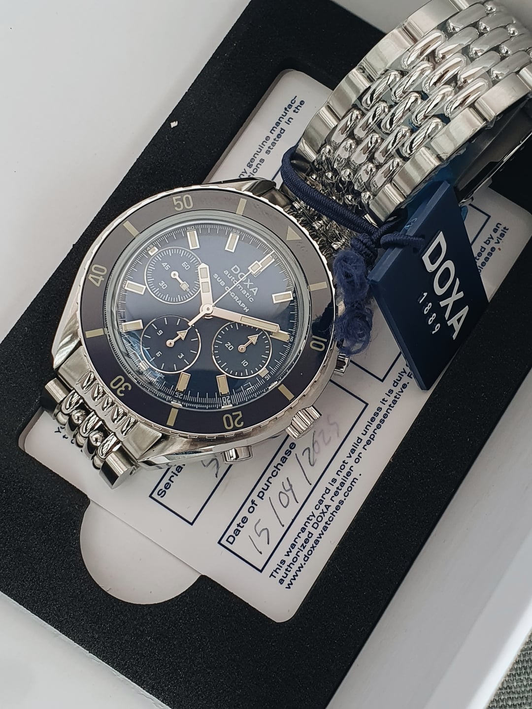 For sale is a Doxa Sub 200 C-Graph in the Caribbean colourway. The watch has all the stickers and was never worn or sized. It was purchased on 15/04/2025 at a Doxa AD, so it still has almost 2 years left on the warranty. I’m selling it because it’s an unwanted gift. **Condition:** New, never worn. See detailed photos for full condition and clarity. **Case Size:** 45x 49mm case with a thickness of 17.5mm and 21mm lug width. **Movement:** Swiss automatic movement, 27 jewels, 28,800 bph and a 48-hour power reserve. **Other information:** * Full kit with box and papers. **Price:** Asking $2,250. Please add $120 for worldwide shipping. Payment methods include Wise, ACH transfer, Revolut, Bitcoin (On-Chain or Lightning), or PayPal G&S for buyers with solid references. Add +6% for currency conversion fees on the latter. I’m located in Portugal, but worldwide shipping isn’t an issue. Established seller with over 220 transactions – buy with confidence! Make sure to follow me on Instagram (@daily.worn) to check out the newest additions. Happy to answer serious inquiries. No trades, no lowballs. [Pictures](https://imgur.com/a/NdOSxkD) [Timestamp](https://imgur.com/a/XUtKKXD)