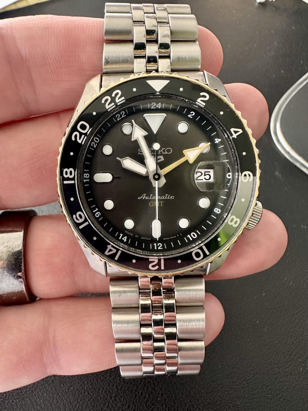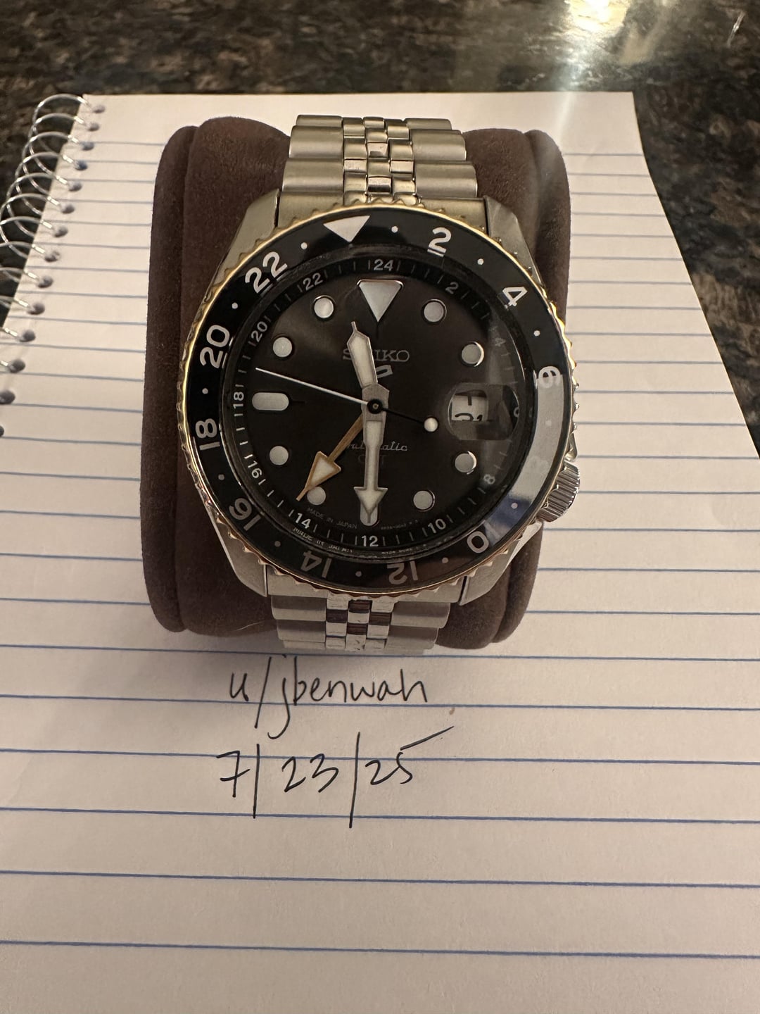 Selling my Seiko 5 GMT SSK021 “U.S. Special Creation” Automatic. Also referred to as a “Guinness.” Love these so I’m probably moving to another soon. Charcoal gray dial. 42.5mm diameter. Jubilee bracelet. 22mm lug. Caliber 4R34. 100 meter water resistance. $240 shipped CONUS (or best offer) Album: https://imgur.com/a/kVRTRbc Timestamp: https://imgur.com/a/ycrGIt2 Prefer Zelle, Paypal & Venmo (both F&F) with positive feedback. If G&S please add 3%. Long sales history on eBay and X. Please reply here before Chat.
