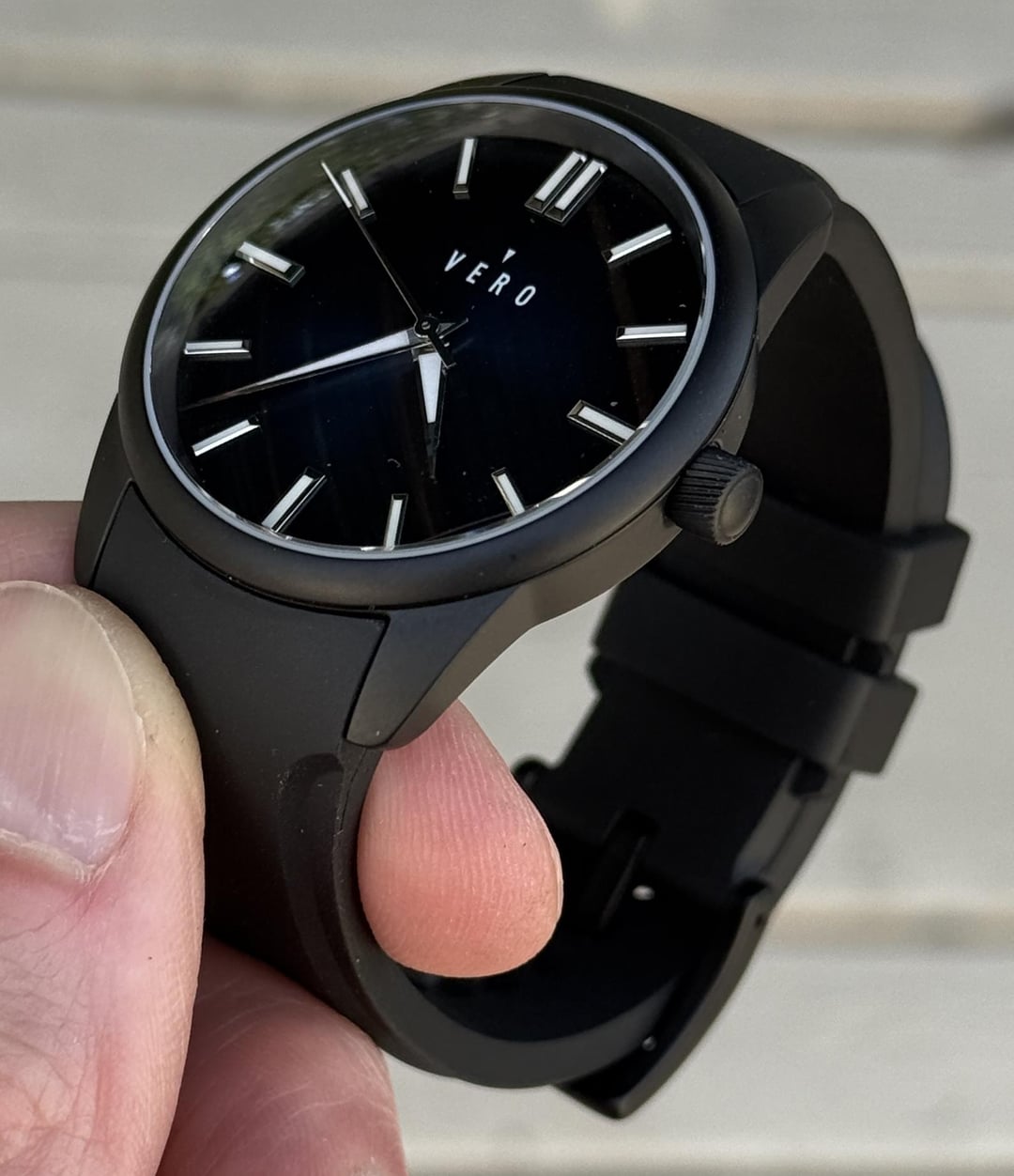 I wore this a few times but it's still in flawless condition. I put it on an aftermarket strap, the stock rubber strap was never used. This is the "blue pool deep fade" color but it looks black in a lot of lighting conditions. It's a midsize watch, 38mm diameter, 44.5 lug to lug, 12mm thick but that includes the domed crystal, it wears thinner. Vero has a 10 year warranty, I bought this a few months ago. Located in San Jose, CA. $110 shipped in the US.