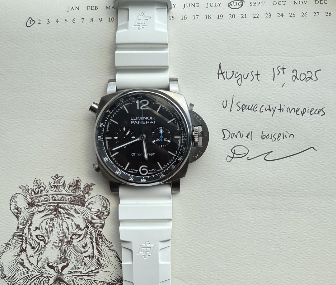 🔥 Panerai Luminor Chrono PAM01109 – Full Set + Custom Straps 🔥 2021 Panerai Chronograph that brings rugged elegance with daily versatility. Comes loaded with strap options and full kit—ready to wear out the box or dress up/down depending on the vibe. 🧊 Specs: • Model: PAM01109 • Case Size: 44mm • Movement: Automatic Chronograph • Case Material: Stainless Steel • Dial: Black with blue chrono hand + tachymeter scale • Crystal: Sapphire • Water Resistance: 100m • Warranty Active through August 2029 • Serial: OP7318PL0101882 📦 What’s Included: • Outer black box • Inner Panerai wooden box • Original black leather Panerai strap • White OEM rubber strap • Blue aftermarket strap • Custom brown leather strap (killer combo!) • Panerai tools & screwdriver • Booklets + warranty card (dated Aug 2021) • Currently mounted on white OEM rubber for a clean summer-ready look 📸 Condition: • Excellent pre-owned condition • Case and crystal are clean • Chronograph runs as it should • Extremely wearable and sharp with tons of wrist presence ⸻ ✅ Ships fully insured via FedEx Overnight Priority ✅ Plenty of references + 5-star Google reviews ✅ Trusted seller – IG: @SpaceCityTimepieces 📲 DM to lock it in – serious buyers only, no holds without deposit