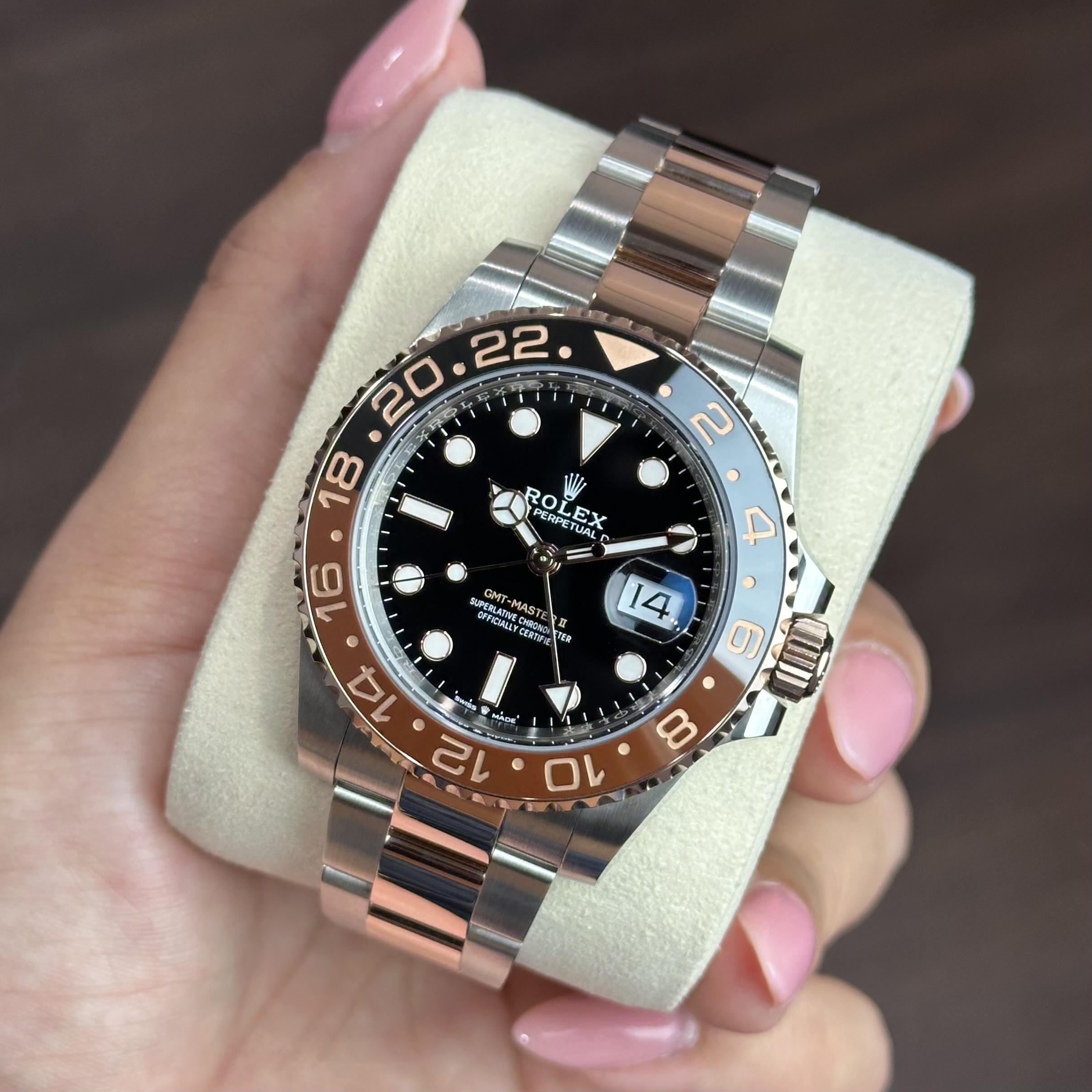 Timestamp: https://imgur.com/a/4n04JDv Album: https://imgur.com/a/k9WVnZd ________________________________________________________________________________________ The Rolex GMT-Master II “Rootbeer” 126711CHNR (2025) combines rugged travel functionality with luxurious design. Crafted from Oystersteel and 18k Everose gold, it features the distinctive black and brown Cerachrom bezel and a black dial with warm Everose accents. Powered by the calibre 3285 for precise dual-time capability, this 40mm model is in mint condition with only slight hairlines and comes complete with its original box and papers—a standout piece for the discerning collector. This watch measures 40mm diameter, 48mm lug to lug, and 12mm thick. **Condition:** Mint condition with slight hairlines. Photos reflect the condition. **Includes:** This example comes with its original box, papers and accessories. _________________________________________________________________________________________ **Price:** **20,500** **Shipping:** Free shipping to US addresses! I'm willing to ship internationally at an additional cost to the buyer. *Local pickup available at our Scottsdale, AZ office. Sales tax may apply.* **Payment:** Wire, Zelle, Crypto, or CC (with 4% fee). **Trades:** Yes, open to trades up or down for modern Rolex, AP, or Patek Philippe. Thank you for your consideration and feel free to reach out with any questions! -Aneisa