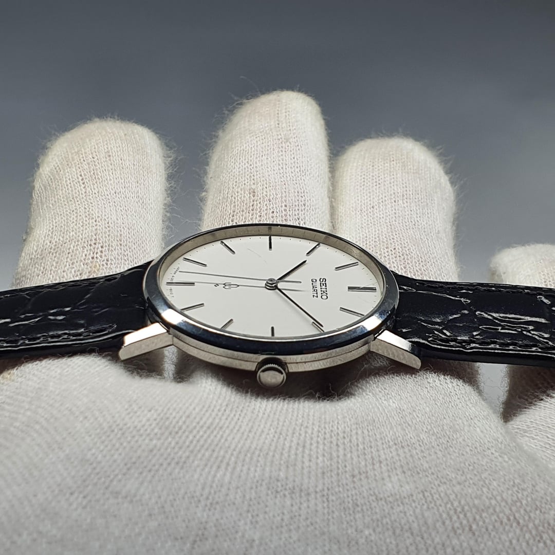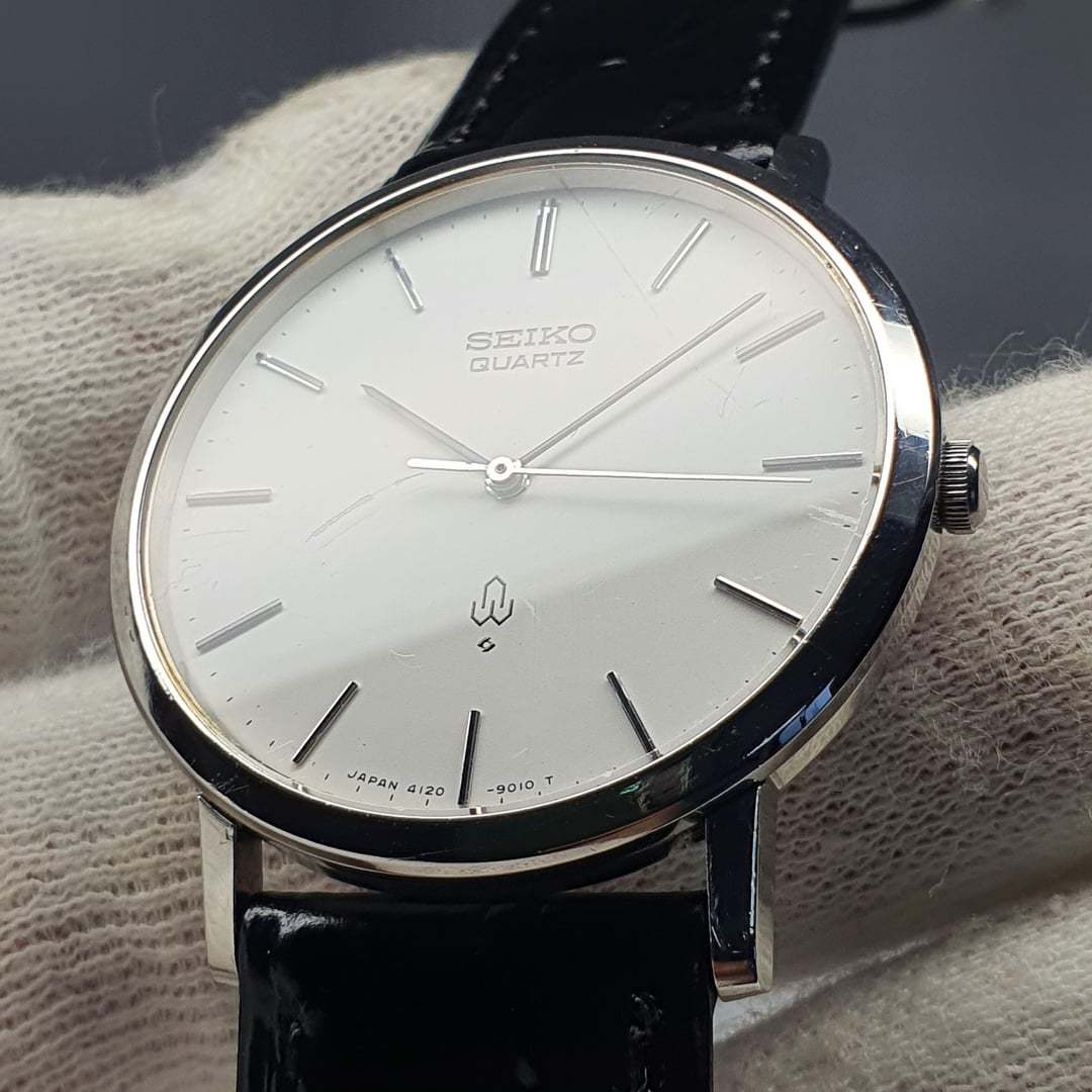 For sale is this vintage Seiko "Chariot" (4120-9010), made in Japan in October 1976. The "Chariot" dress watch series by Seiko is known for it's thinness, elegant design and high-quality quartz movements. This example, reference number CNC020, is absolutely stunning with its looks through simplicity. The dial is a creamy white that has an unexplainable depth akin to enamel which contrasts nicely to the black pencil hands for legibility. The seconds hand is a matte silver to differentiate between the seconds hand minutes hands. The stick baton hands are high-polish on the sides and have a black centre for attention to detail and legibility. The Seiko logo, single-crystal quartz symbol, Suwa swirl symbol and text at the bottom of the dial are in black. The Suwa swirl logo indicates that the watch was designed and manufactured by the Suwa factory during their fierce rivalry with the Daini factory. The case is in fantastic shape with all the sheen from the factory polish still mostly intact. I think there is something respectable about getting the simple design of this fundamental wrist watch shape so right. It all comes down to the small details in the angles, bevels and the proportions. There's a very fine line between a boring design and an elegant design that this watch manages to stay firmly on the correct side of. The calibre 4120 movement was, at the time of its release in 1974, used by Seiko to brag about creating "The World's Thinnest Quartz Watch" in advertisements. It was also the first quartz movement that was possible to produce in volumes. The watch is in great shape considering it is almost 50 years old. As mentioned above, the case is in fantastic shape, the dial is spotless although the crystal has some light scratches. Comes on a brand-new soft and supple leather strap. Dimensions are: 34mm x 39mm x 7.9mm Lug Width 18mm Looking for $160 net (buyer pays Paypal fee) International Tracked Shipping $10 Bought in Japan. More pics: [https://flic.kr/s/aHBqjCpqrm](https://flic.kr/s/aHBqjCpqrm) \*Returns accepted but all return postage costs are the buyer's responsibility in all circumstances