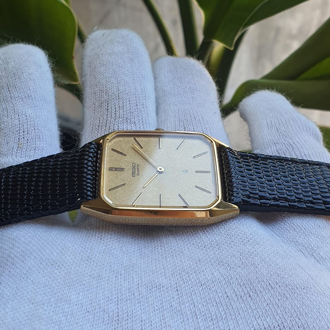 For sale is this vintage Seiko "Chariot" (5930-5460), made in Japan in July of 1983. The "Chariot" dress watch series by Seiko is known for its thinness, elegant design and high-quality quartz movements. This example, reference number CFX974, is no exception with its classic styling. The dial is a beautiful subtle textured gold "paper" that gives a nice contrast with the high-polish gold pencil hands that have a thin black centre. The stick baton markers echo the hands with their high-polish gold surround and black centres for legibility. There is no need for a seconds hand on this design to streamline the simplicity and to indicate to others that the wearer is in no rush. The Seiko logo, single-crystal quartz symbol and print at the bottom of the dial are all in black. The Daini lightning bolt symbol signifies that the watch was designed and manufactured by the Daini factory during their fierce rivalry with the Suwa factory. The square (or octagonal) case is well-proportioned and nods to the famous Cartier Tank in its design although the dial stretches to the edge, giving it a "frameless" look while giving priority to the gorgeous dial. As stated earlier, the "Chariot" series was designed to be elegant and thin, this watch being only 5mm thick, would slip right beneath the cuff of a suit. The calibre 5930 movement is a robust workhorse and has some nice detailing that make it far prettier than the often cheap-looking quartz movements of today. Accurate to within 15 seconds per month (twice as accurate as Casio's famous F-91W). The watch comes on a brand new lizard-style black strap. The watch is in good condition for its age of over 40 years old. The crystal is in good condition with just a small chip at the top and one small scratch. The crown has wear. The gold is still in good condition and the dial is almost perfect. General wear expected for its age. Dimensions are: 27.5mm x 35.5mm x 5mm Lug Width 18mm Bought in Japan. Looking for $135 net (buyer pays Paypal fee) International Tracked shipping $10 More pics: [https://flic.kr/s/aHBqjCoZee](https://flic.kr/s/aHBqjCoZee) \*Returns accepted but all return postage costs are the buyer's responsibility in all circumstances.