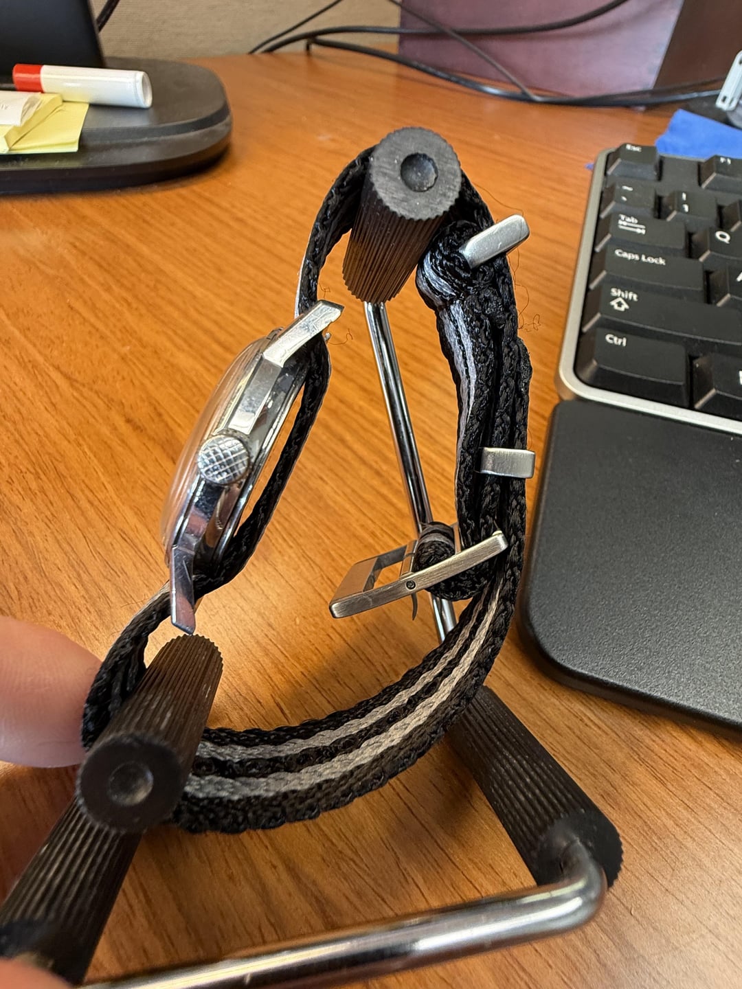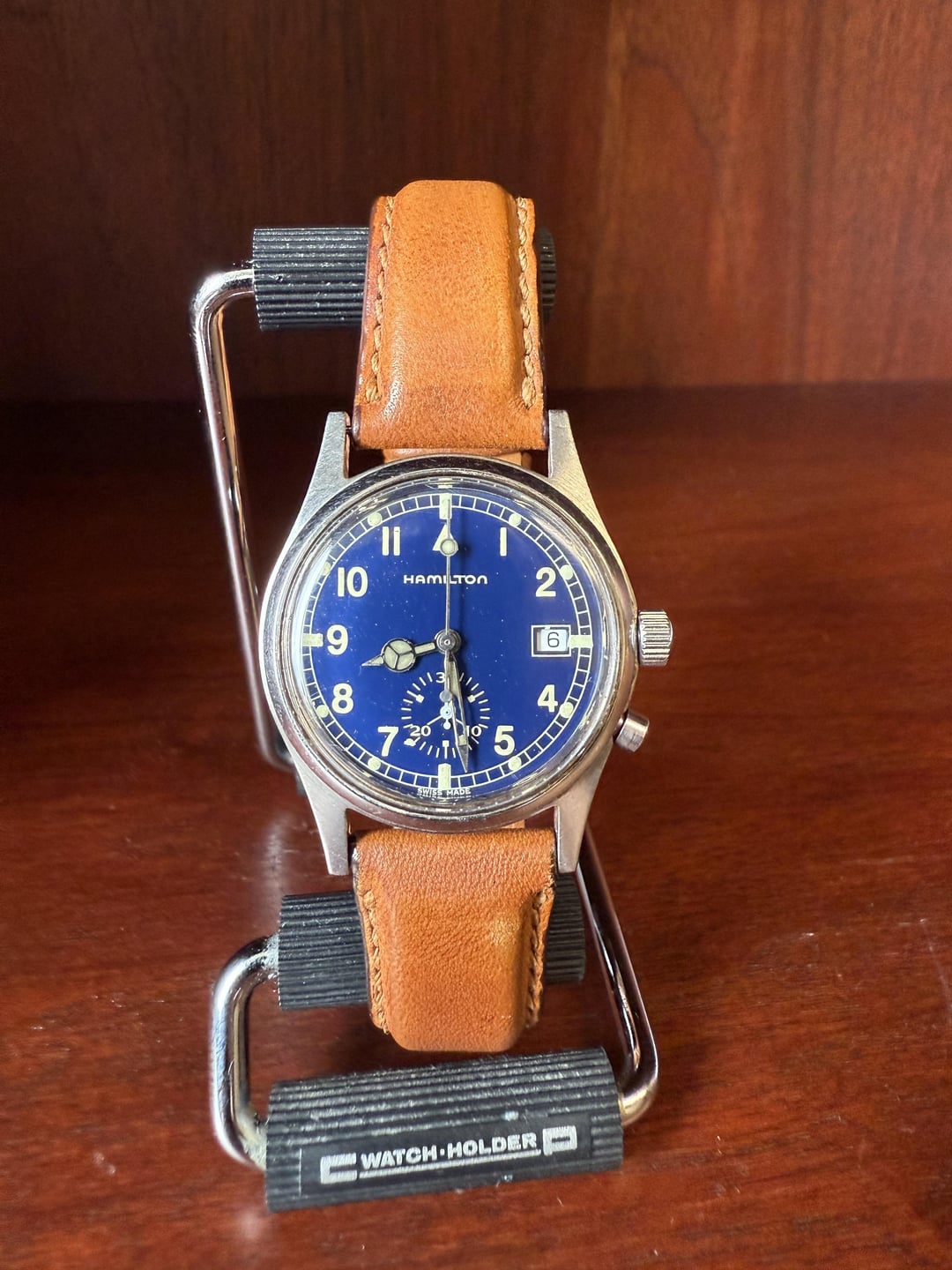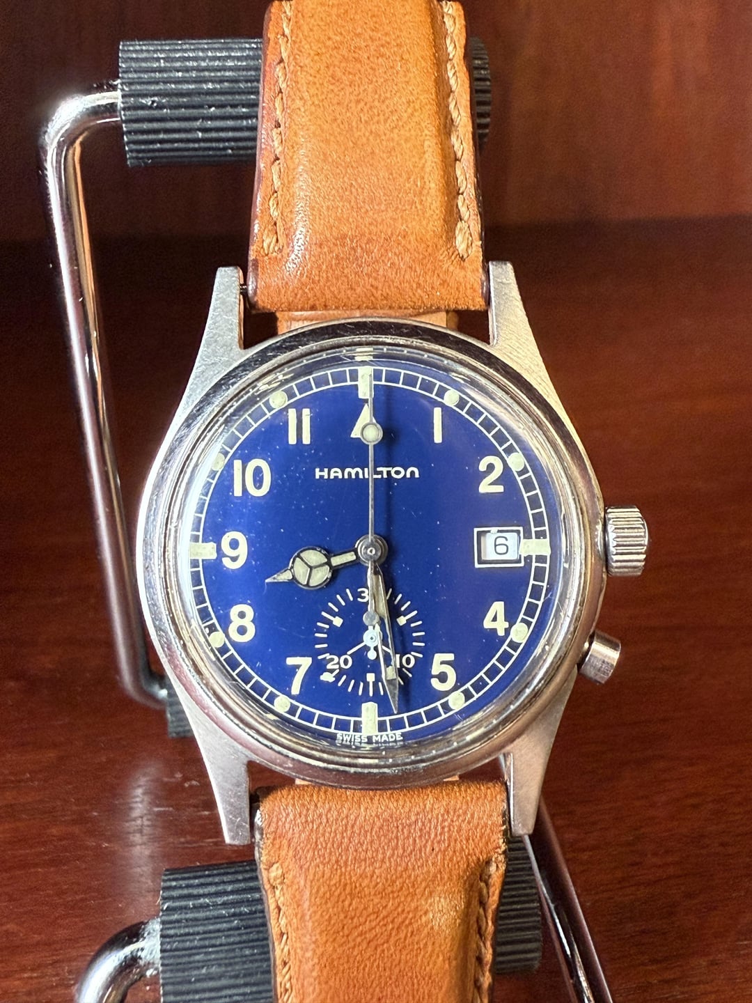 Selling 3 watches that don’t get enough wear. Various ages with unknown service history. Non hack, so I’m estimating the timekeeping based on 24hours face up. Longines Ultra-chron - $500 late 1960s model with blue dial, striking red seconds hand, and JB Champion OEM bracelet with Longines insignia (fits over 7.25” wrist). Smooth high beat movement runs like a champ, including the date quickset. Plenty of wear from age but nothing egregious. 34mm w/o crown, 40.5mm l2l, 10.5 mm thick, 18mm lugs. Running about +10. Hamilton Mono-Pusher quartz - $350 this is a 1990s model that I think would be incredibly popular if larger. It runs well and the chrono works as it should. Beautiful deep blue dial. Drilled lugs. Screw down crown. The minute hand has had like fleck off and is sitting inside the case. The size would probably work well on a bund strap. Main seconds hand moves when chrono button is pushed and subdial counts minutes elapsed up to 30. Just a really well built, interesting little design. Comes on OEM leather strap. Roughly 33mm w/o crown, 42 l2l, 9.5mm thick, 18mm lugs. Glycine Compressor - $200, 60s model EPSA made glycine, ETA 2391 automatic movement. The caseback is engraved. Interesting that only one side of the lugs is drilled. Love these quality EPSA compressors, this one runs a bit slow. Comes on a bond style one piece strap, but looks good on anything. Roughly 34 w/o crown, 42 l2l, 9.5mm thick, 18mm lugs. Running about -2 minutes. Trying to just offload these. All asking prices include shipping to the US. Interested in 2 or more, I’ll take an extra 10% off total and throw in the Seiko 3 watch leather case. I’m experienced shipping outside the US and I’m open to doing so, but please be prepared with references of your own. I prefer PayPal goods and services. If you’d like a deal, and feel comfortable with PayPal f&f, I’m open to break out fees from the asking price.