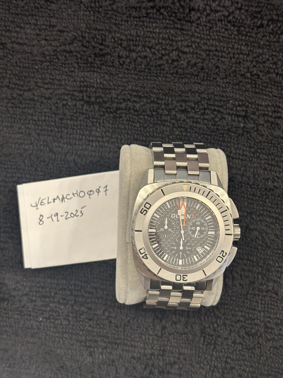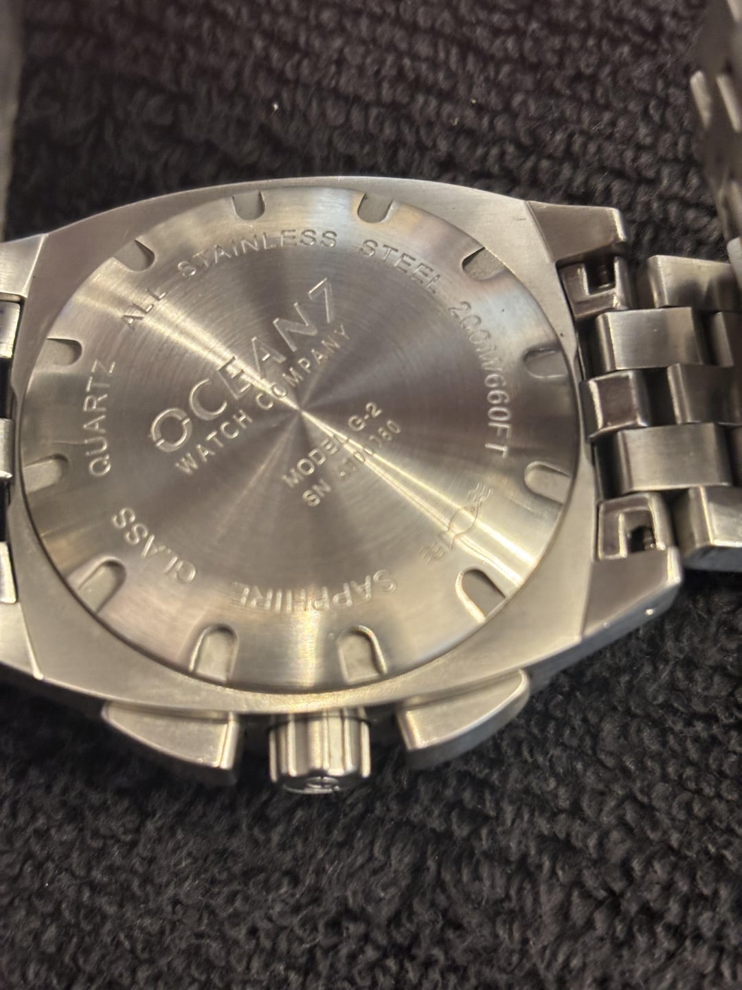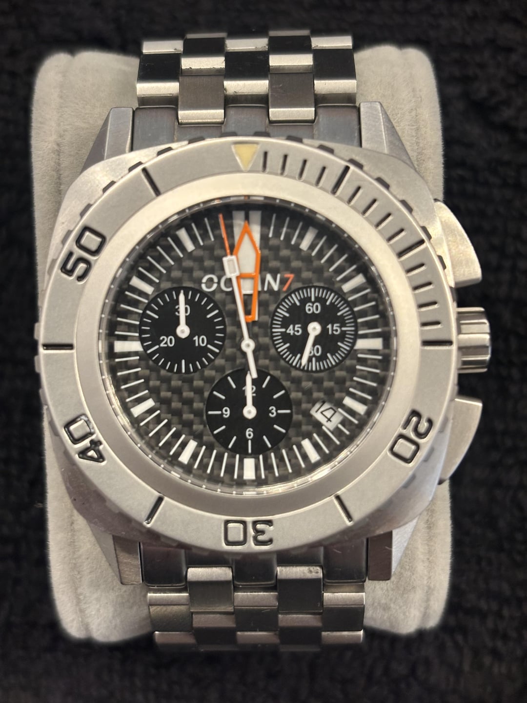 OCEAN7 G-2 Dive Chronograph - one of the early releases from O7 I am thinning a few things out of the collection so it's time to move this one. This watch is in excellent condition, I take excellent care of my watches. I am the original owner, I purchased this watch new from Ocean7 . TZ rated at 95%. The watch is in excellent condition overall. There are a few very light hairlines on caseback that don't show up in the photos. Has original better and may need replacement. *No packaging or paperwork* but all original links included, (the bracelet is currently sized for 7 1/4" wrist), extra links included. $150 firm. Shipping included.