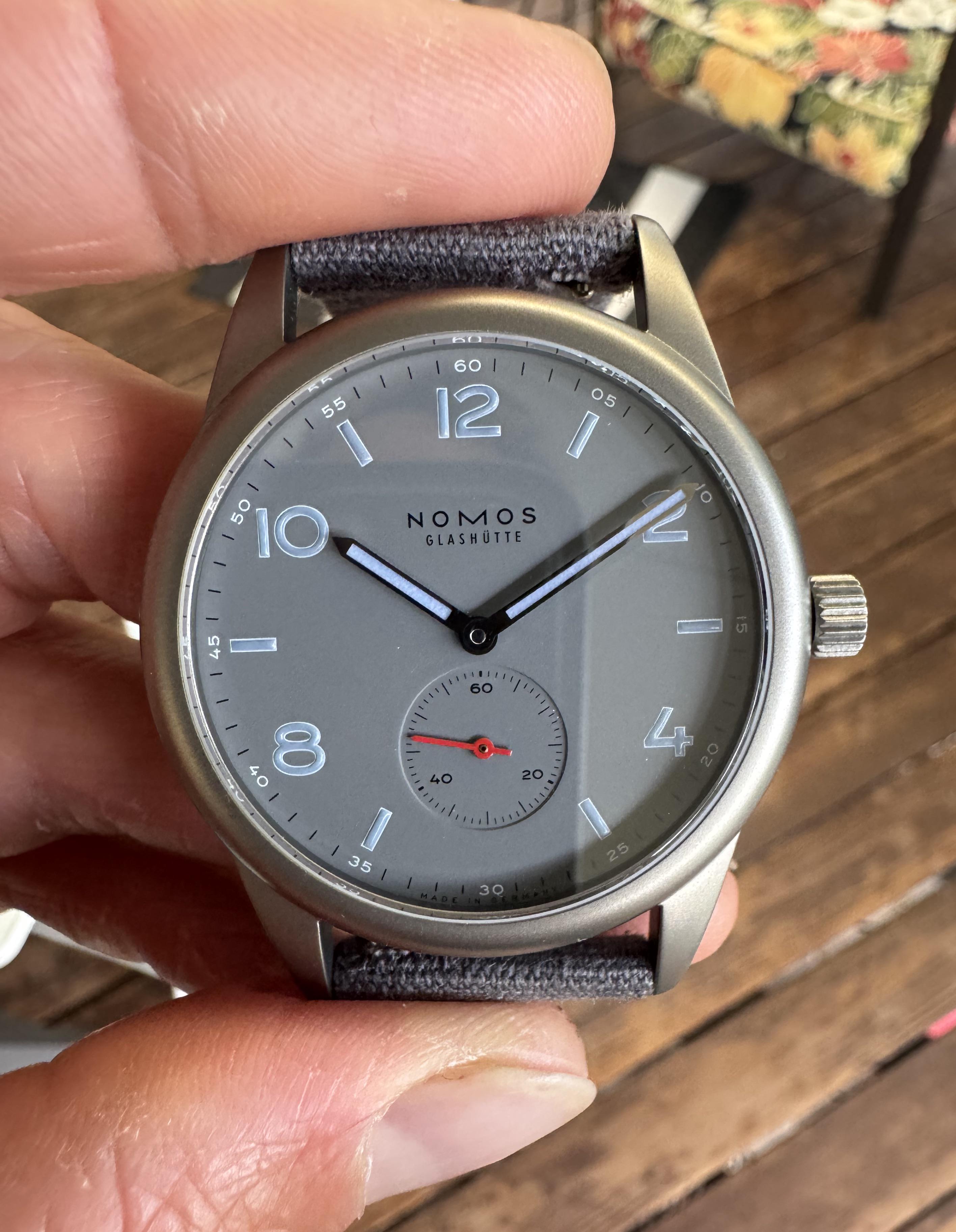 Selling a mint and rare Nomos Club. These were a 50 piece limited run for jewelry store Brinkers. The big news is the hardened steel bead blasted case (think Sinn Tegimented). This makes the case super resistant to scratches and also gives it a unique appearance. The watch is manually wound, 38mm club case with sapphire crystal front and rear. The watch is absolutely mint and timekeeping is near perfect (I don’t have a time grapher but on wrist it’s keeping within a couple seconds per day). Selling with full kit. Presentation box, warranty card and manual from Nomos, black textile strap with matching hardened steel signed buckle, additional 18mm hardened steel signed buckle, watch and polishing cloth. Can also include the Barton strap that I have it on now. Selling for $2150. [pics and timestamp](https://imgur.com/a/T0YC6jY)