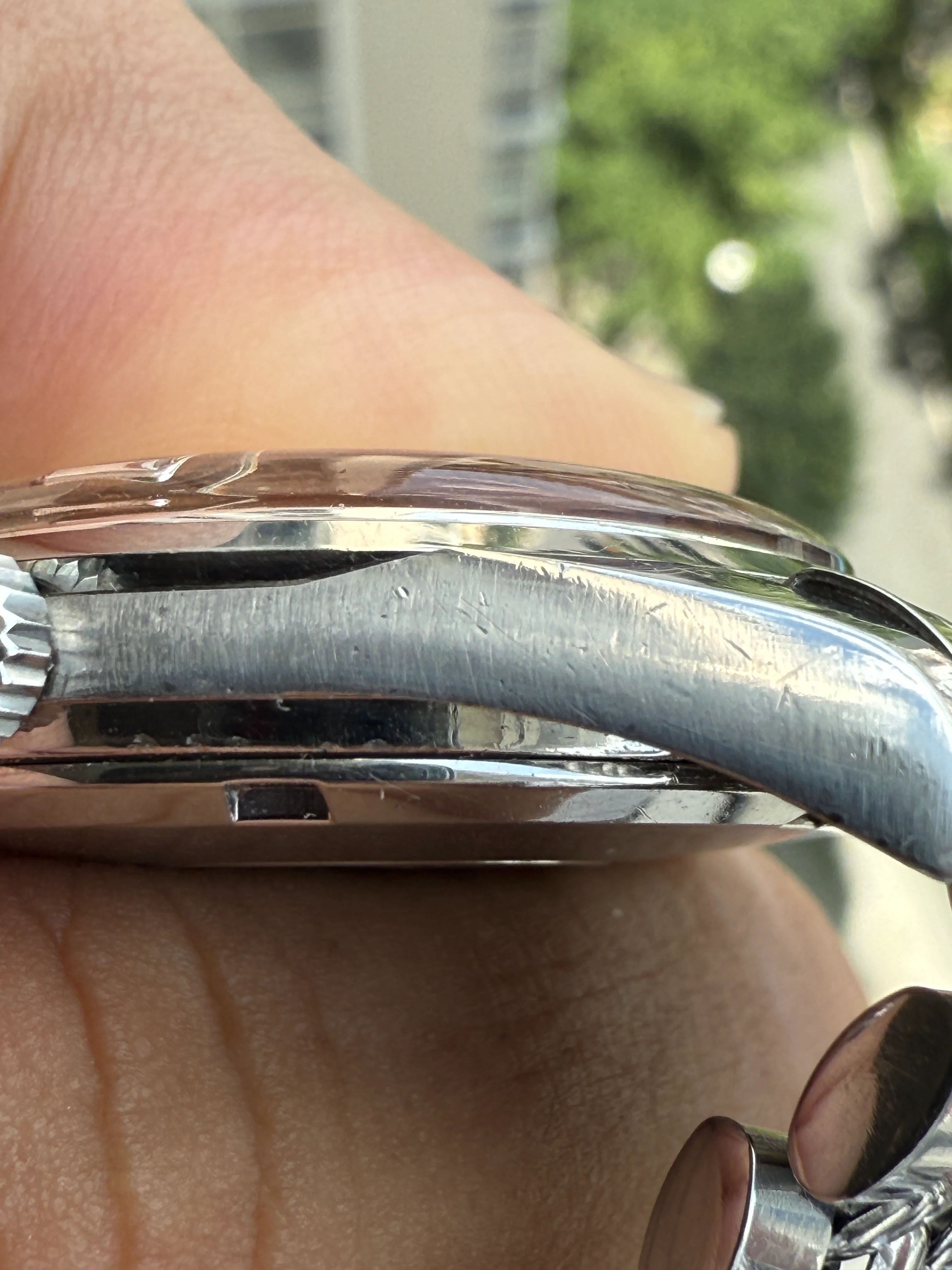 - Dial: Original white sunburst dial with black painted hour markers in good condition; faceted date-aperture frame at 3; dauphine hands; prints, hands and hour markers are all good.