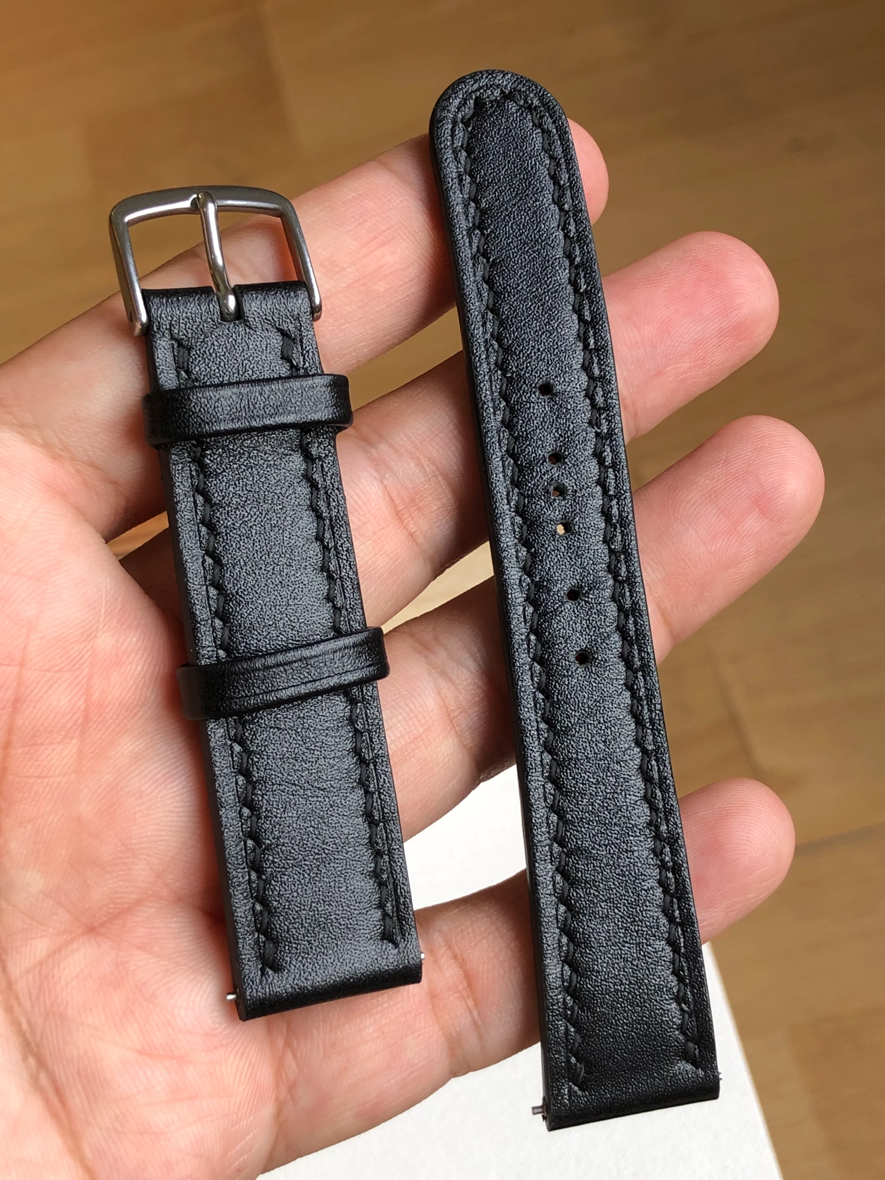 - Accessory: A handmade black leather strap with smart pins and generic buckle.