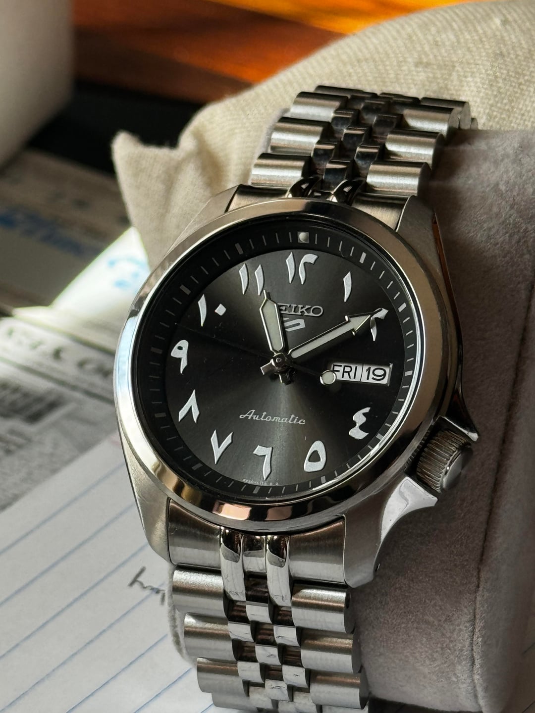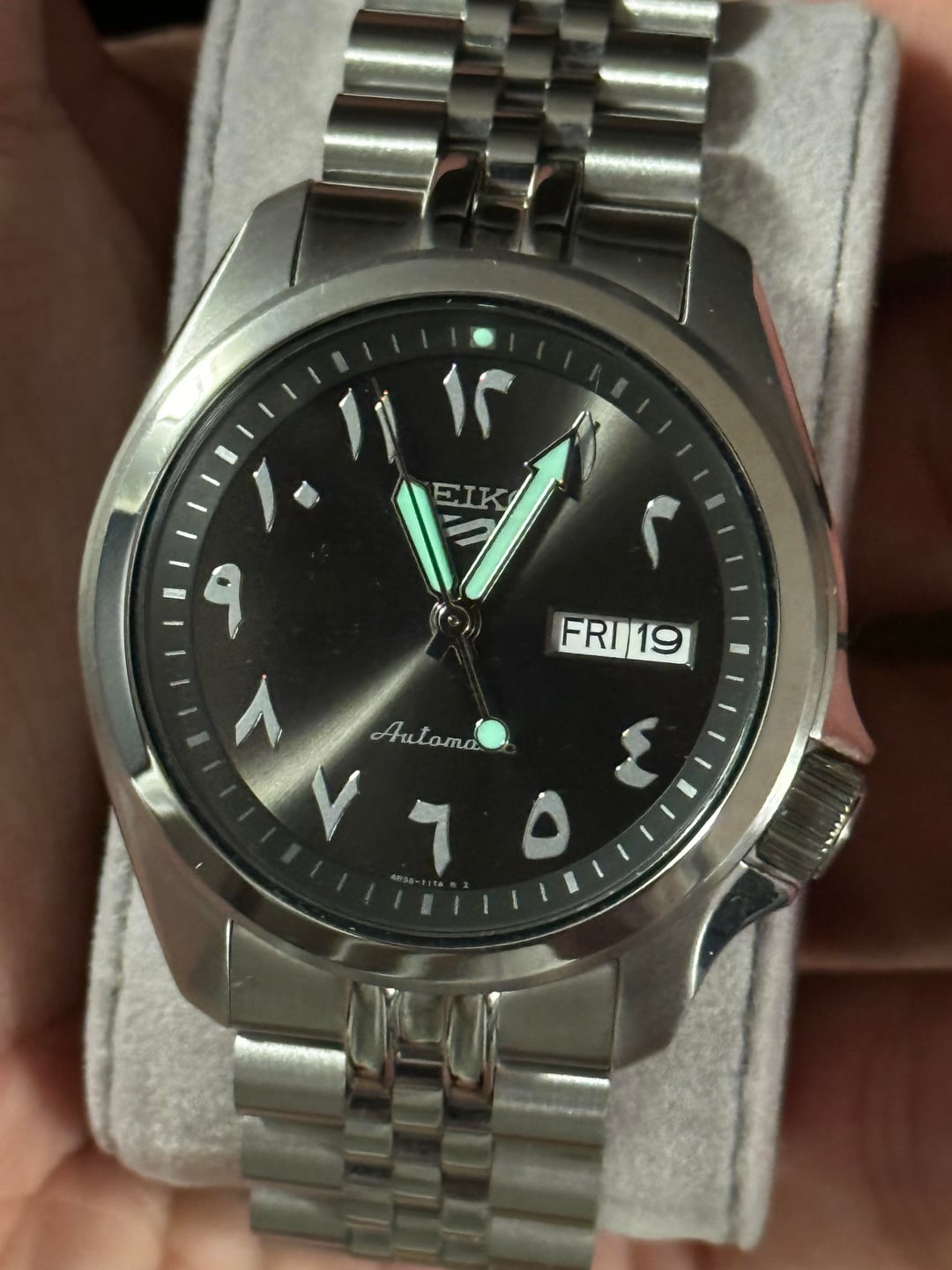I bought this discontinued Arabic dial Seiko on eBay a week ago because it was 40mm on paper. However, it fits smaller, more like a 38.5mm, it doesn’t give the wrist presence I’m going for so I’m looking to pass it on to someone who will appreciate it more. It has come to me with an aftermarket Jubilee bracelet, but the OEM bracelet also comes with the watch. Both are currently sized to a 7 inch wrist, but the extra links are on standby. (🚨The NATO strap is *not* included❗️) Unfortunately, the OEM bracelet is missing one spring bar. I removed the stickers, but it is basically in like new condition. It features a 4R36 movement and 100m water resistance. The rhodium dial catches the sun very nicely, and the day wheel can be set to Arabic letters. The manufacturer warranty still has over 2 years time. I am asking for $420 with free shipping to CONUS. Ideally CONUS only. Can take Venmo, cash app, zelle, crypto, PayPal.