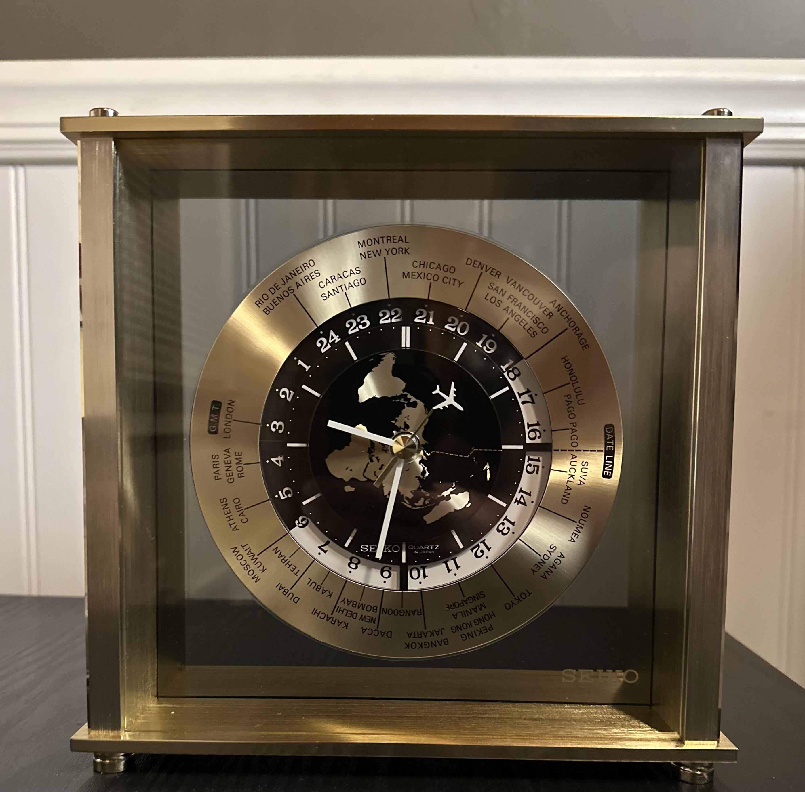 For sale is this beautiful Seiko World Time GMT desk/mantle clock in excellent condition. The clock features time setting and GMT knobs. You set the time as normal, and then set the GMT function knob to your selected time zone. The sweeping seconds hand is an airplane that spins from the North Pole starting position. Runs off of one C battery. This vintage piece is in excellent condition. There are only a couple of very tiny scratches in the finish that were hard to capture in the photos. [Photos and Timestamp](https://imgur.com/a/AxlGNfG) Asking $120 which includes CONUS shipping. Prefer Zelle, Venmo, or CashApp. Thanks for looking!