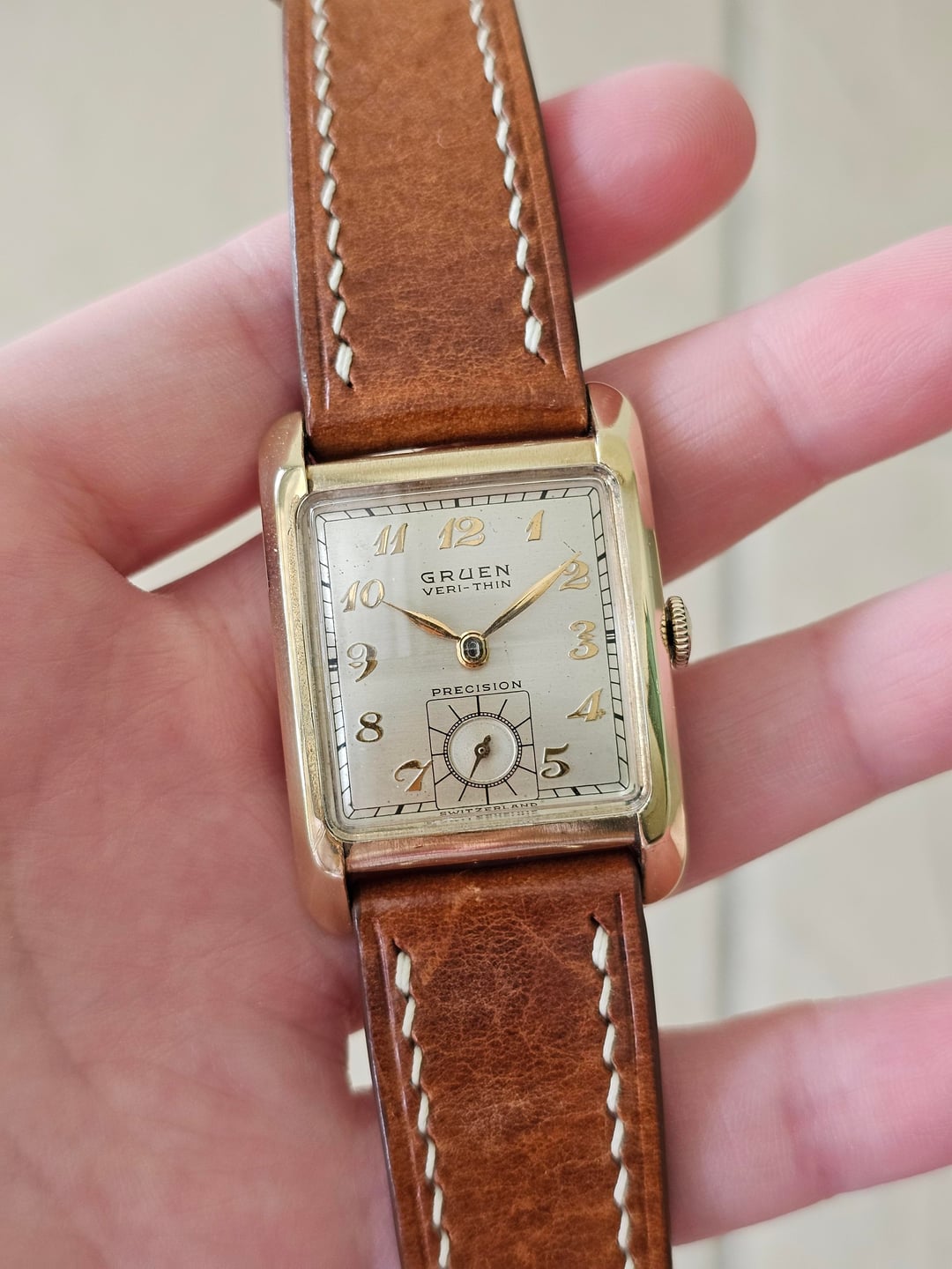 Up for sale is this beautiful vintage Gruen Veri-thin Precision art deco manual winding watch. Additional information below; Circa 1948 Cal. 425 manual winding movement by Gruen 10k gold filled case Beautiful clean dial 18k solid gold markers and hands Genuine faceted glass crystal Watch serviced August 2025 Watch keeps excellent time Comes with brand new leather strap Case size is 27mm x 36mm with 19mm lug width Asking price is $375 shipped worldwide from Malaysia. I accept PayPal (please add 5% for G&S). If you're looking for alternative payments, please dm/chat me. Timestamp: https://flic.kr/p/2ruPqDX For pictures or videos of the movement, please chat/dm me. I also have a carousell (an online platform) with over 100++ reviews, so you know that I'm a legit seller from Malaysia. Carousell: https://www.carousell.com.my/u/baebibi/ Thank you!