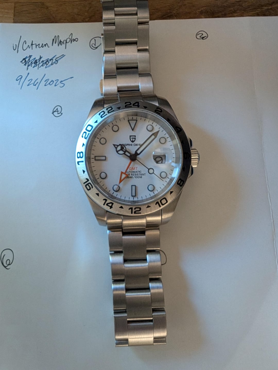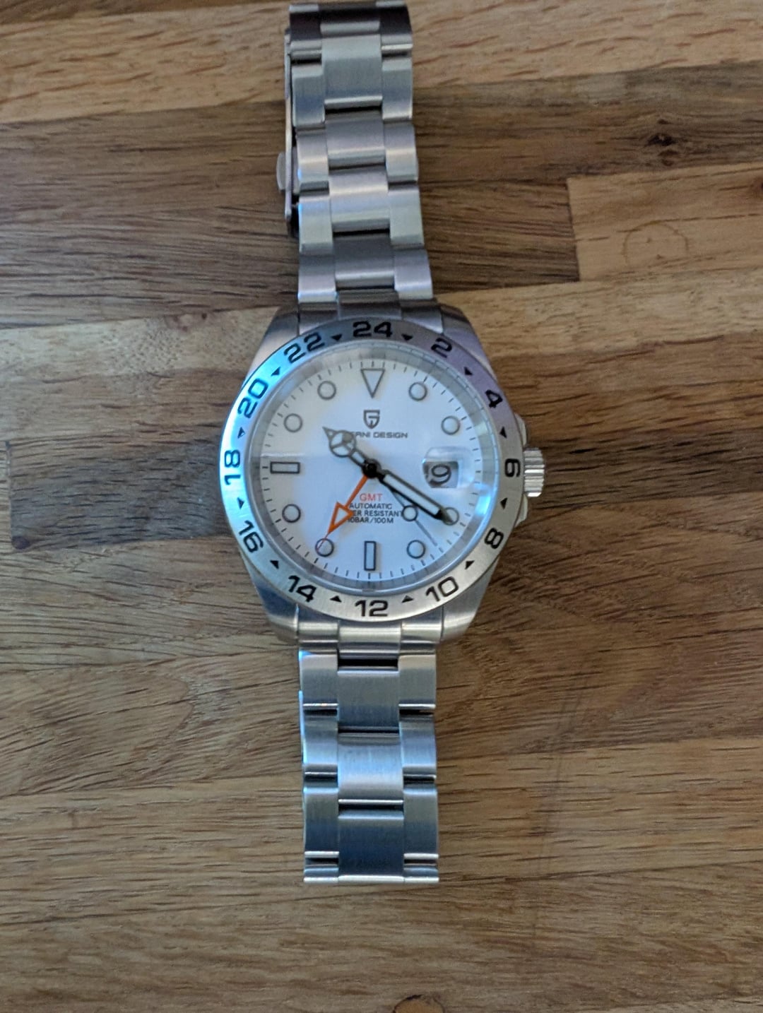 Pagani Design PD-1682 Polar Explorer - This is the larger polar explorer from Pagani. Unfortunately, it is *not* the one with the NH34 (PD-1762), but it is functionally similar. Not bad looking for a Pagani. Bracelet is sized for \~7.25” wrist, but there are extra links and should fit comfortably to around \~8” wrist. Movement: DG5388 GMT Automatic Case size: 42mm (lug-to-lug \~49mm); 13mm depth Lug width: 20mm Crystal: Sapphire Water Resistance: 100m $35 USD F&F (or $40 G&S); shipped to CONUS, payment via PayPal or Venmo.