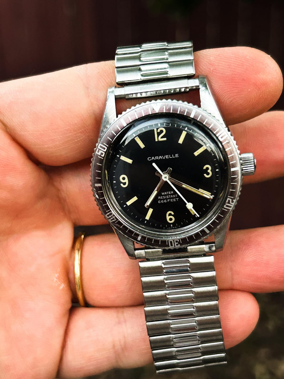 Hello All! Regrettably selling this awesome CARAVELLE SEA HUNTER. Good condition. I believe there was some lume repair done on the minute hand. Overall aesthetically pleasing and running pretty well! Comes with an NOS vintage twist-o-flex Asking $699 OBO TIMESTAMP: https://imgur.com/a/s2BG8xo