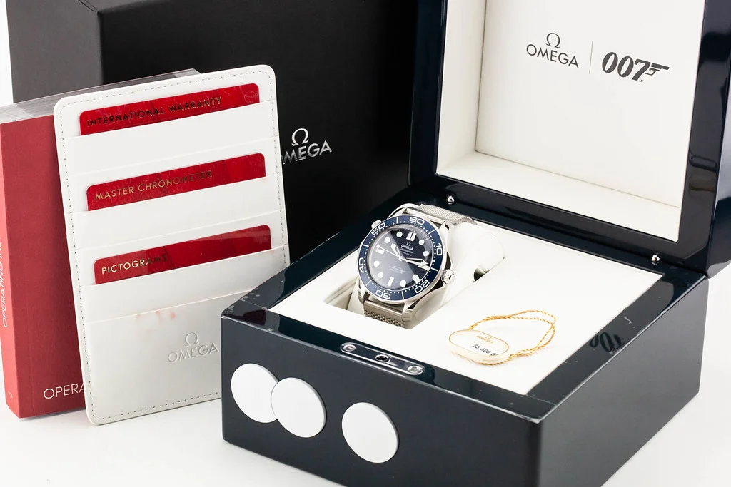 Up for sale is a brand new Omega Seamaster 300M 007 James Bond 60th Anniversary, reference # 210.30.42.20.03.002. It comes complete with all boxes, papers, booklets, hang tag, and Omega Warranty Card dated August 2025.