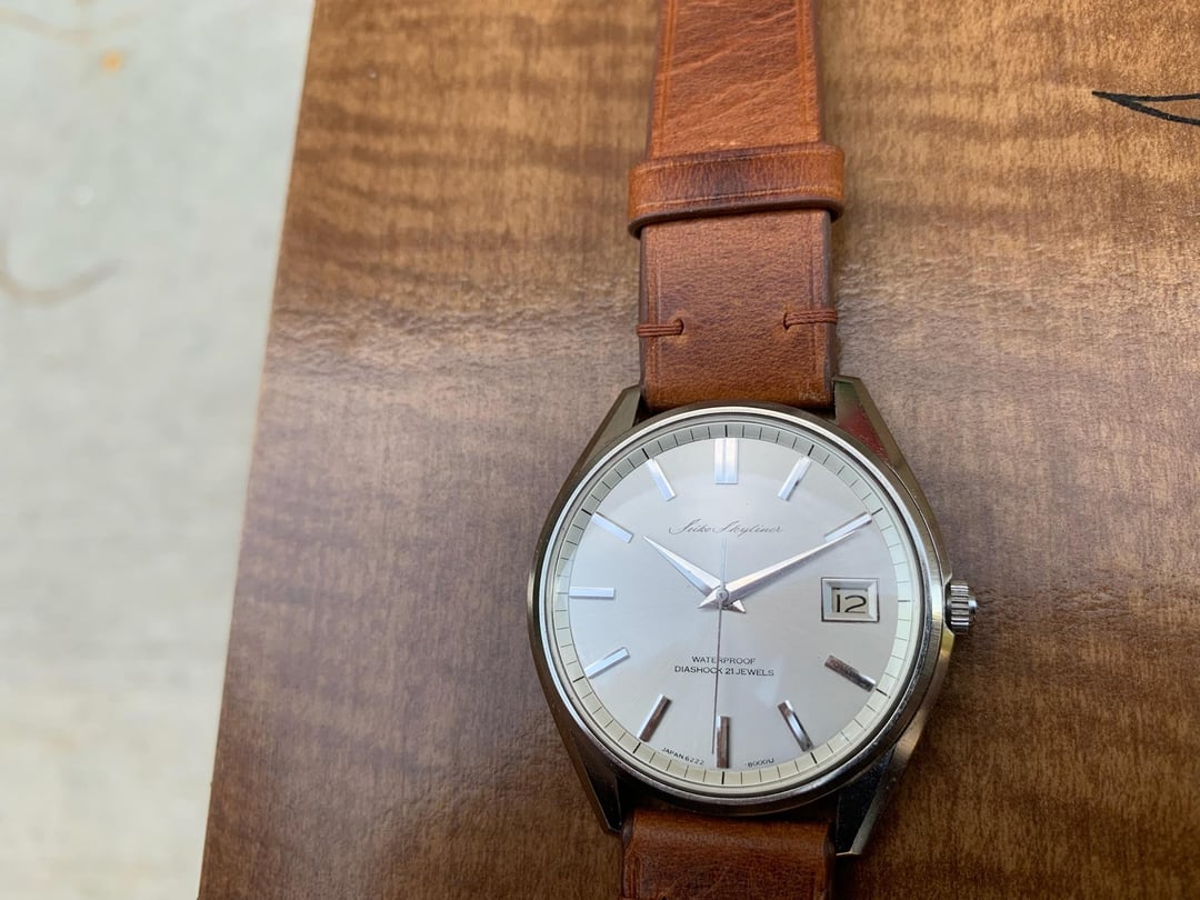 **Model:** 1968 Seiko Skyliner 6222-8000 **Album**: [https://imgur.com/a/DTiw5w8](https://imgur.com/a/DTiw5w8) **Details**: **Condition:** Immaculate. Literally looks brand new. Case is clean and sharp, unpolished and retains all sharp edges. Dial is clean and presents as silver (pictures look white). See the picture of the caseback—these are usually worn down, but this one is sharp like new. **Movement**: manual wind, Seiko 6222 **Strap:** Badalassi Carlo ‘Waxy’, from Istiz Leather **Dimensions:** \- Case width: 38 mm \- Lug to Lug: 43 mm \- Case Thickness: 10.2 mm \- Lug Width: 18 mm **Price:** Priced at **$299**, free shipping (CONUS only) PM with any questions. Thanks for looking.