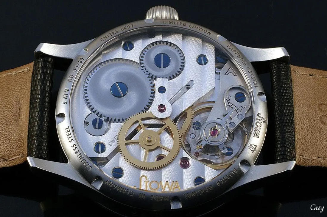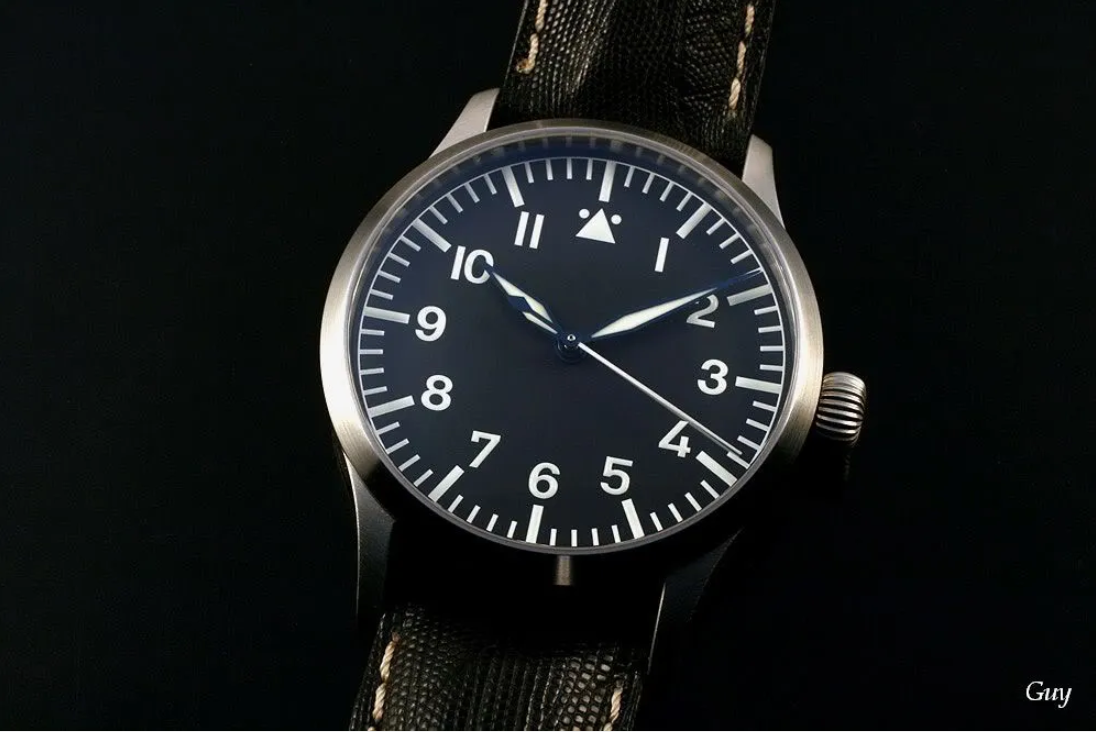Il s'agit ici de la Flieger STOWA mouvement manuel avec un boitier en acier massif brossé en 3 pièces 41mm verre saphir avec antireflets, (boitier de fabrication allemande (Fricker Gmbh) Pforzheim).