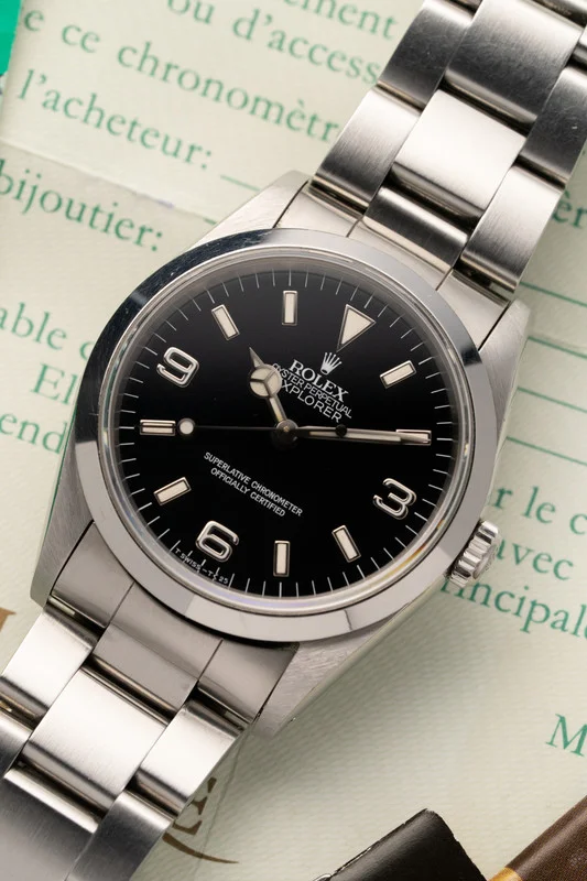 This example remains in unpolished condition, preserving its original factory lines and crisp case geometry. It comes as a super full set, including its original box, punched papers, booklets, and tags - an increasingly rare find for an early X-series Explorer.