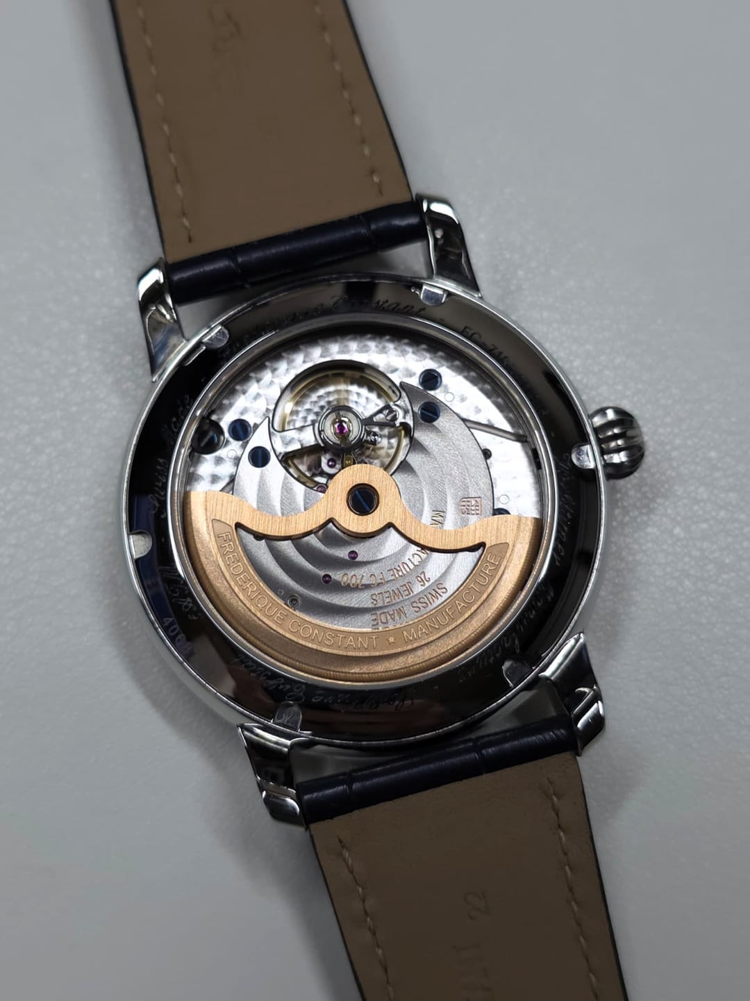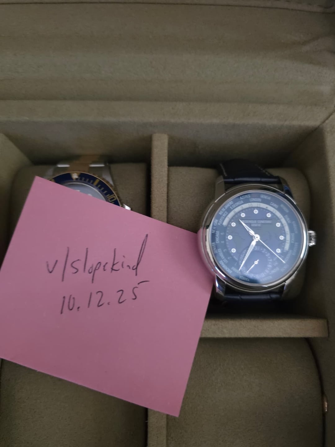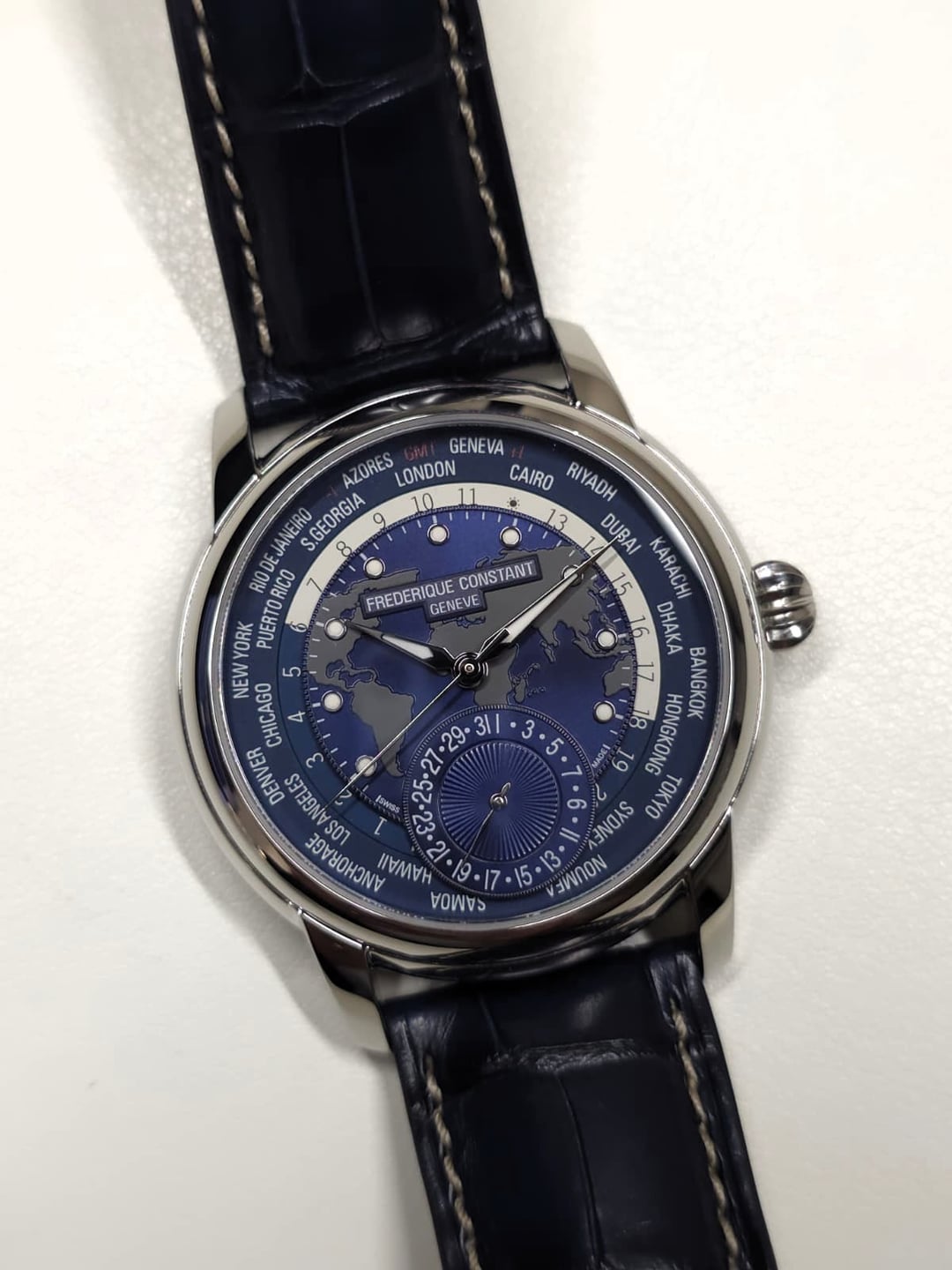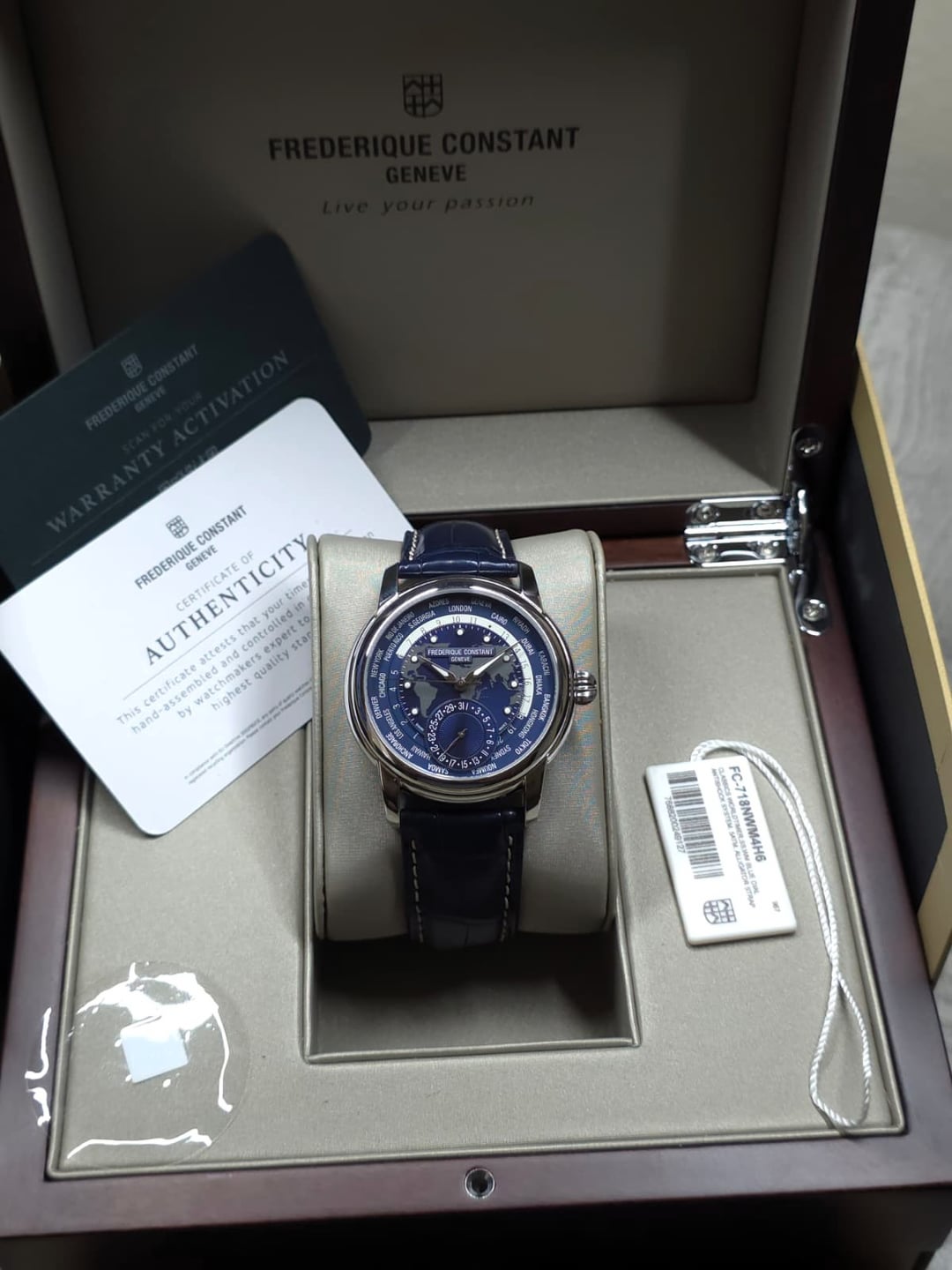 **Frederique Constant Classics Worldtimer** **Ref:** FC-718NWM4H6 This watch is in excellent condition with only very light wear showing throughout. It features a beautiful navy blue world map dial with silver accents and applied hour markers. The in-house FC-718 automatic movement powers both time and world time functions, visible through the sapphire exhibition caseback. The watch comes **complete with its double box, warranty card, and serial tag**. * 42mm stainless steel case * In-house FC-718 automatic movement * World time function with day/night indicator * Sapphire crystal front and back * Blue alligator leather strap with deployant clasp A great value in Swiss watchmaking with true manufacture pedigree and travel-ready functionality. Price - $2250 shipped Pics & Timestamp = [https://imgur.com/a/p6Bj896](https://imgur.com/a/p6Bj896) IG = watchfornia Cheers, Adam